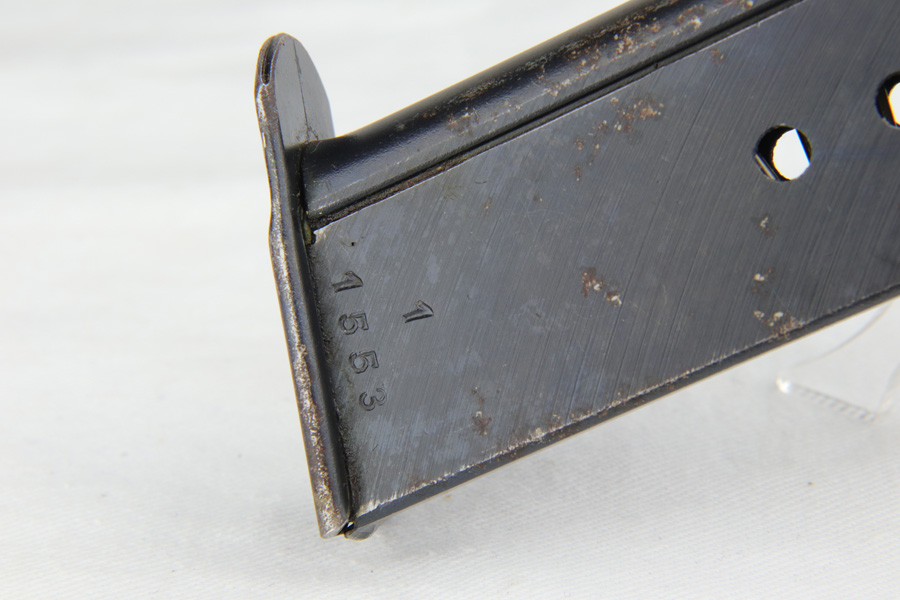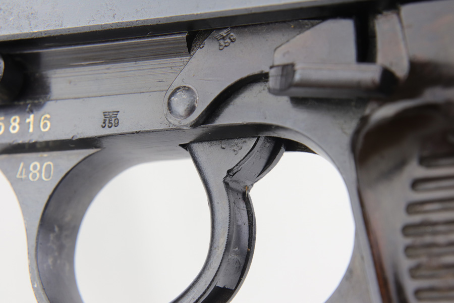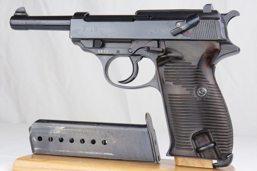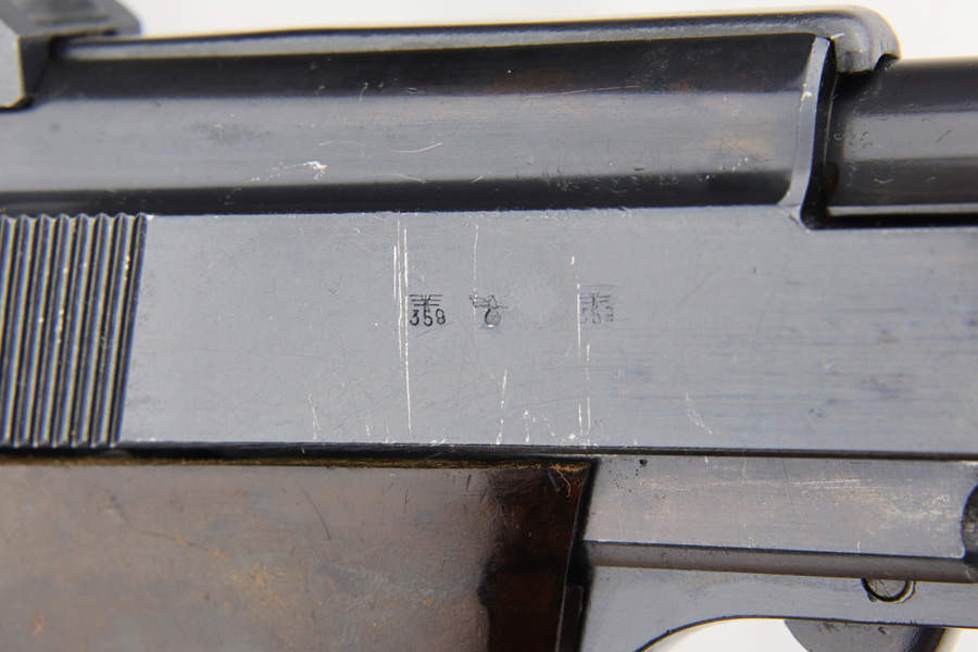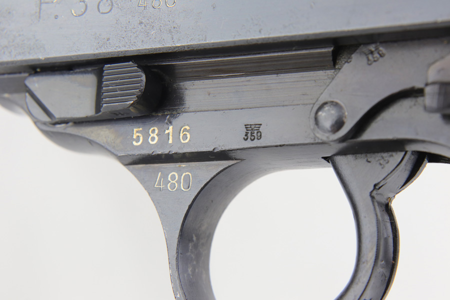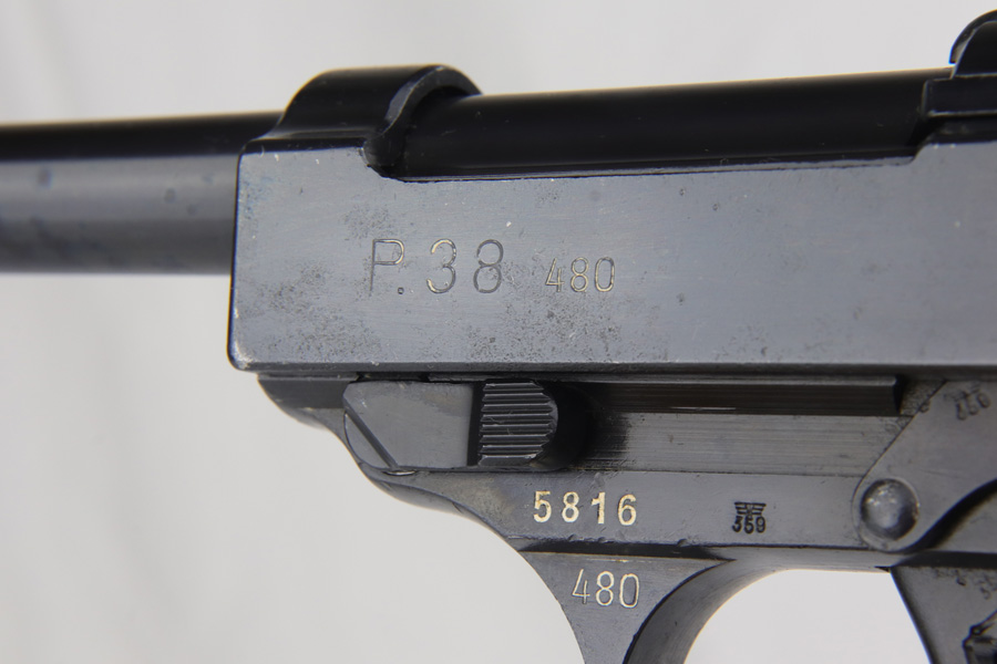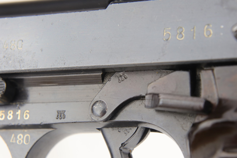 12/31/18 – This is an original early production Walther P.38 “480 Code”. The 480 Code P.38 was the early military production of P.38 pistols. There were roughly 7200 made in 1940 according to Whittington’s book. This pistol is all original and matching, except for the finish which is a post-war refinish. The pistol still shows some light pitting underneath the finish in a few areas – see photos. Slide, frame, barrel and locking block are all matching. Small parts are eagle/359 proofed. The magazine is not waffen proofed, but has machine markings and could potentially be WW2 era, we aren’t sure – the side of the magazine is serial numbered. The bore has some patina and light wear throughout, but rifling is in tact. 7 out of 10 overall (for the bore). The right grip panel is eagle/359 proof stamped, but the left is not. Guaranteed original and fully functional (except the finish).