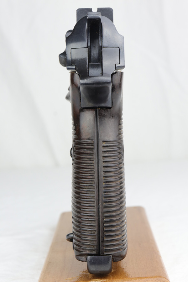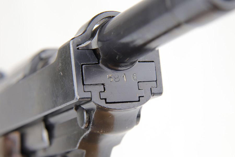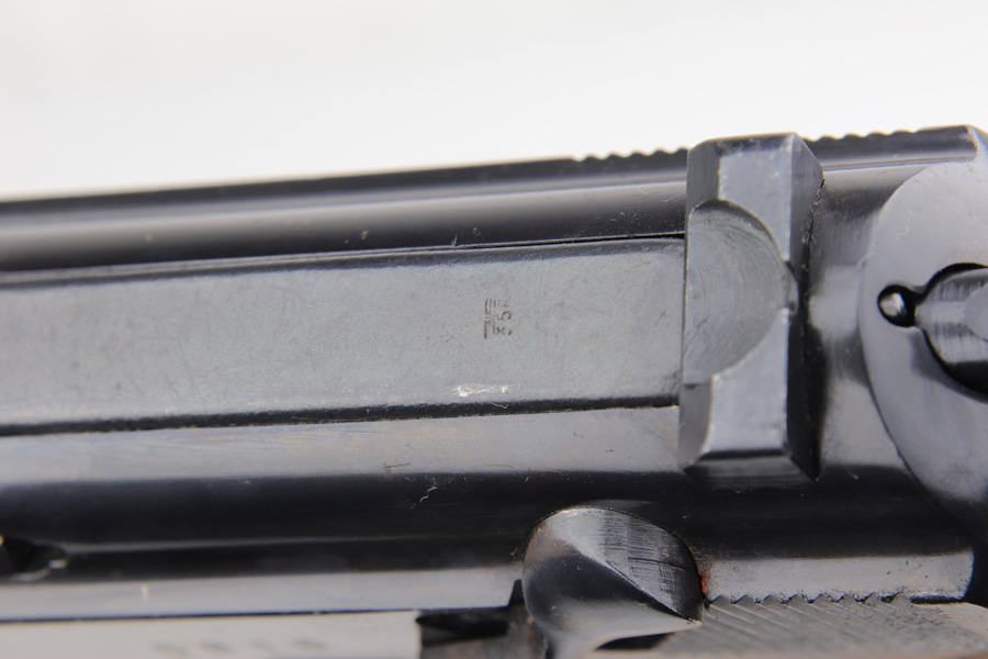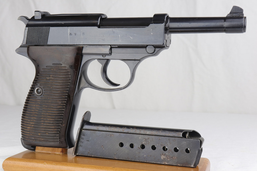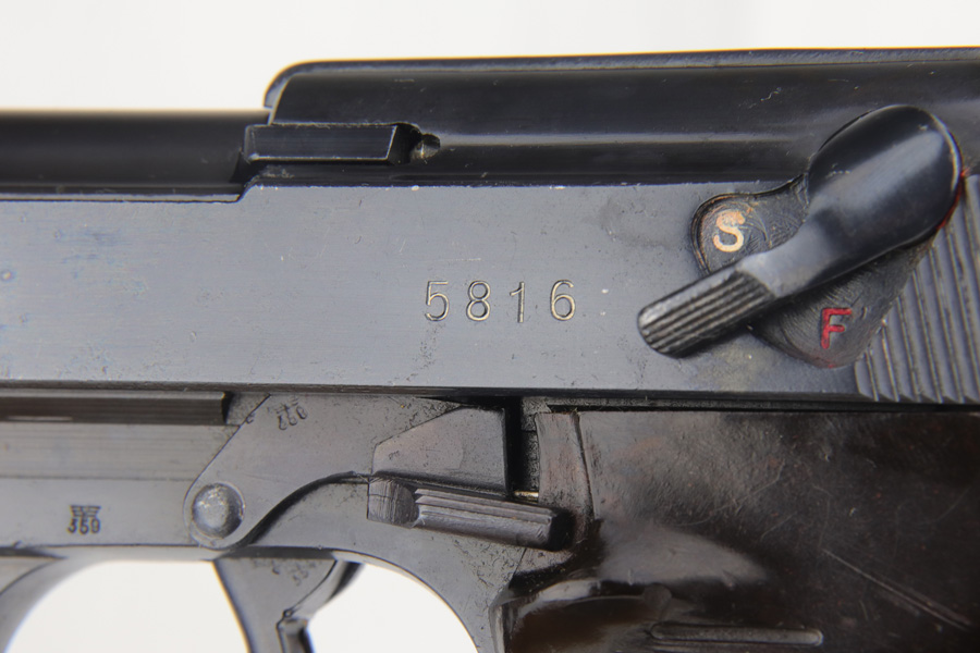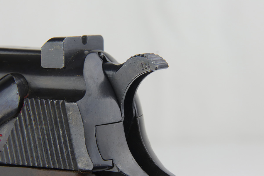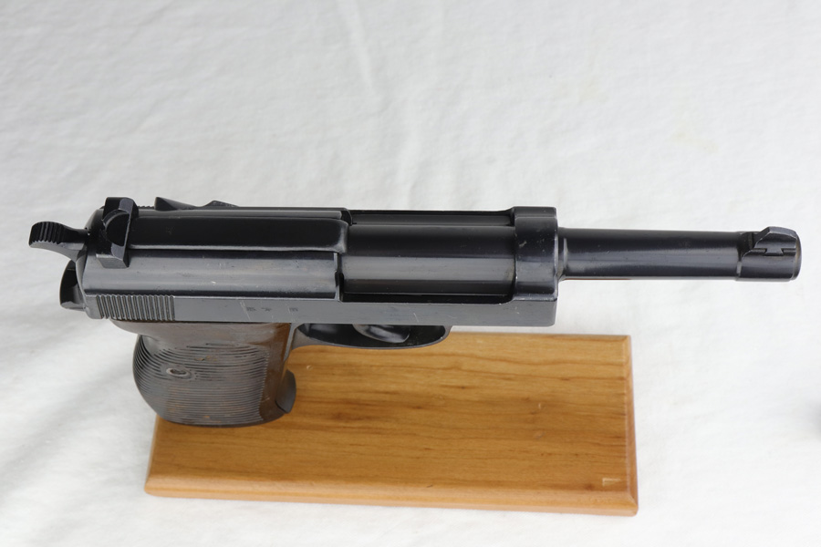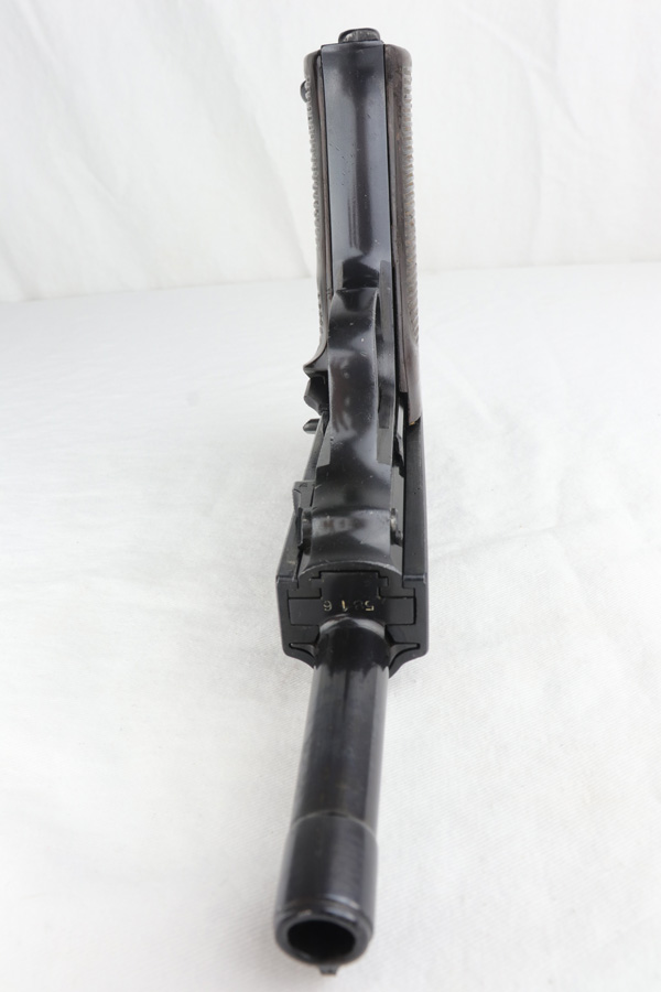 12/31/18 – This is an original early production Walther P.38 “480 Code”. The 480 Code P.38 was the early military production of P.38 pistols. There were roughly 7200 made in 1940 according to Whittington’s book. This pistol is all original and matching, except for the finish which is a post-war refinish. The pistol still shows some light pitting underneath the finish in a few areas – see photos. Slide, frame, barrel and locking block are all matching. Small parts are eagle/359 proofed. The magazine is not waffen proofed, but has machine markings and could potentially be WW2 era, we aren’t sure – the side of the magazine is serial numbered. The bore has some patina and light wear throughout, but rifling is in tact. 7 out of 10 overall (for the bore). The right grip panel is eagle/359 proof stamped, but the left is not. Guaranteed original and fully functional (except the finish).