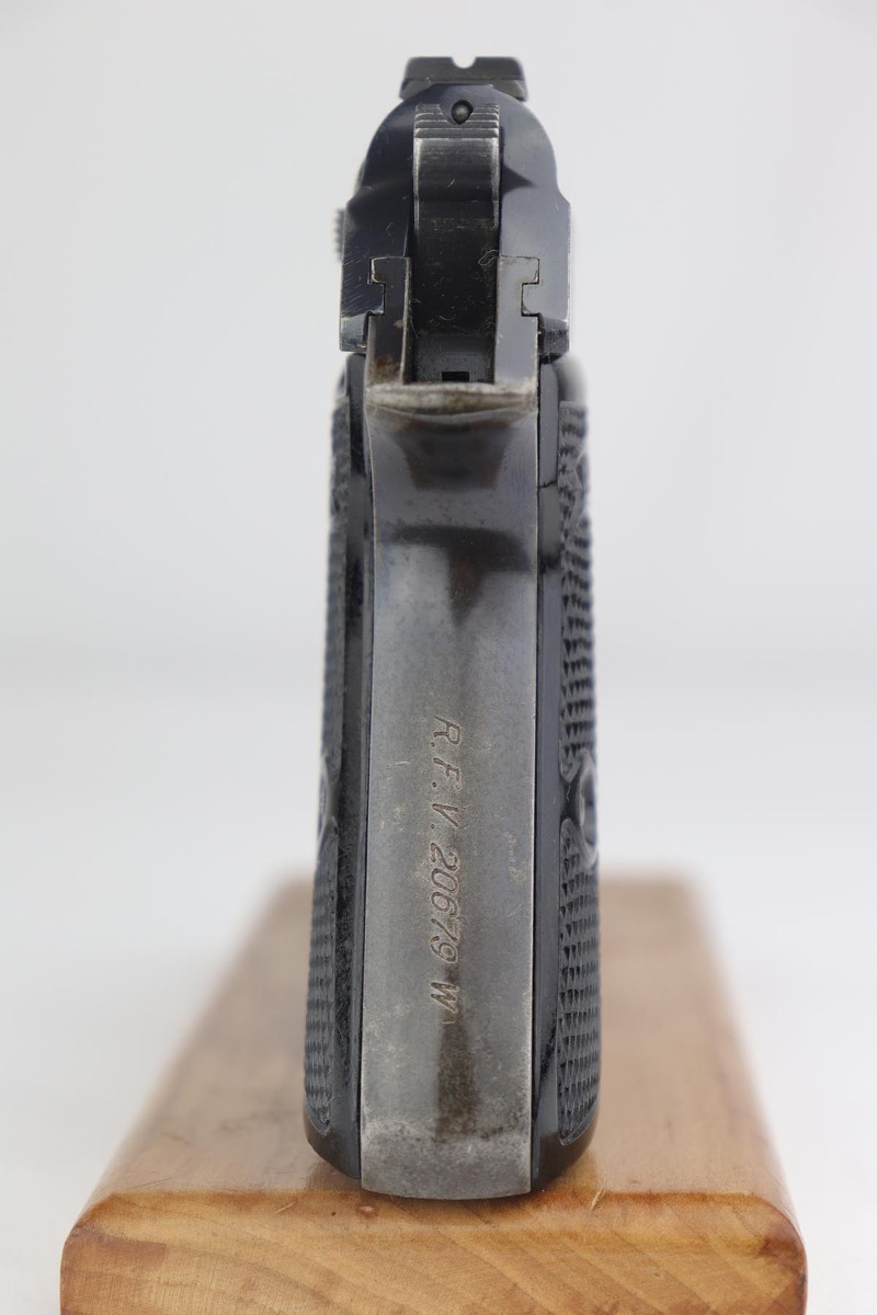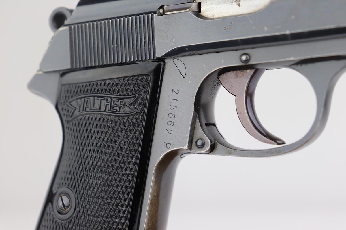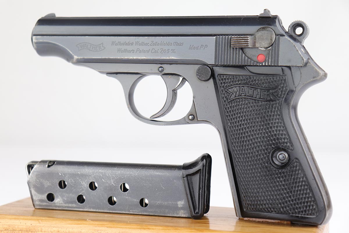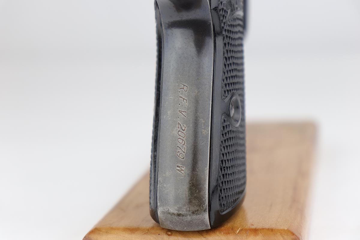 8/29/19 – This is a scarce Walther PP that is RFV marked on the front strap, denoting issue to the Reich’s Financial Administration. It is marked ‘R.F.V. 20679 W’. The pistol is matching and original with about 85%-90% high-polish blue remaining. The profile view is generally very nice, but the profiles show thinning/patina throughout. Serial dates the gun to about 1941. Excellent grips. Nice finger extension magazine, though there is a small crack on both sides.