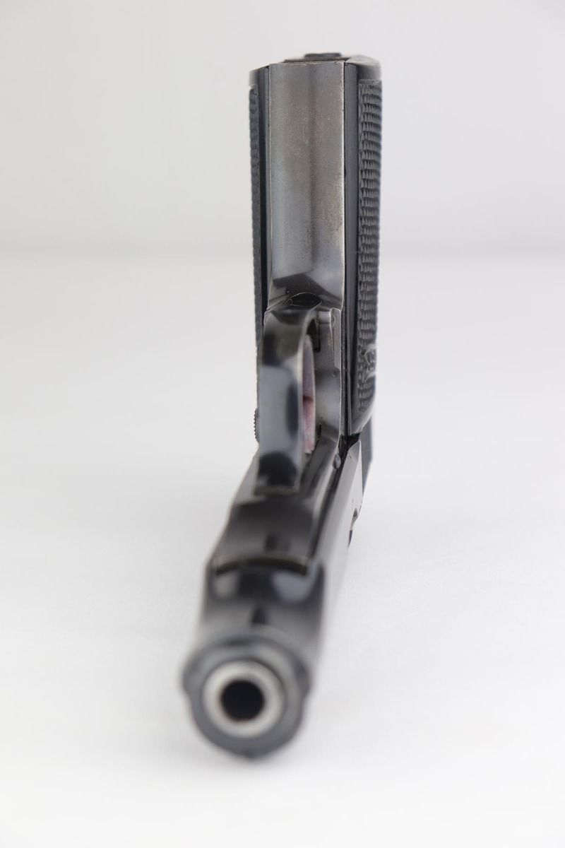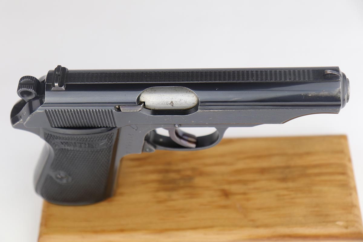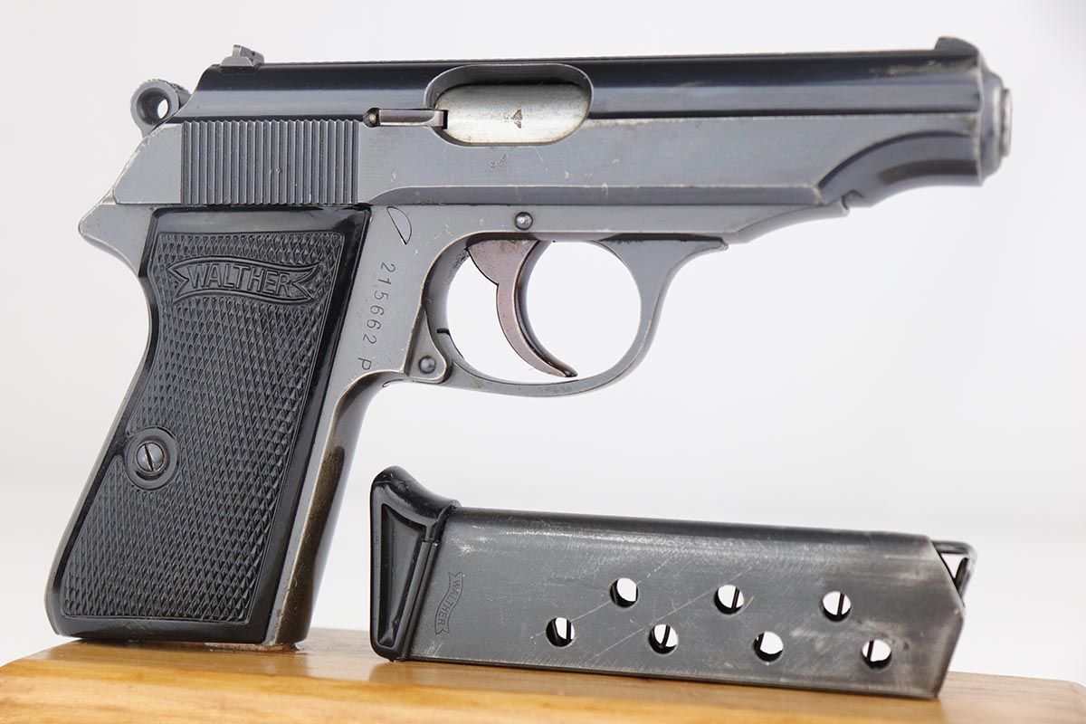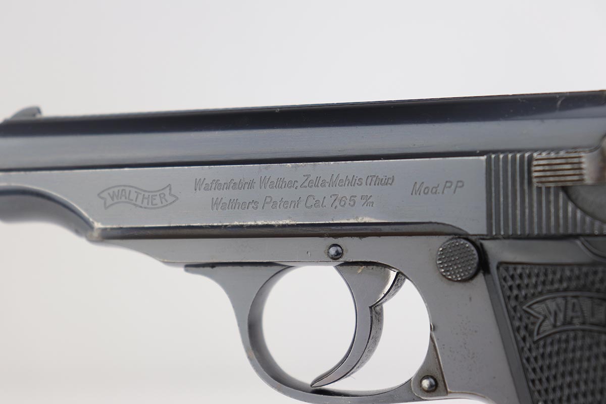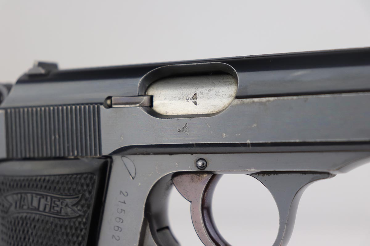 8/29/19 – This is a scarce Walther PP that is RFV marked on the front strap, denoting issue to the Reich’s Financial Administration. It is marked ‘R.F.V. 20679 W’. The pistol is matching and original with about 85%-90% high-polish blue remaining. The profile view is generally very nice, but the profiles show thinning/patina throughout. Serial dates the gun to about 1941. Excellent grips. Nice finger extension magazine, though there is a small crack on both sides.