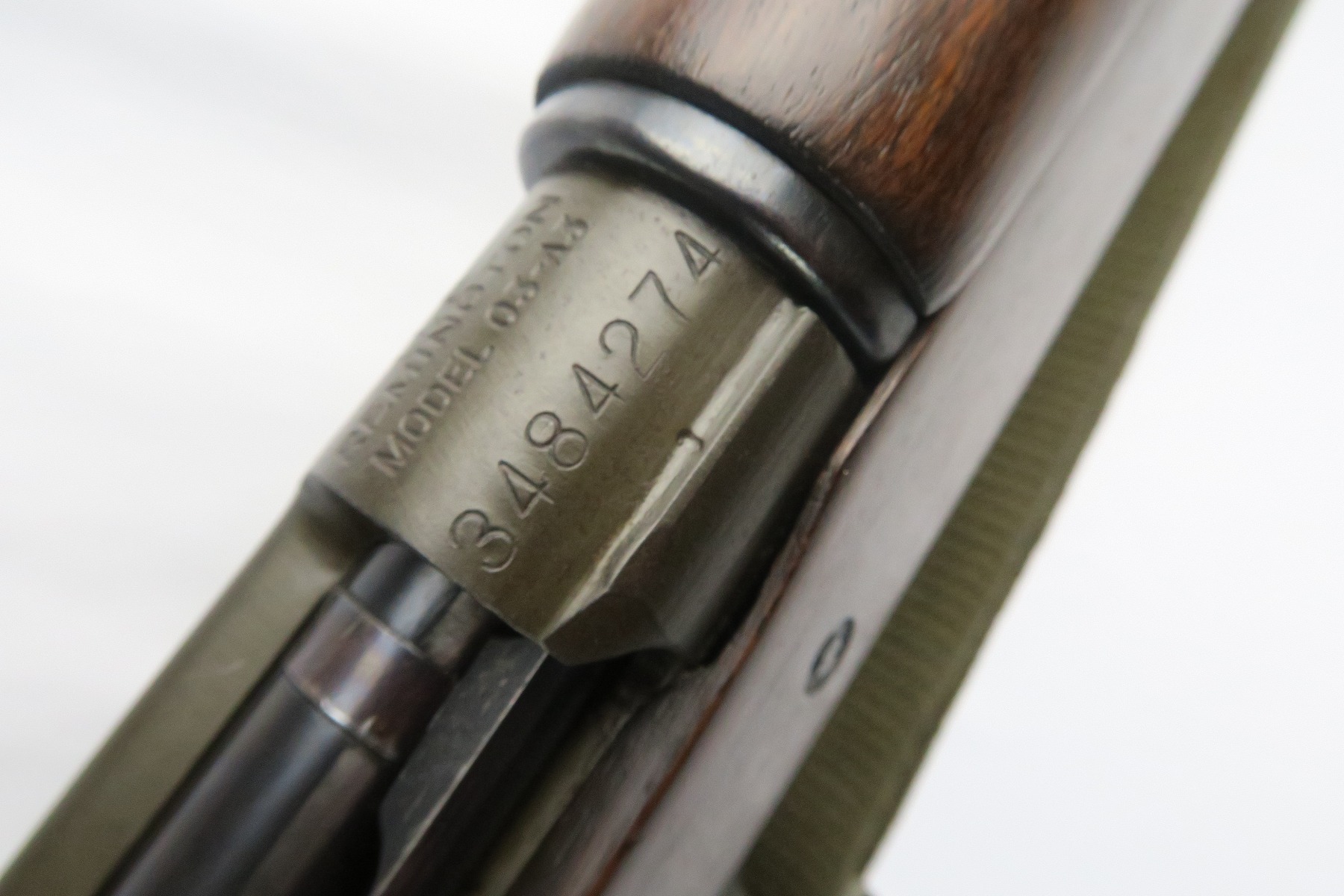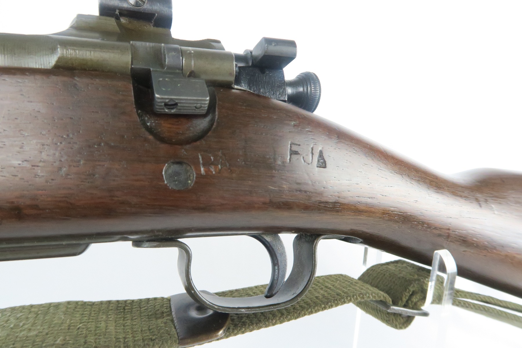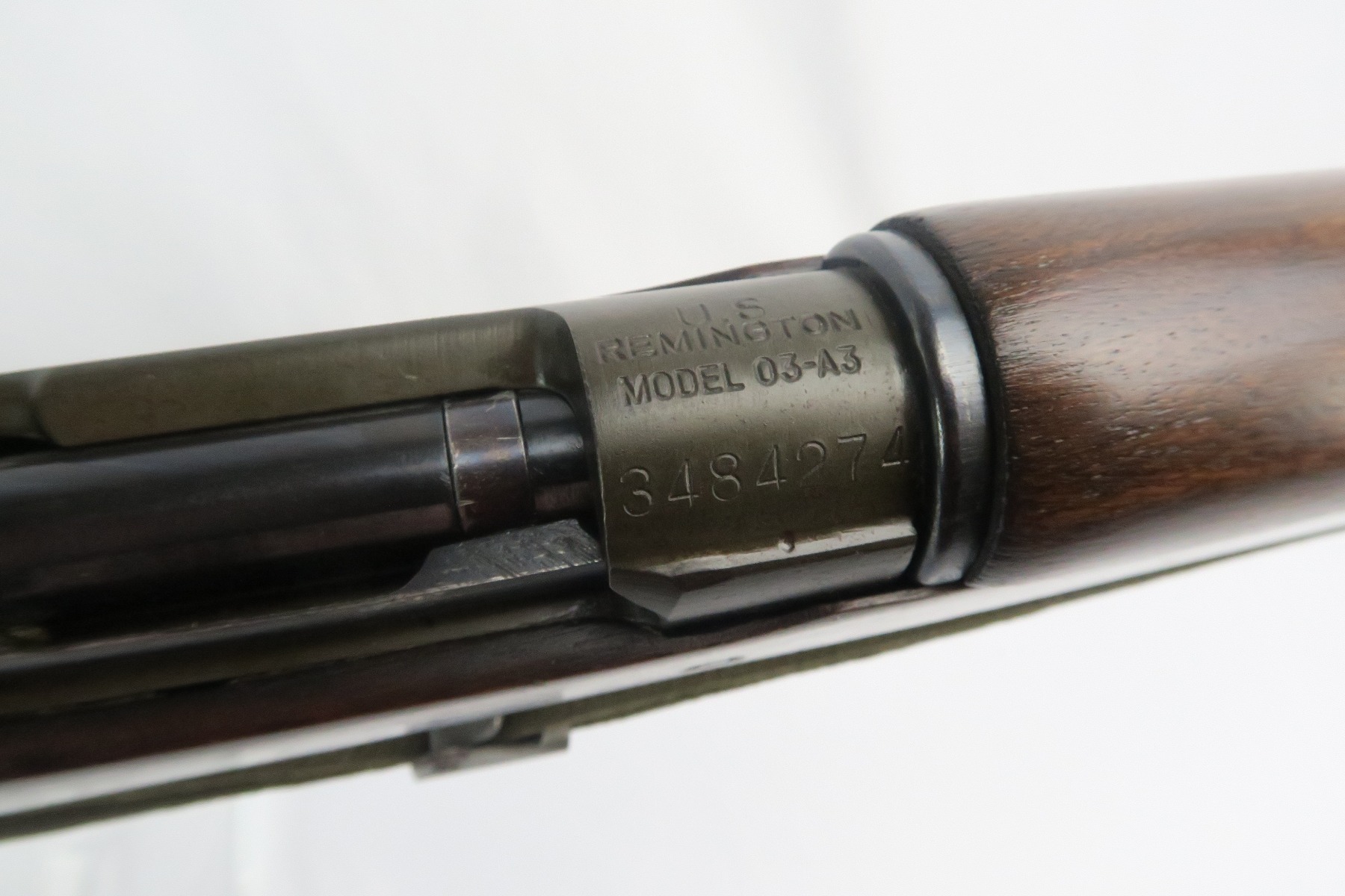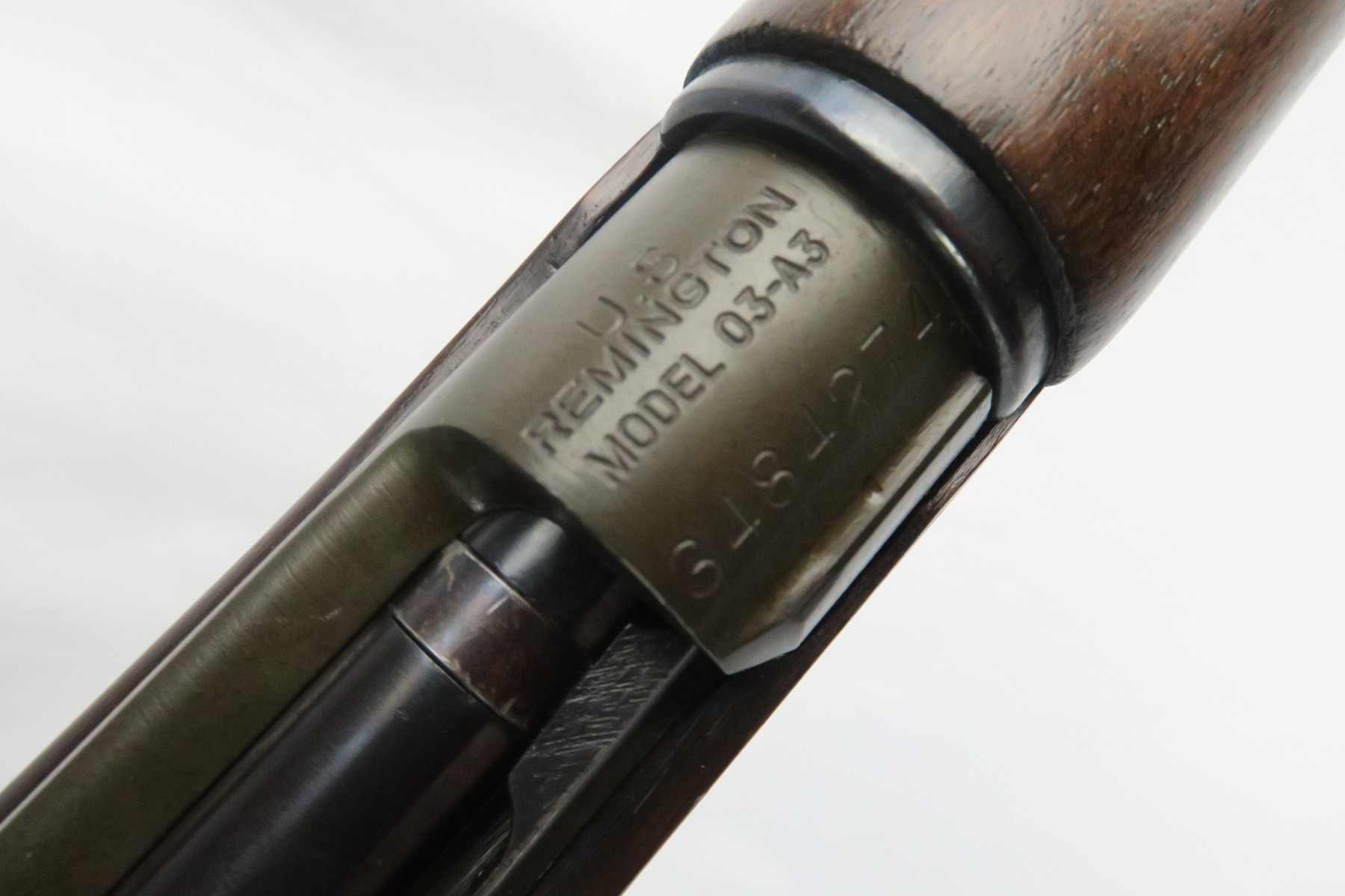 1/2/18 – This is an excellent, all original WW2 production Remington model 1903-A3 bolt action rifle. The barrel is 1943 dated with an ordnance stamp and Remington Arsenal stamp. The stock and receiver are also properly Remington Arsenal stamped. The stock is additionally inspector “FJA” proof stamped. The stock does appear to possibly have a light cartouche stamp in between the “RA” and “FJA” on the stock. This is most likely due to some raising of the wood over time, accompanied with a weaker original stamp. The stock is completely correct and original to the gun. The underside is P proofed and has various small inspector proofs as well. The metal is excellent on this rifle, with most of the wear being light patina or a few brown spots on the phosphated receiver. The barrel is excellent and the bore is a 9/10 with some minimal patina within the rifling. The strap is period correct but unmarked. Guaranteed original and authentic.