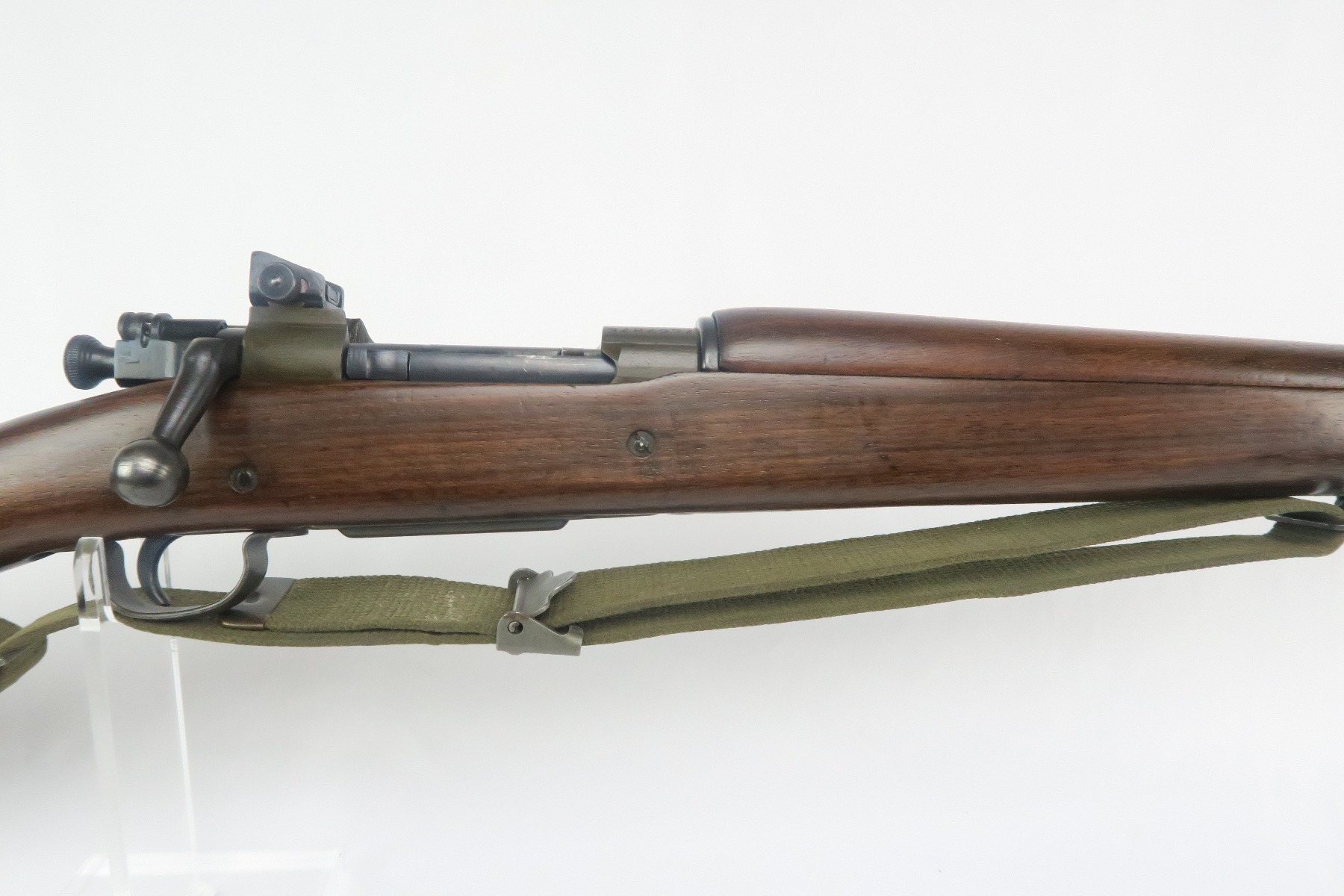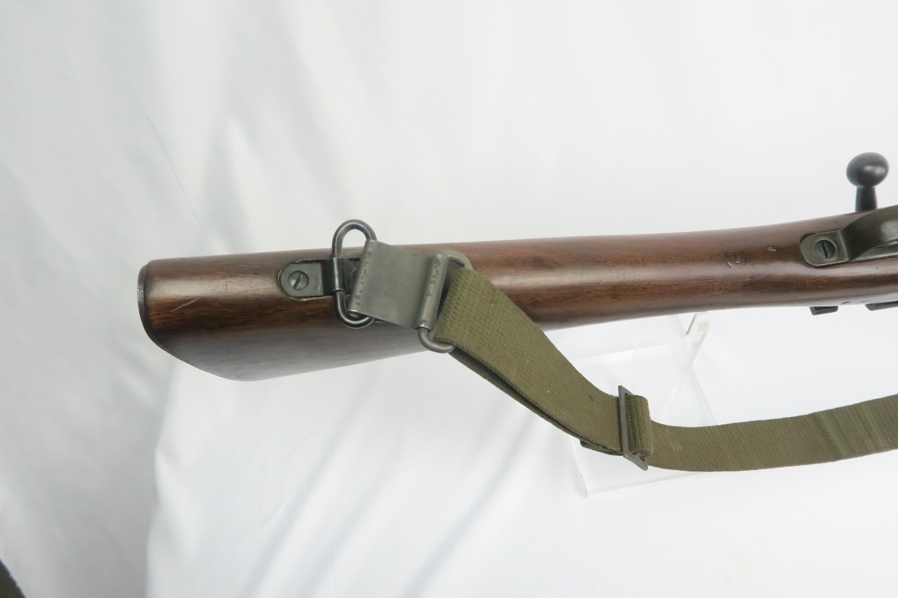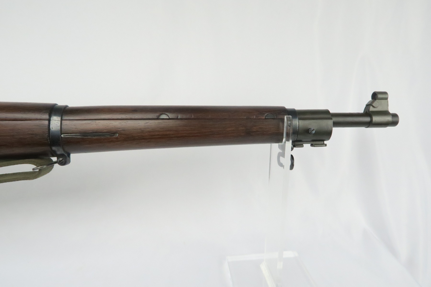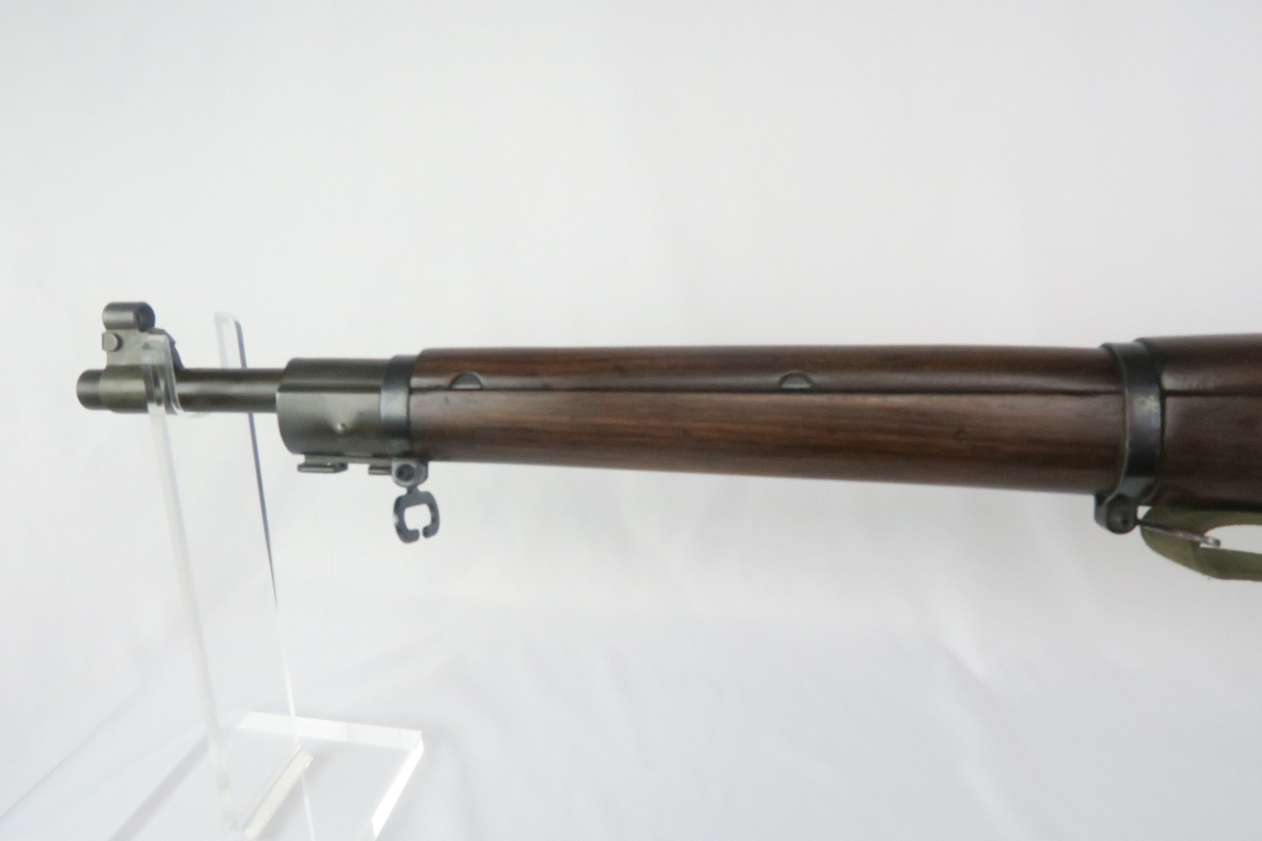 1/2/18 – This is an excellent, all original WW2 production Remington model 1903-A3 bolt action rifle. The barrel is 1943 dated with an ordnance stamp and Remington Arsenal stamp. The stock and receiver are also properly Remington Arsenal stamped. The stock is additionally inspector “FJA” proof stamped. The stock does appear to possibly have a light cartouche stamp in between the “RA” and “FJA” on the stock. This is most likely due to some raising of the wood over time, accompanied with a weaker original stamp. The stock is completely correct and original to the gun. The underside is P proofed and has various small inspector proofs as well. The metal is excellent on this rifle, with most of the wear being light patina or a few brown spots on the phosphated receiver. The barrel is excellent and the bore is a 9/10 with some minimal patina within the rifling. The strap is period correct but unmarked. Guaranteed original and authentic.