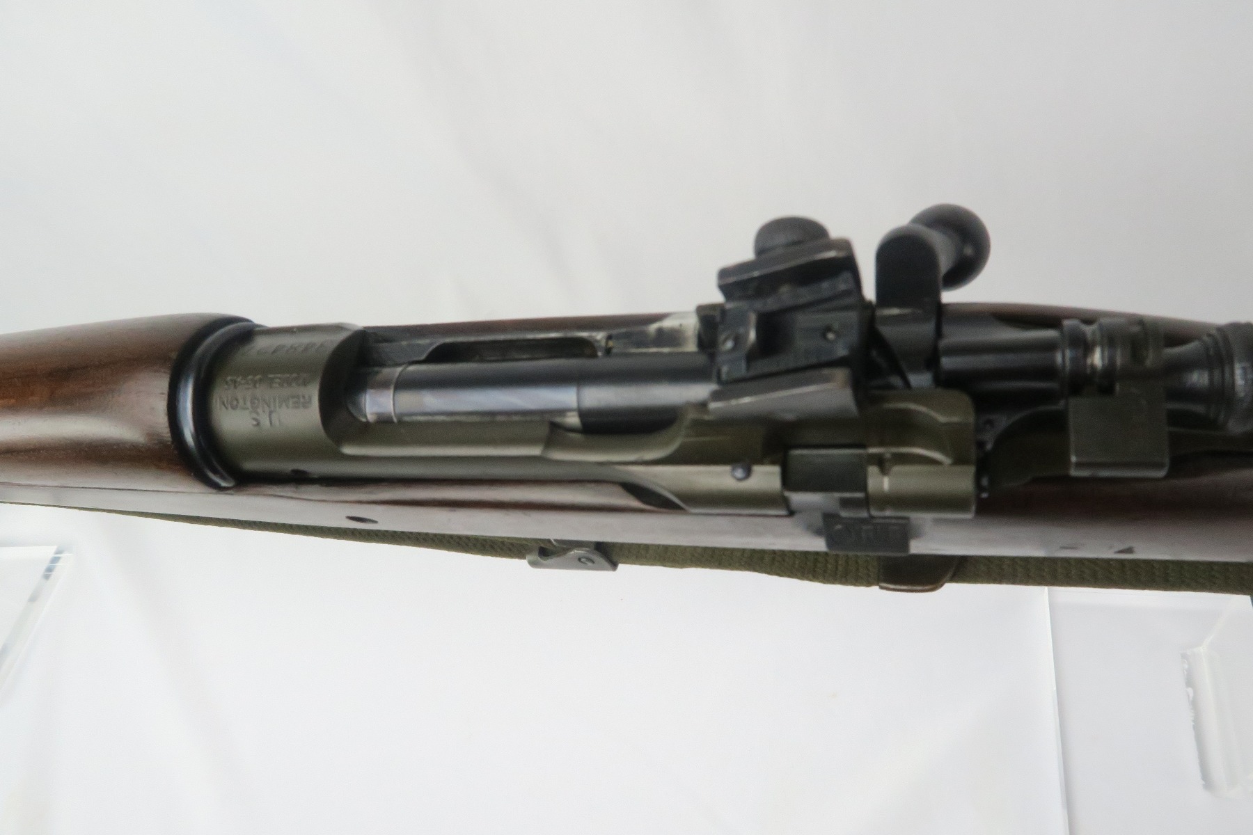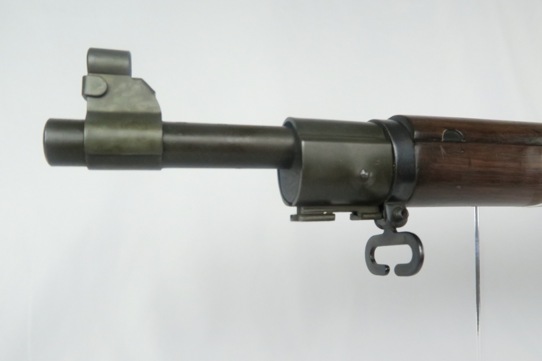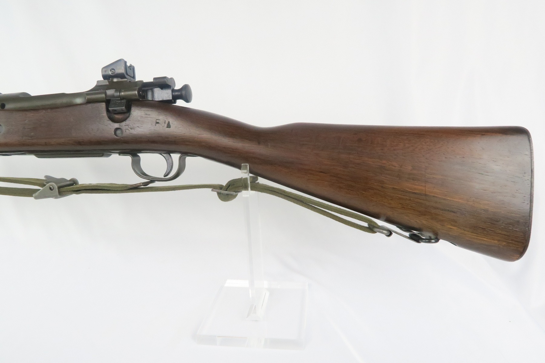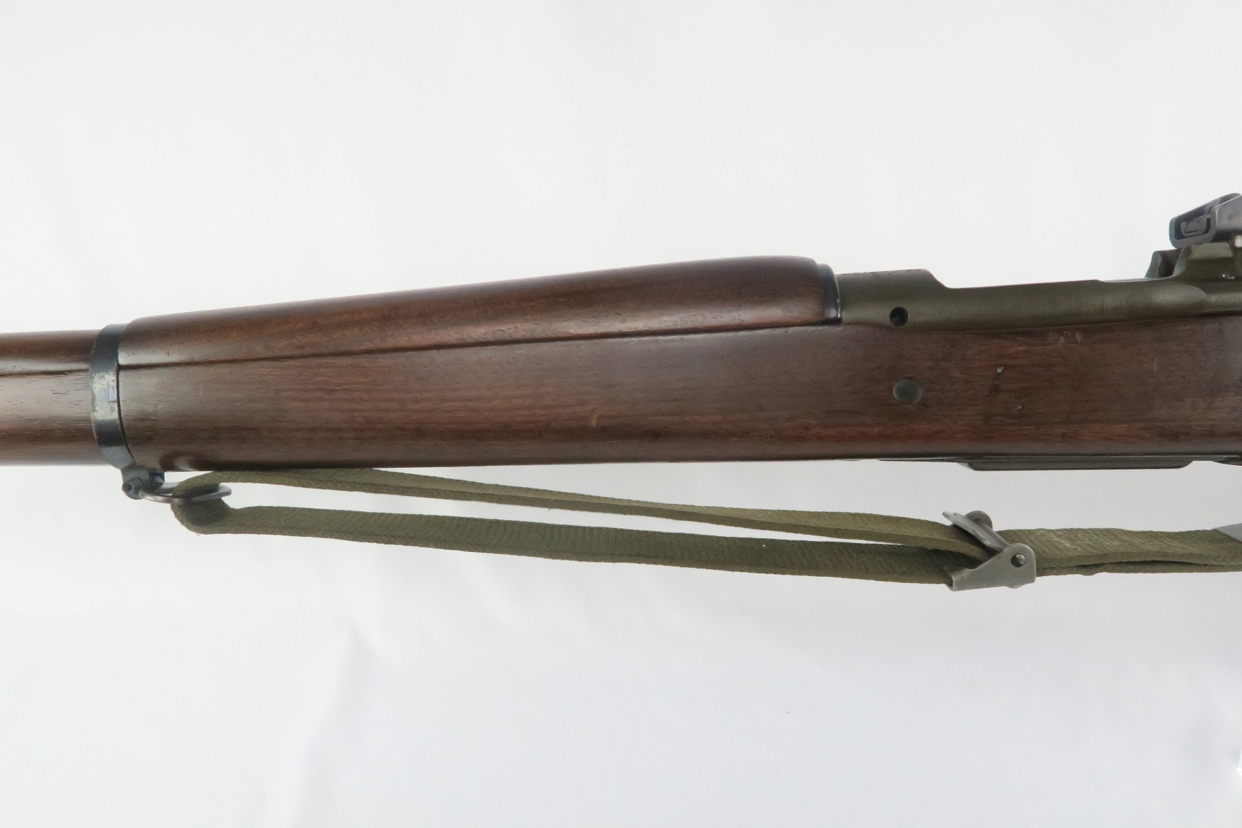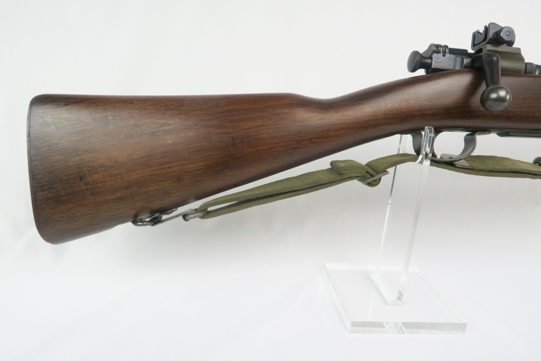 1/2/18 – This is an excellent, all original WW2 production Remington model 1903-A3 bolt action rifle. The barrel is 1943 dated with an ordnance stamp and Remington Arsenal stamp. The stock and receiver are also properly Remington Arsenal stamped. The stock is additionally inspector “FJA” proof stamped. The stock does appear to possibly have a light cartouche stamp in between the “RA” and “FJA” on the stock. This is most likely due to some raising of the wood over time, accompanied with a weaker original stamp. The stock is completely correct and original to the gun. The underside is P proofed and has various small inspector proofs as well. The metal is excellent on this rifle, with most of the wear being light patina or a few brown spots on the phosphated receiver. The barrel is excellent and the bore is a 9/10 with some minimal patina within the rifling. The strap is period correct but unmarked. Guaranteed original and authentic.