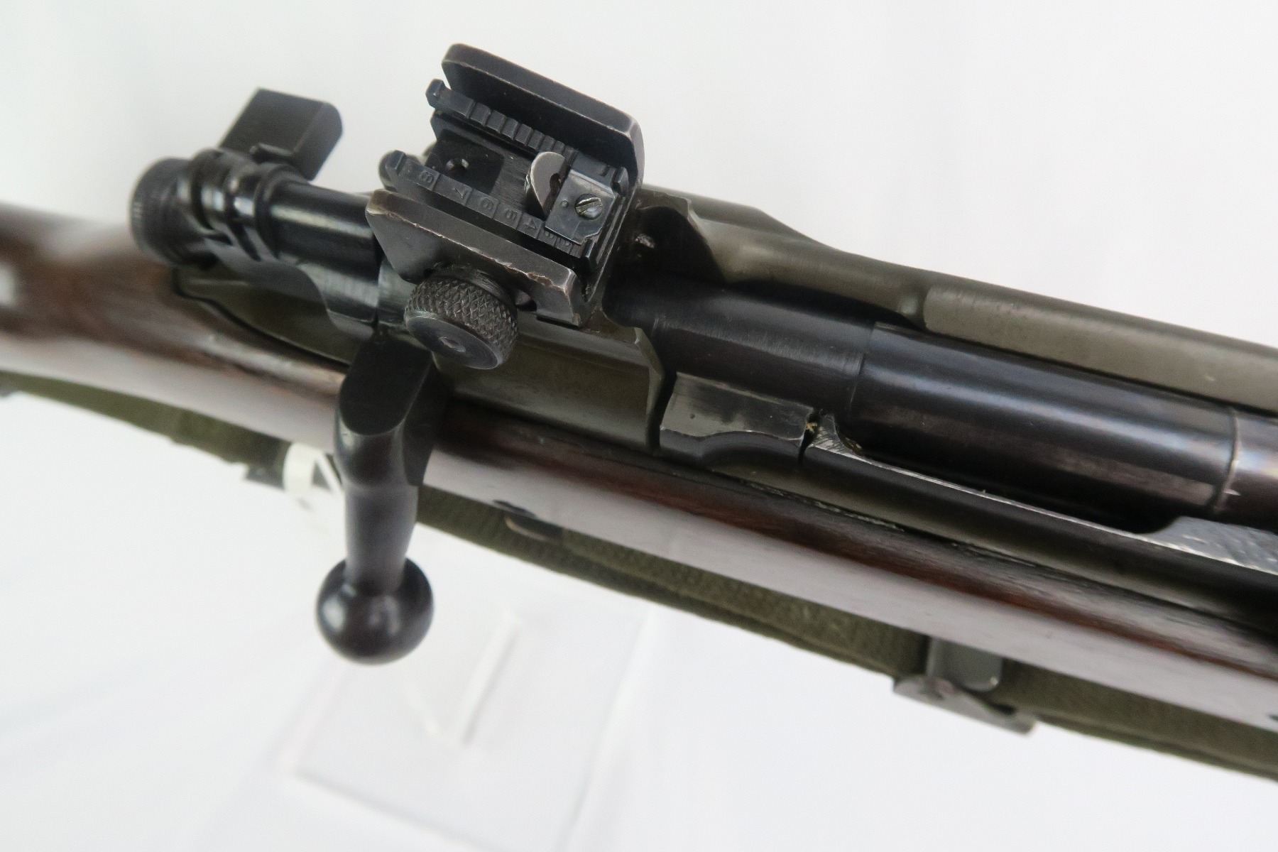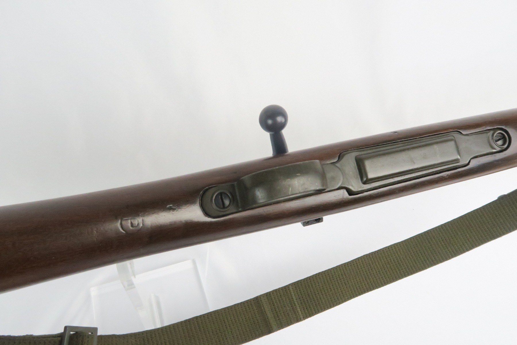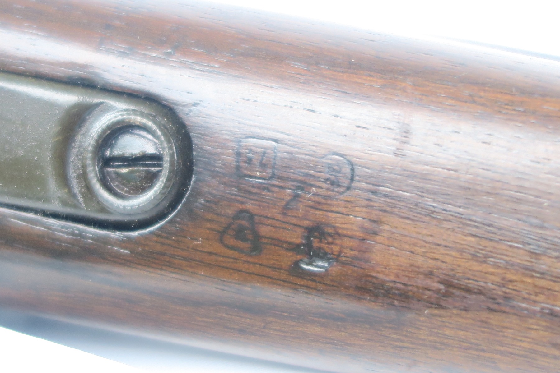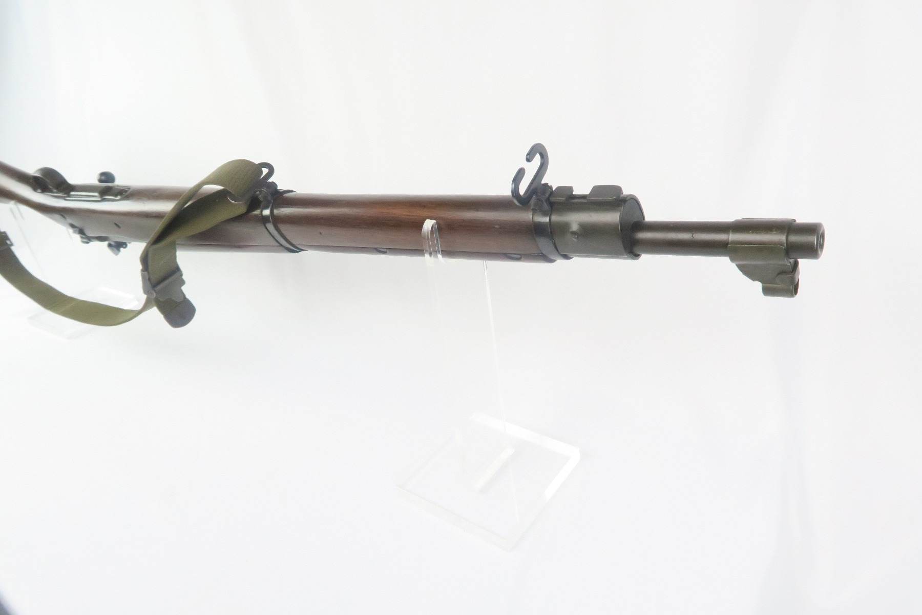 1/2/18 – This is an excellent, all original WW2 production Remington model 1903-A3 bolt action rifle. The barrel is 1943 dated with an ordnance stamp and Remington Arsenal stamp. The stock and receiver are also properly Remington Arsenal stamped. The stock is additionally inspector “FJA” proof stamped. The stock does appear to possibly have a light cartouche stamp in between the “RA” and “FJA” on the stock. This is most likely due to some raising of the wood over time, accompanied with a weaker original stamp. The stock is completely correct and original to the gun. The underside is P proofed and has various small inspector proofs as well. The metal is excellent on this rifle, with most of the wear being light patina or a few brown spots on the phosphated receiver. The barrel is excellent and the bore is a 9/10 with some minimal patina within the rifling. The strap is period correct but unmarked. Guaranteed original and authentic.