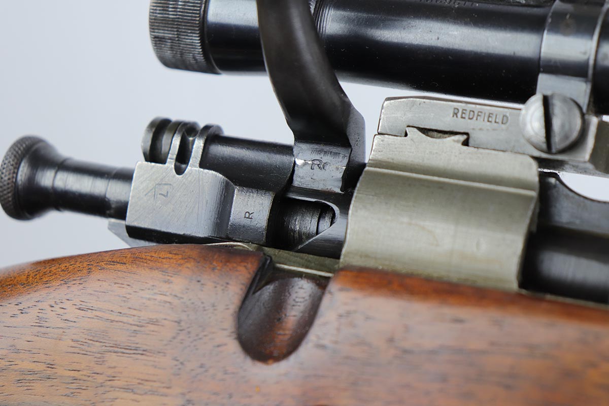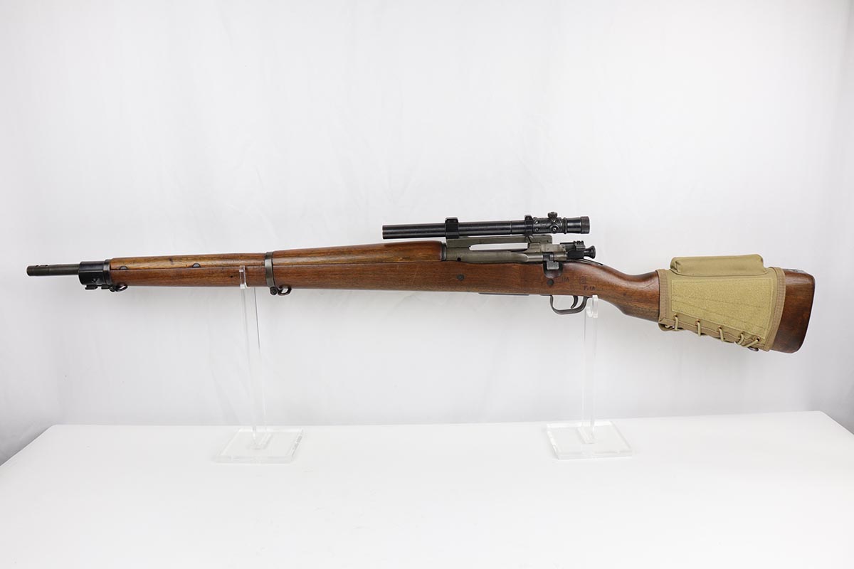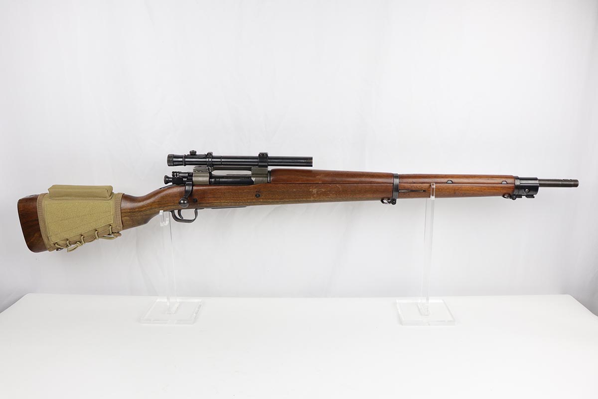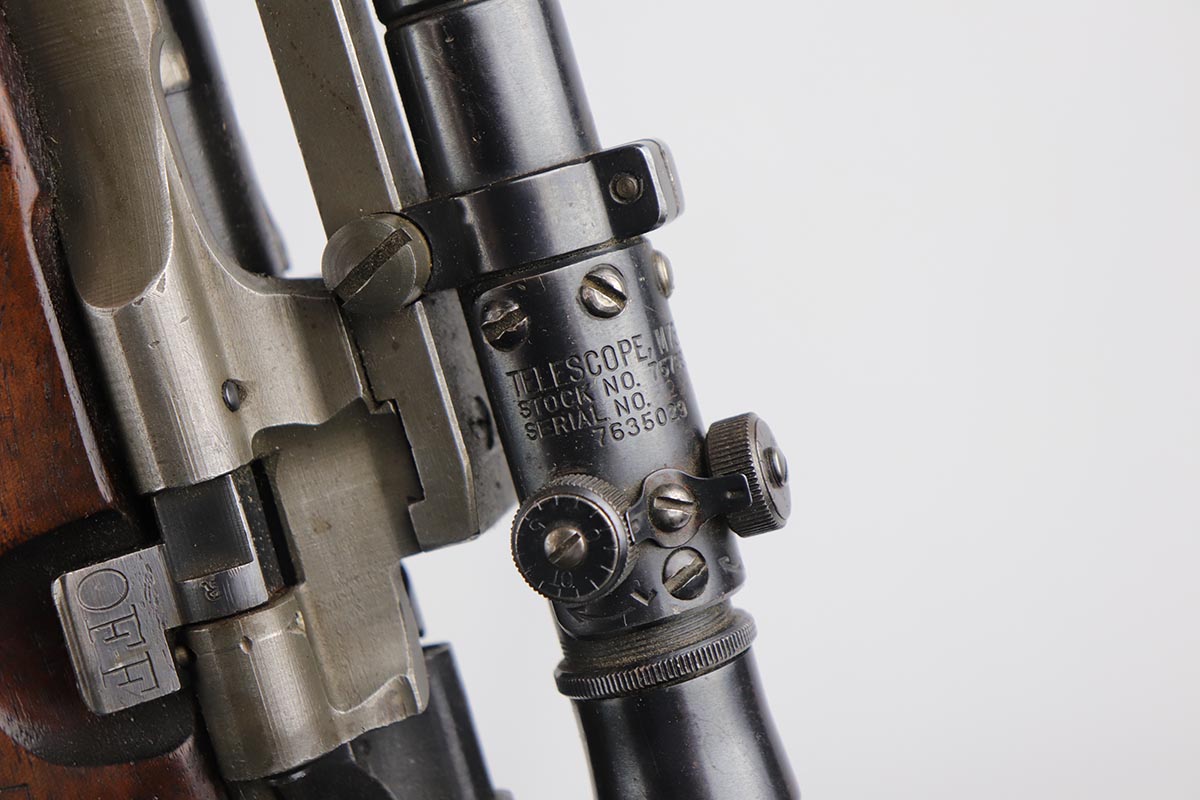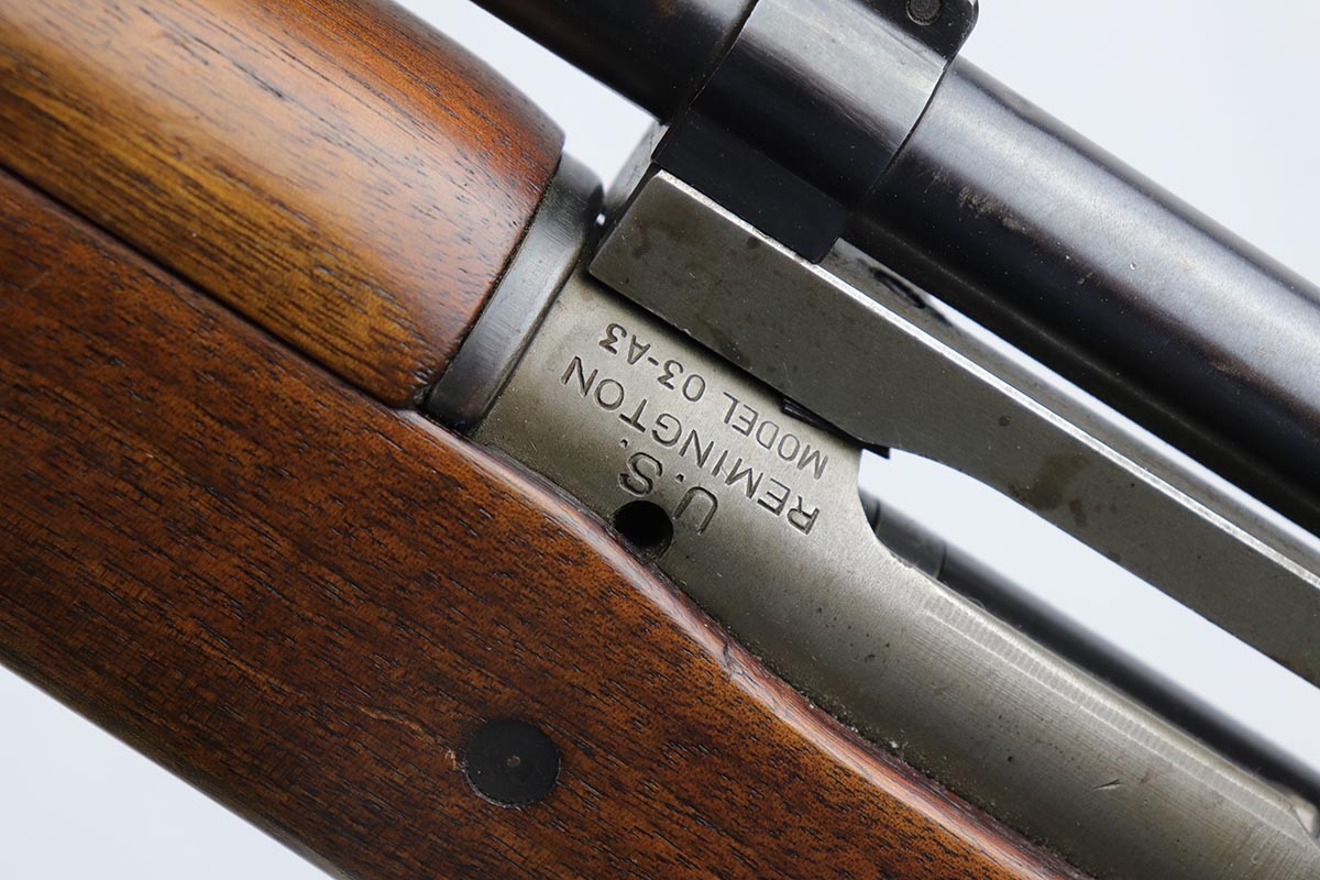 8/20/19 – This is a rare and desirable Remington Model 1903-A4 sniper rifle with scarce ‘Z-prefix’ serial. There were fewer than 3,000 such examples produced. The rifle features a Weaver M73B1 scope on a Redfield mount. The M73B1 were one of the standard optics on WWII Model 1903A4 Sniper Rifles. It has crystal clear optics. The rifle has the distinctive Model 1903A4 features which include a “Type C” pistol grip stock with bolt relief cut-out, a modified bolt handle, the rear sight is removed to accommodate the scope mount and the barrel has no front sight base or blade. Barrel is dated to September of 1943. The rifle is in good condition but the metal parts do show a general thinning of the finish. Excellent stock with sharp Remington Arms proof, as well as crossed cannon cartouche and FJA inspector mark. There is a series of dings on the right side, near the forward end of the scope, as well as a two-inch long surface crack on the forend. The barrel is the two groove style utilized on late production Model 1903A4 rifles. Strong, shiny bore.