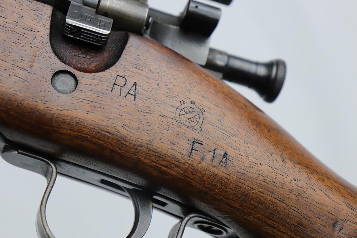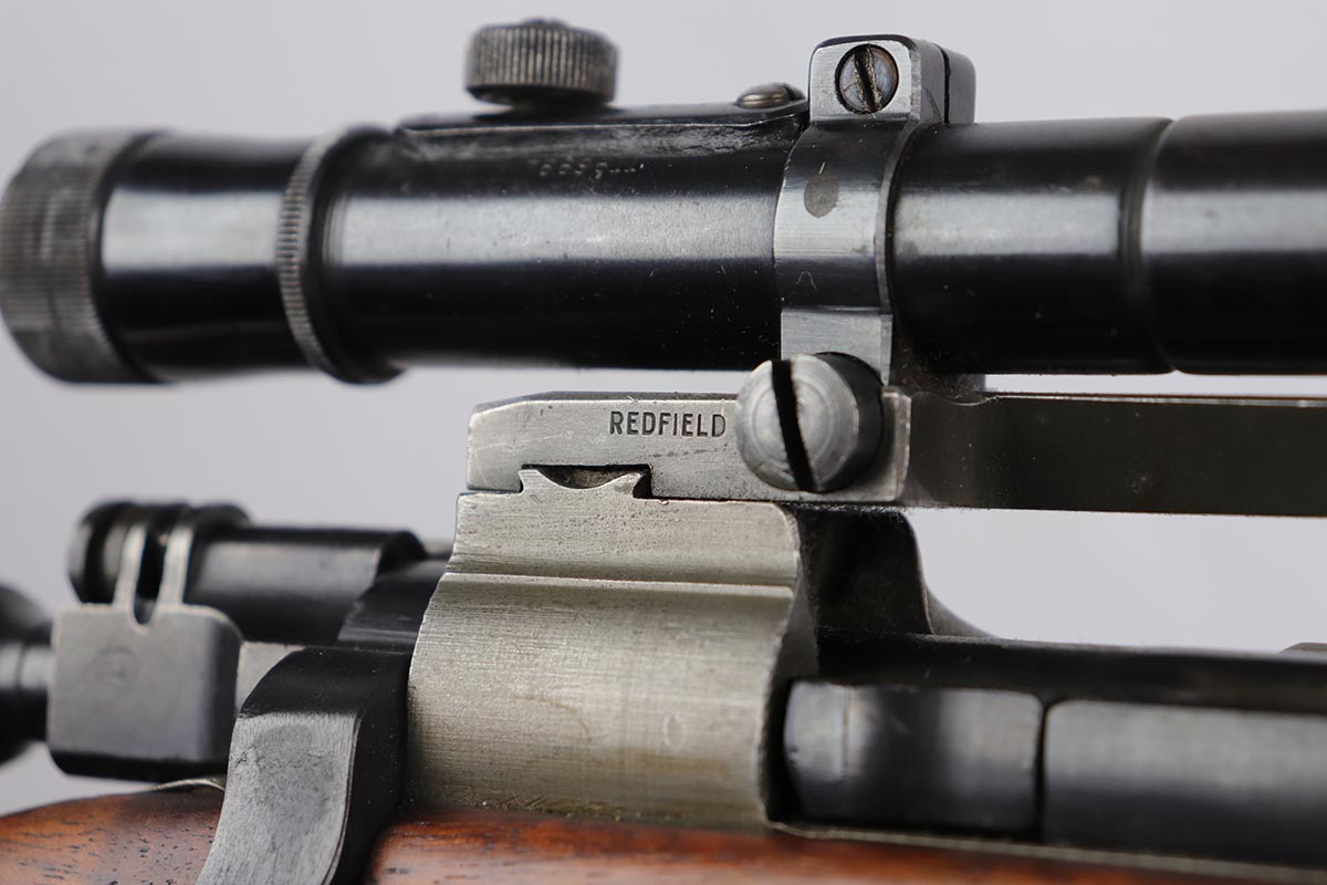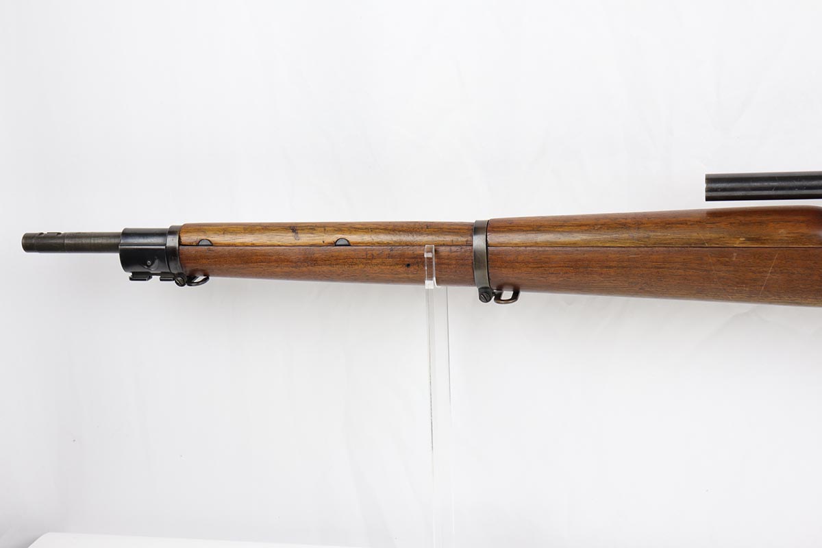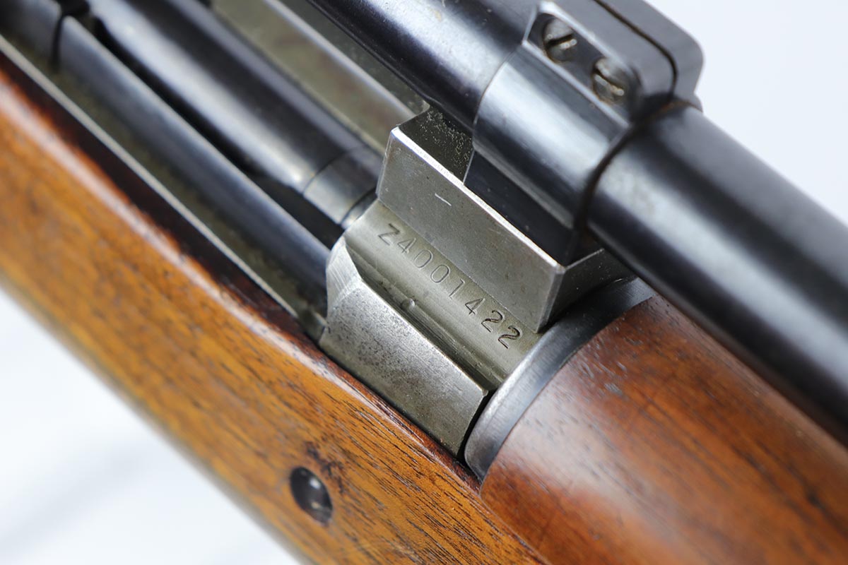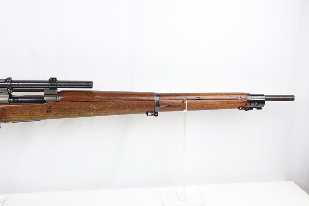 8/20/19 – This is a rare and desirable Remington Model 1903-A4 sniper rifle with scarce ‘Z-prefix’ serial. There were fewer than 3,000 such examples produced. The rifle features a Weaver M73B1 scope on a Redfield mount. The M73B1 were one of the standard optics on WWII Model 1903A4 Sniper Rifles. It has crystal clear optics. The rifle has the distinctive Model 1903A4 features which include a “Type C” pistol grip stock with bolt relief cut-out, a modified bolt handle, the rear sight is removed to accommodate the scope mount and the barrel has no front sight base or blade. Barrel is dated to September of 1943. The rifle is in good condition but the metal parts do show a general thinning of the finish. Excellent stock with sharp Remington Arms proof, as well as crossed cannon cartouche and FJA inspector mark. There is a series of dings on the right side, near the forward end of the scope, as well as a two-inch long surface crack on the forend. The barrel is the two groove style utilized on late production Model 1903A4 rifles. Strong, shiny bore.