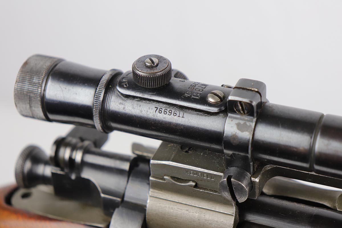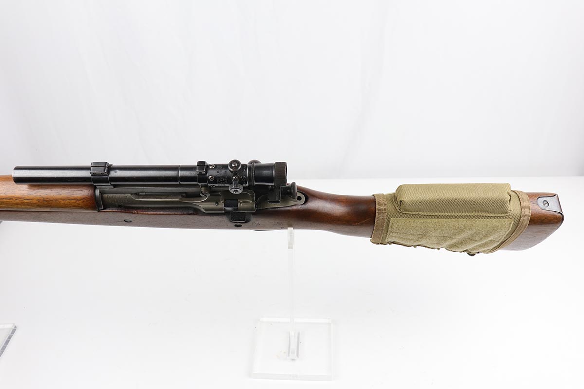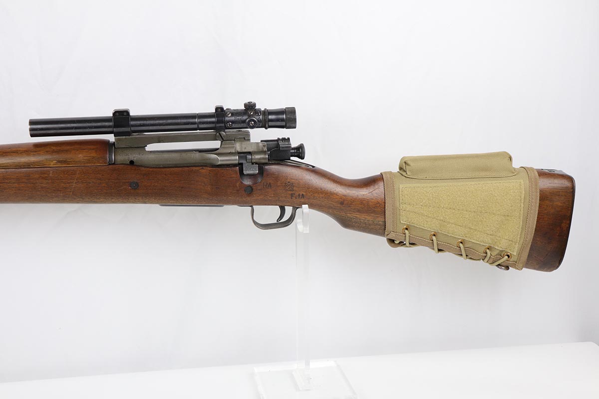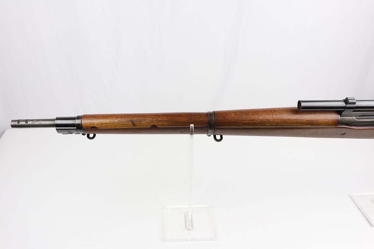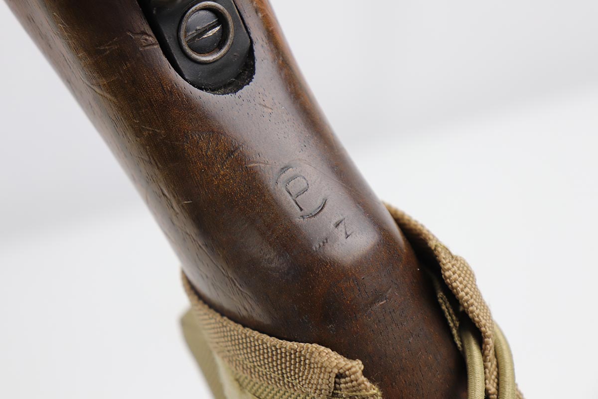 8/20/19 – This is a rare and desirable Remington Model 1903-A4 sniper rifle with scarce ‘Z-prefix’ serial. There were fewer than 3,000 such examples produced. The rifle features a Weaver M73B1 scope on a Redfield mount. The M73B1 were one of the standard optics on WWII Model 1903A4 Sniper Rifles. It has crystal clear optics. The rifle has the distinctive Model 1903A4 features which include a “Type C” pistol grip stock with bolt relief cut-out, a modified bolt handle, the rear sight is removed to accommodate the scope mount and the barrel has no front sight base or blade. Barrel is dated to September of 1943. The rifle is in good condition but the metal parts do show a general thinning of the finish. Excellent stock with sharp Remington Arms proof, as well as crossed cannon cartouche and FJA inspector mark. There is a series of dings on the right side, near the forward end of the scope, as well as a two-inch long surface crack on the forend. The barrel is the two groove style utilized on late production Model 1903A4 rifles. Strong, shiny bore.