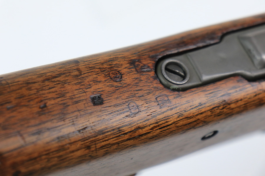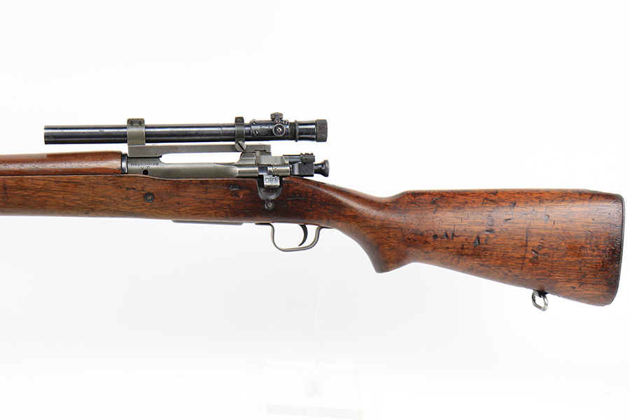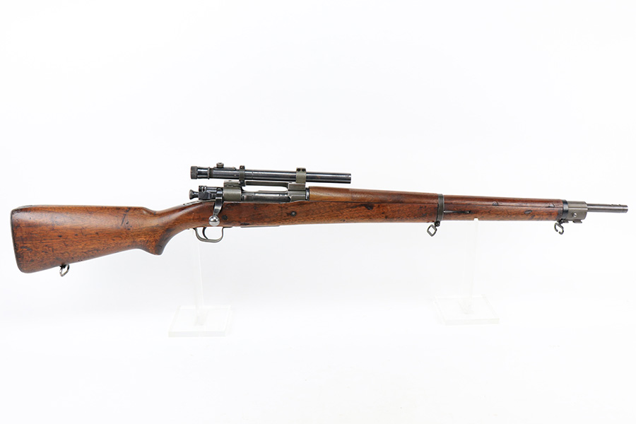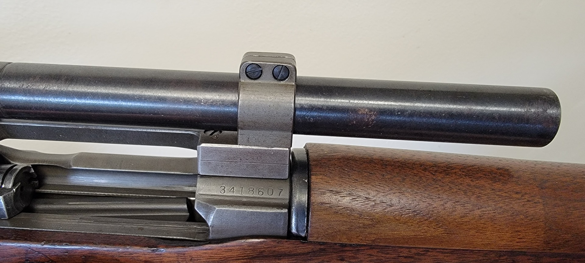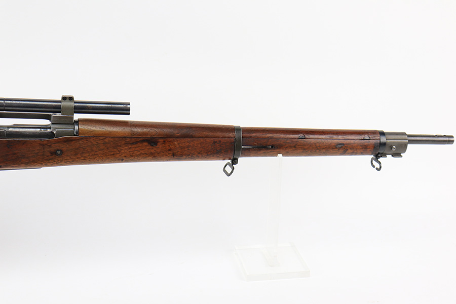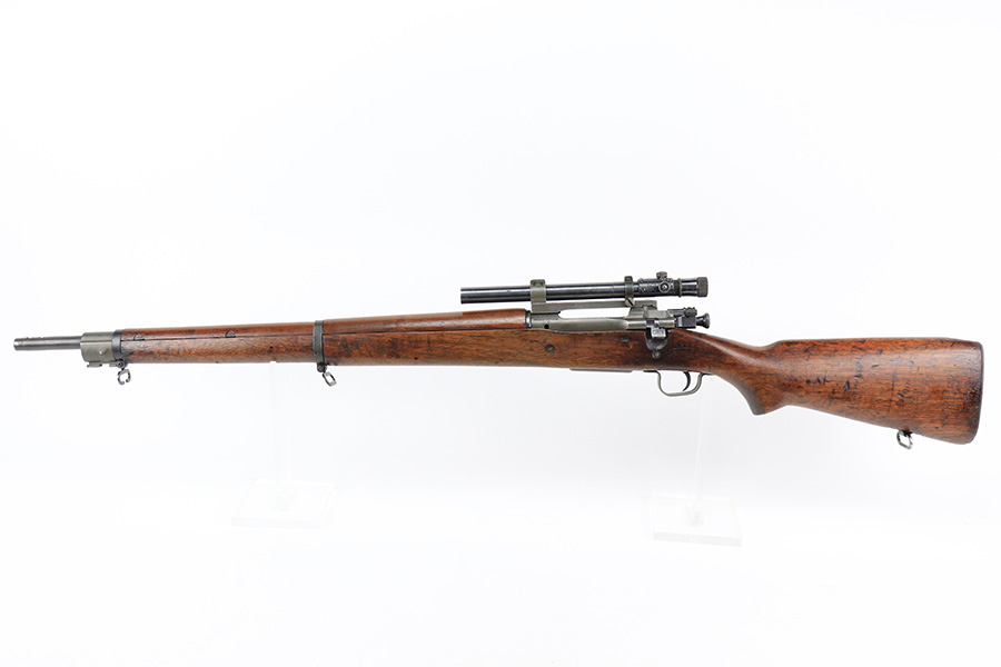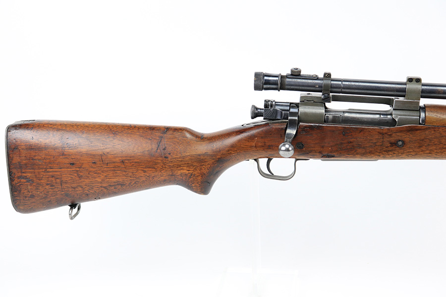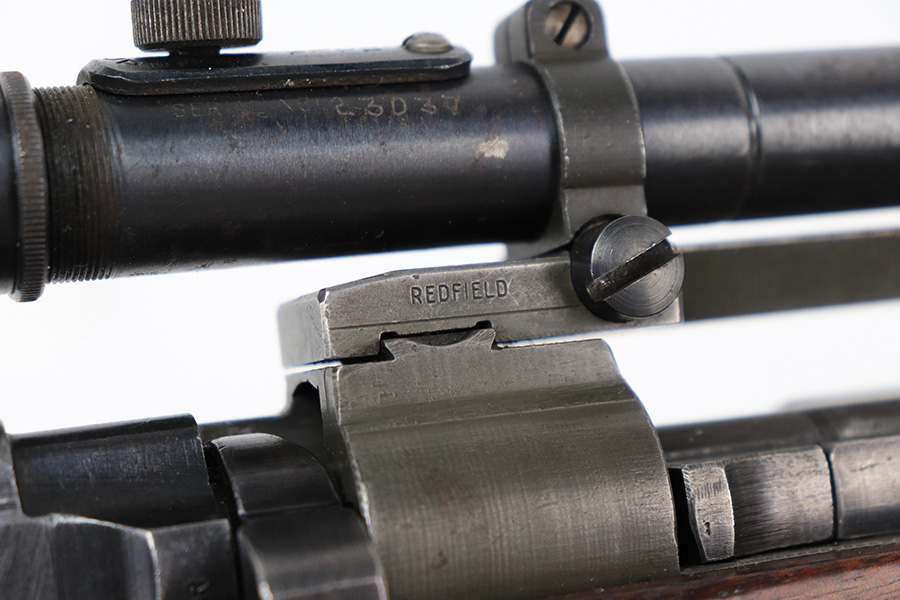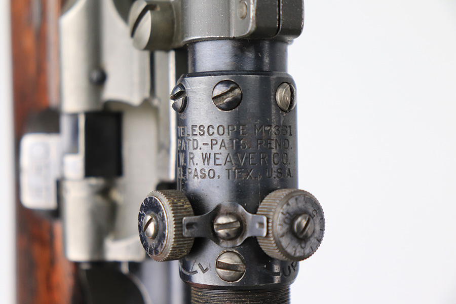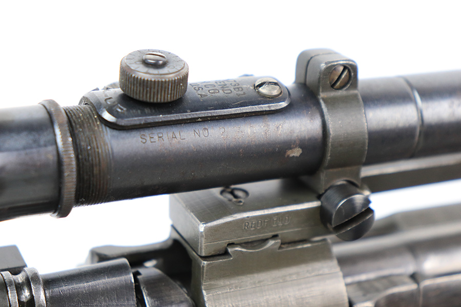 7/26/22 – This is an original 1943 production Remington 1903-A4 sniper rifle. The rifle is in great condition and consists of a mixture of both blued and parkerized parts. The stock is original and shows some typical use wear and aging, such as small surface indents, dings, mild surface scratches and imperfections throughout the wood. The left side of the wood above the trigger shows the original inspector cartouches. The rifle configuration appears all original except for perhaps the base plate and trigger guard, which have a very clean, excellent parkerized finish. The barrel date corresponds to the serial number on the receiver correctly. Many of the small parts are properly “R” stamped. Comes with a parkerized Redfield scope mount and a Weaver 330 scope. The scope has an electro-penciled serial number and clear optics. The reticle has some imperfections, but these are minor. The exterior of the scope shows some light surface patina but no rust or pitting. The bore is shiny and clean throughout, but there is some mild patina in and around the grooves closer to the muzzle. NOTE: There is a fairly large gouge out of the right side of the receiver, not sure the reason or cause of it. Shown in the last photo.