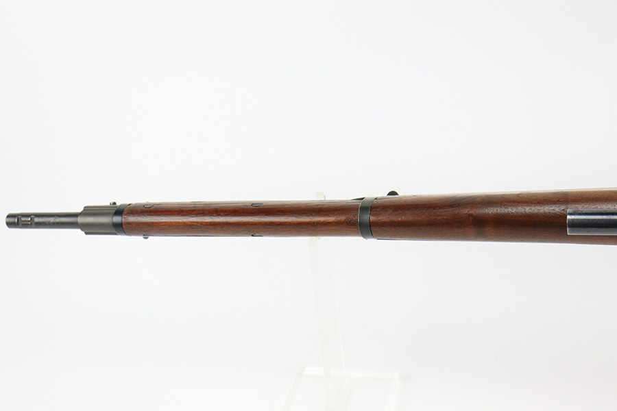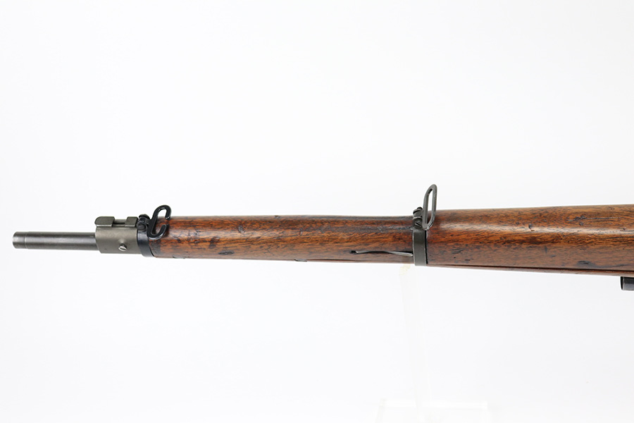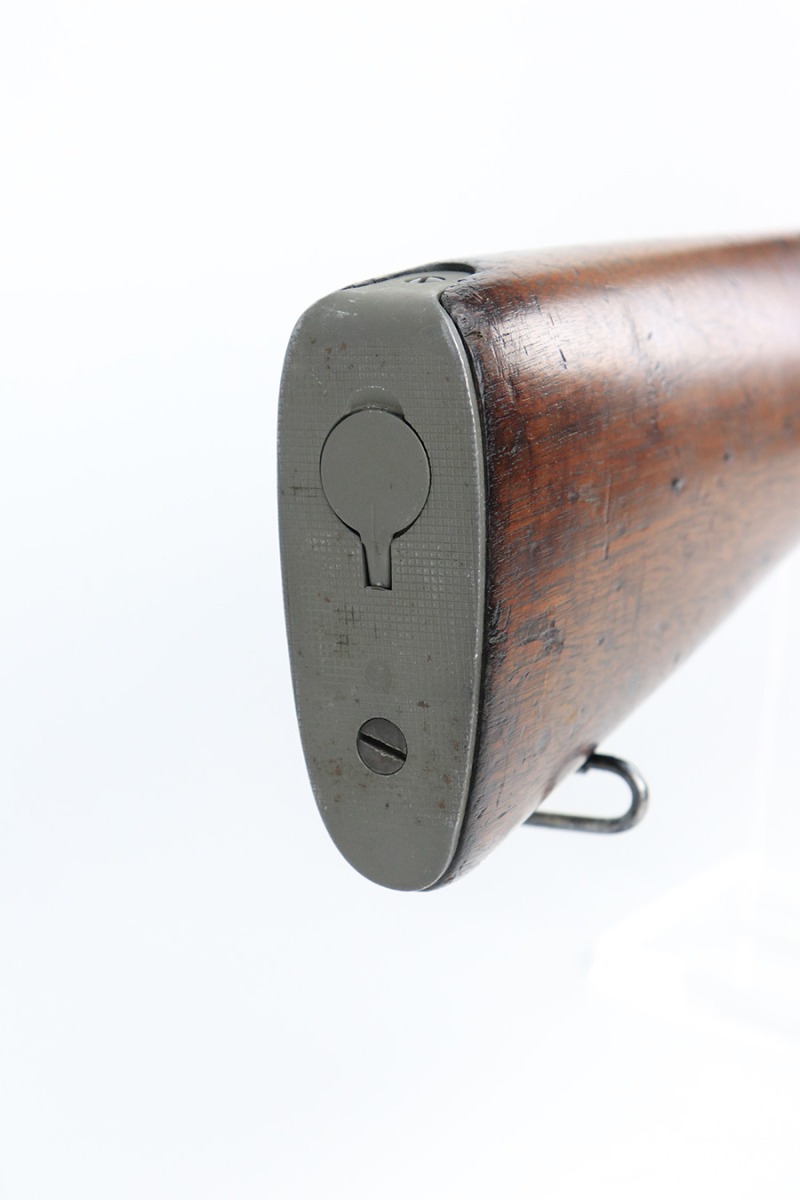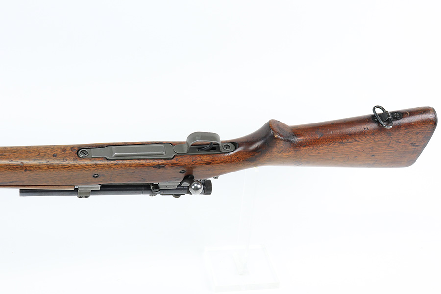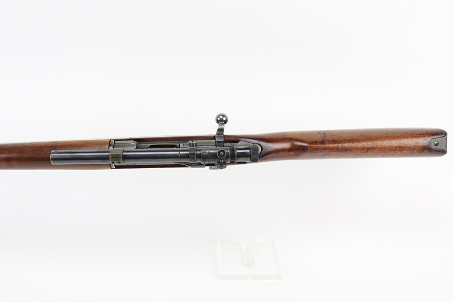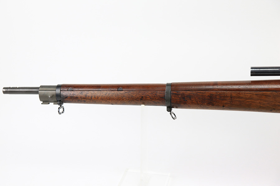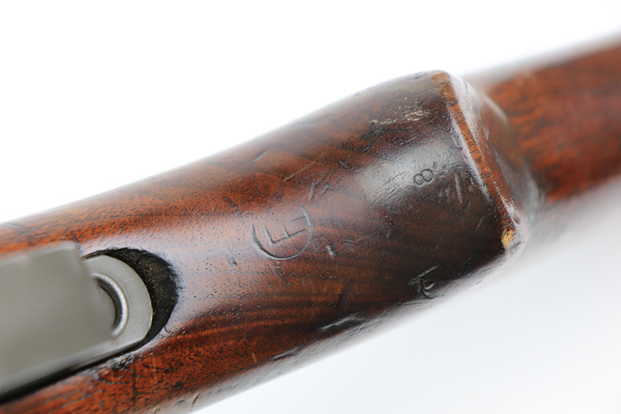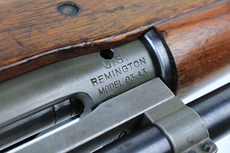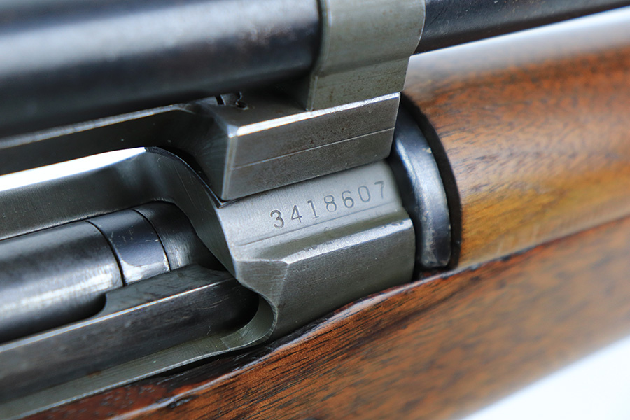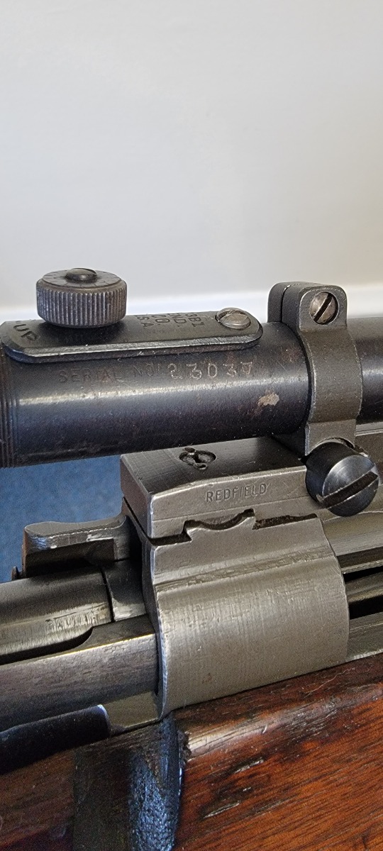 7/26/22 – This is an original 1943 production Remington 1903-A4 sniper rifle. The rifle is in great condition and consists of a mixture of both blued and parkerized parts. The stock is original and shows some typical use wear and aging, such as small surface indents, dings, mild surface scratches and imperfections throughout the wood. The left side of the wood above the trigger shows the original inspector cartouches. The rifle configuration appears all original except for perhaps the base plate and trigger guard, which have a very clean, excellent parkerized finish. The barrel date corresponds to the serial number on the receiver correctly. Many of the small parts are properly “R” stamped. Comes with a parkerized Redfield scope mount and a Weaver 330 scope. The scope has an electro-penciled serial number and clear optics. The reticle has some imperfections, but these are minor. The exterior of the scope shows some light surface patina but no rust or pitting. The bore is shiny and clean throughout, but there is some mild patina in and around the grooves closer to the muzzle. NOTE: There is a fairly large gouge out of the right side of the receiver, not sure the reason or cause of it. Shown in the last photo.