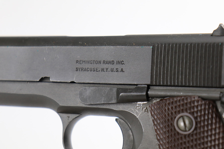 6/6/22 – This is a minty, original Remington Rand 1911A1 from early in 1944. Correct and original throughout with proper HS barrel. Proper inspection marks on slide and frame. Only minor wear around the muzzle and FJA marking, and a little rub wear from slide against the inside of the frame. Bore is shiny with strong rifling. Excellent grips with sharp checkering. ‘L’ marked magazine.