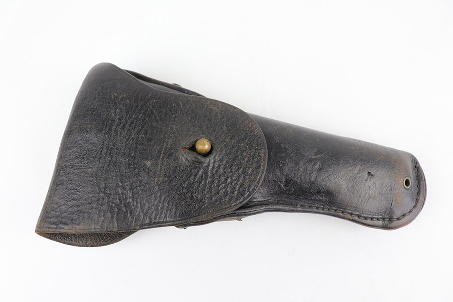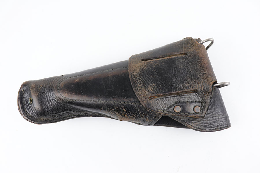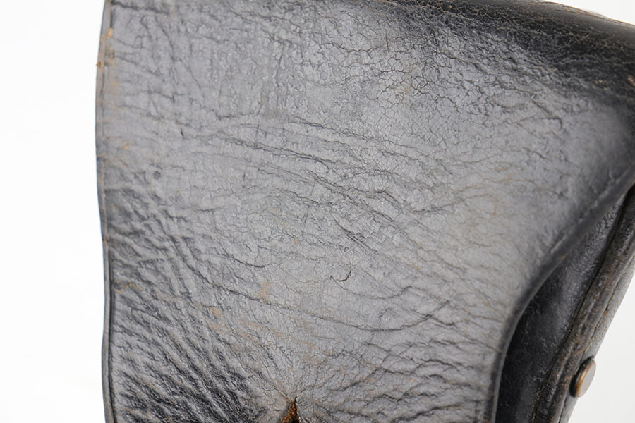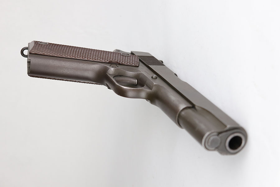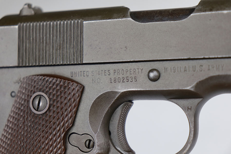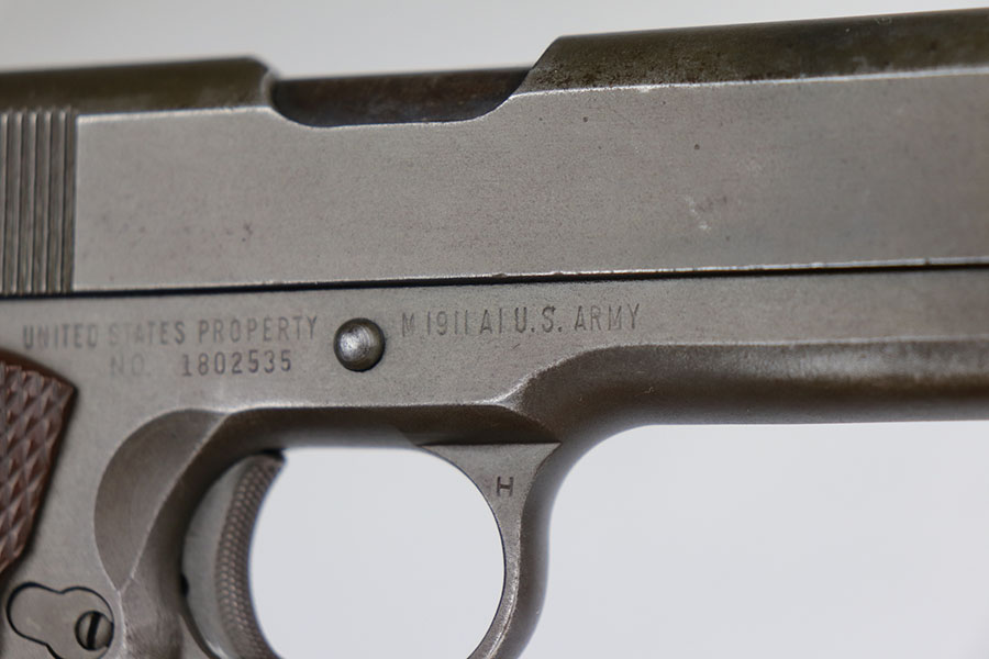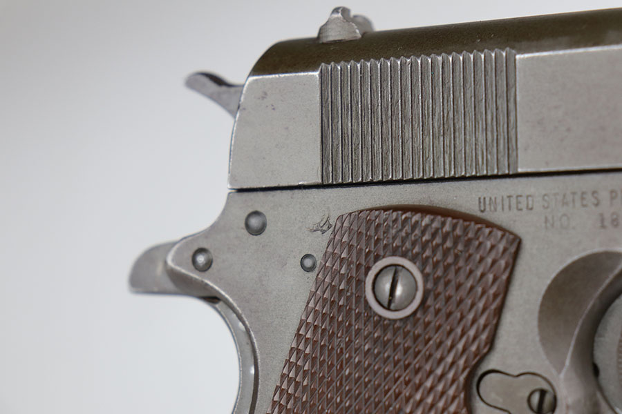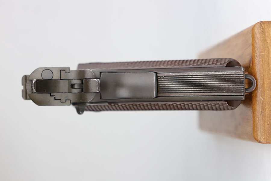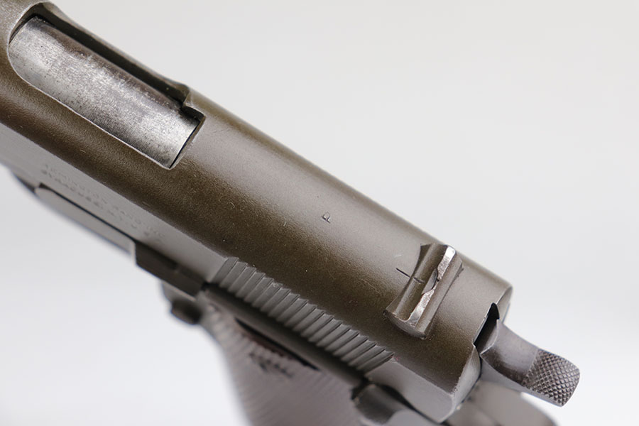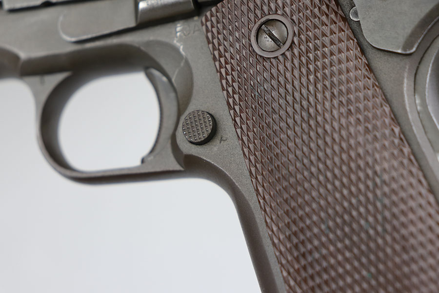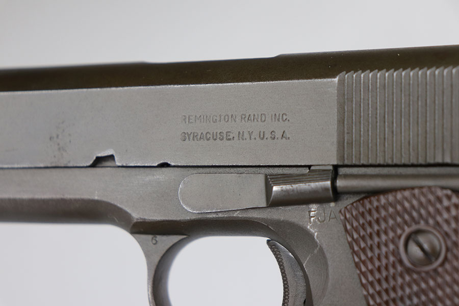 8/11/20 – This is a nice, honest example of an original Remington 1911A1 from 1944. The gun is all original with proper HS barrel. The finish loss is nearly all on the front edge of the frame, and along the top and underside of the front end of the slide. Bore is clean and shiny. Correct inspector marks. Excellent grips. ‘L’ marked magazine. Comes with original US holster that does have a faded maker mark on the back but can’t make it out.