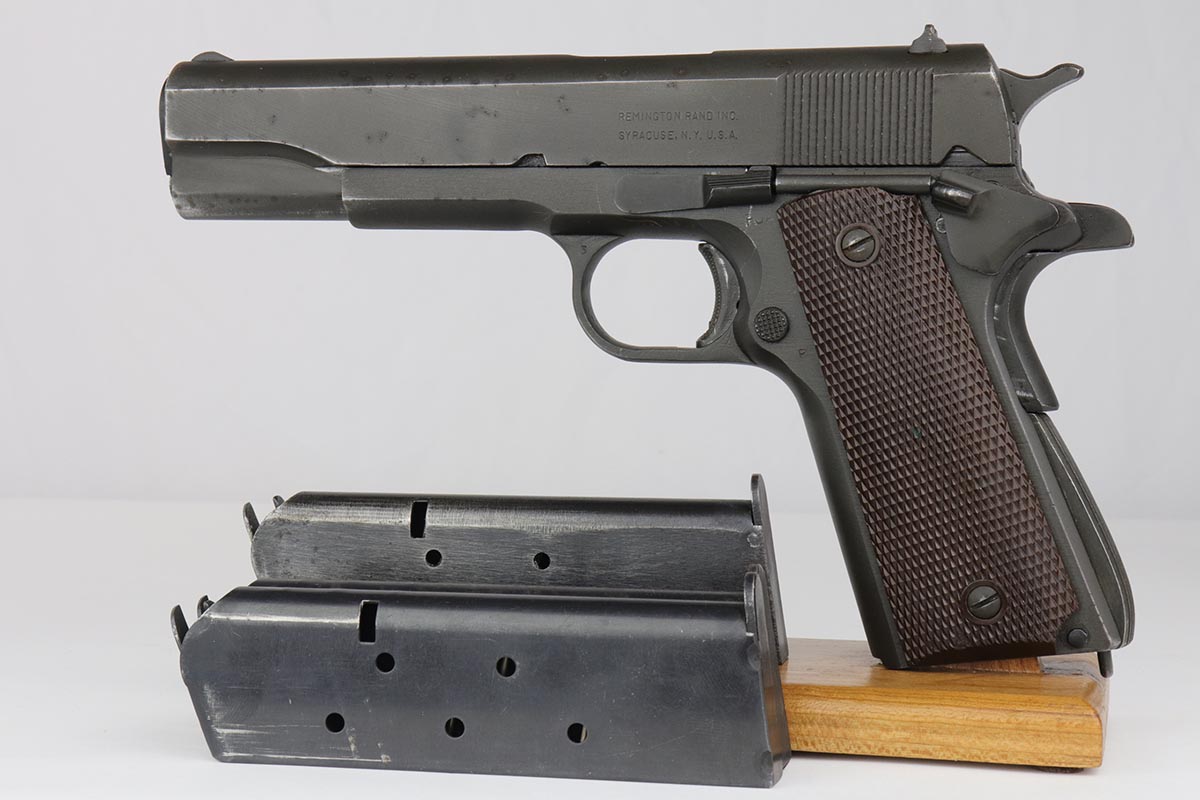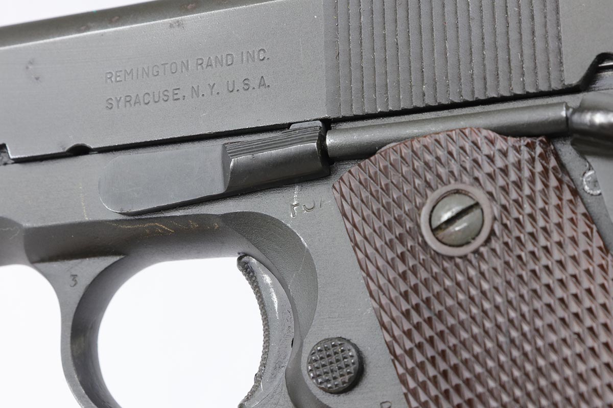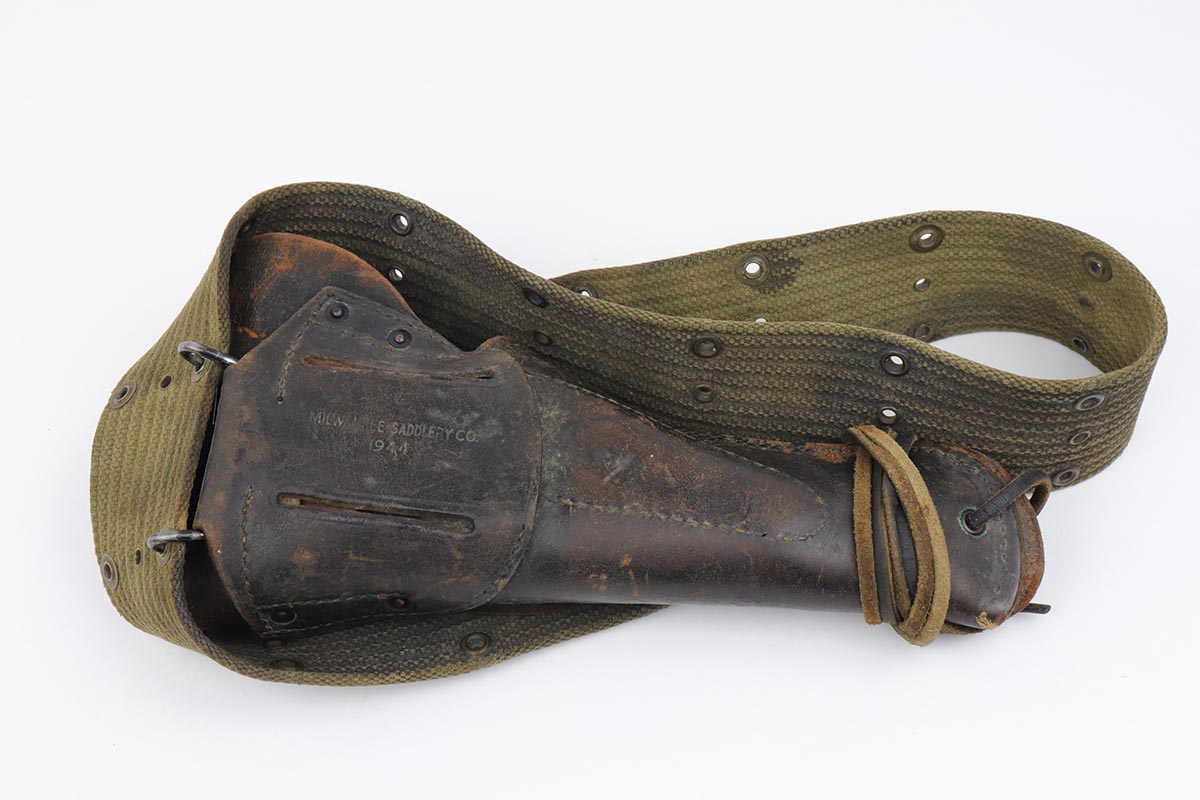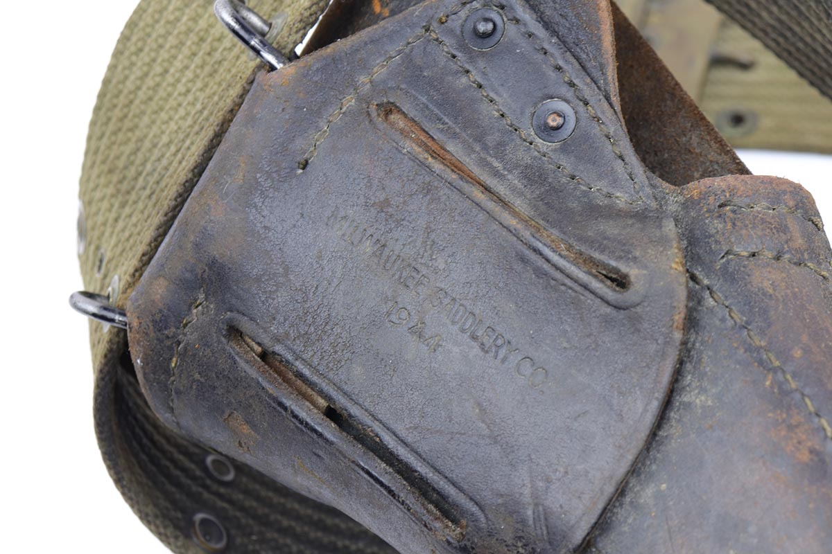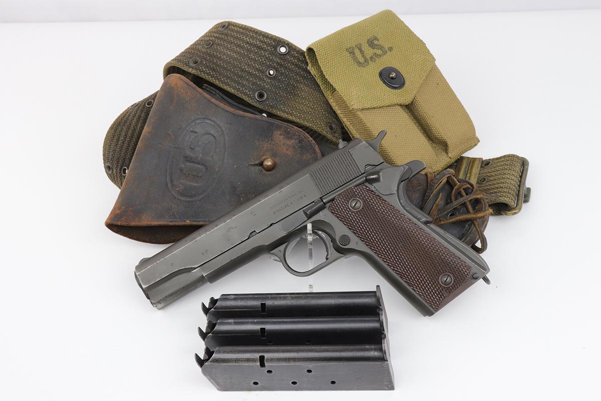 6/27/19 – This is an original Remington 1911A1 rig from early 1945, with holster, belt, magazine pouch and two spare magazines. The pistol is all correct with 95-97% parkerized finish, showing only minor finish loss on the slide and front edge of the frame. There are also several small areas of oxidation and discoloration on both sides of the slide. Very nice grips and terrific bore. Correct ‘HS’ barrel. Magazine in the pistol is ‘R’ marked on the toe. The two spares are unmarked. Mag pouch is maker marked and 1942 dated. Holster is made by Milwaukee Saddlery and 1944 dated.