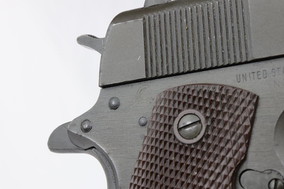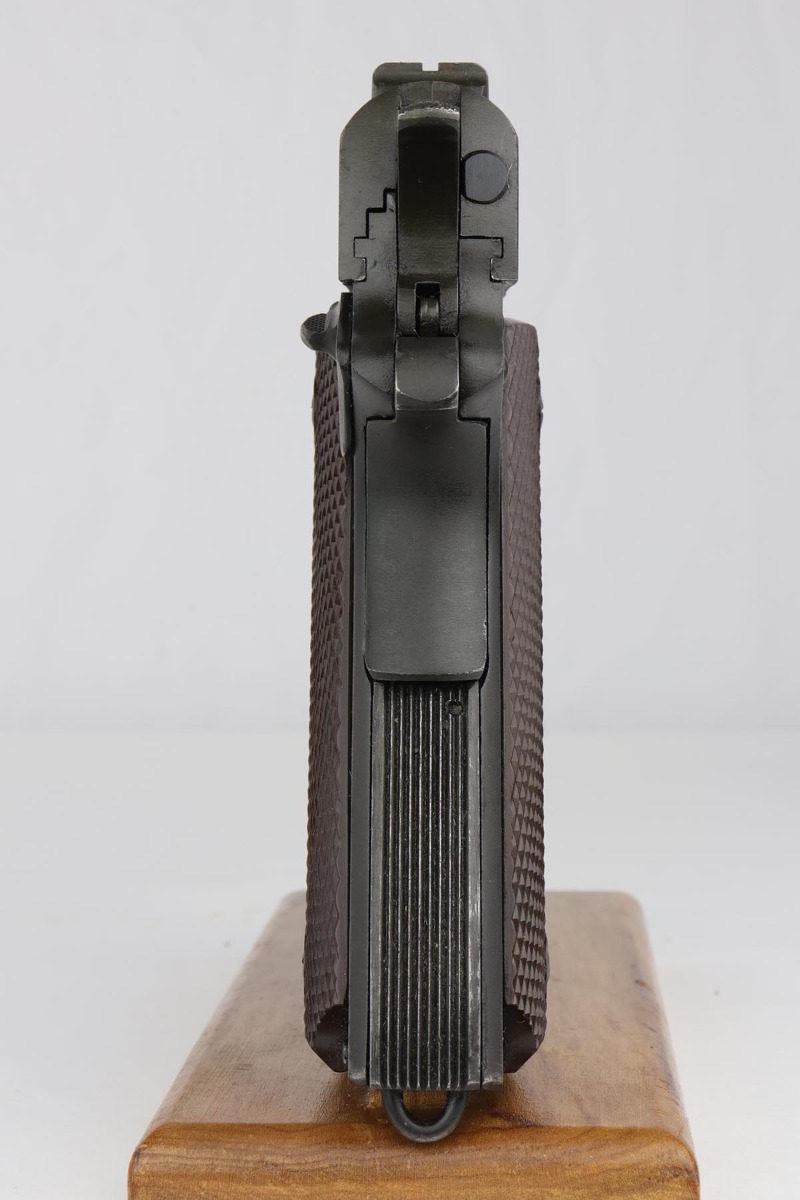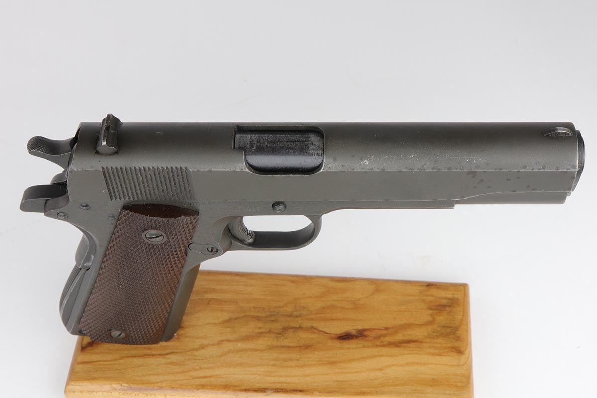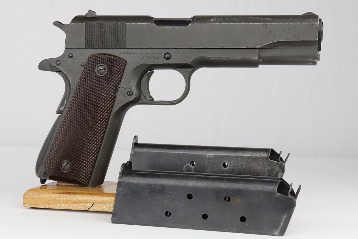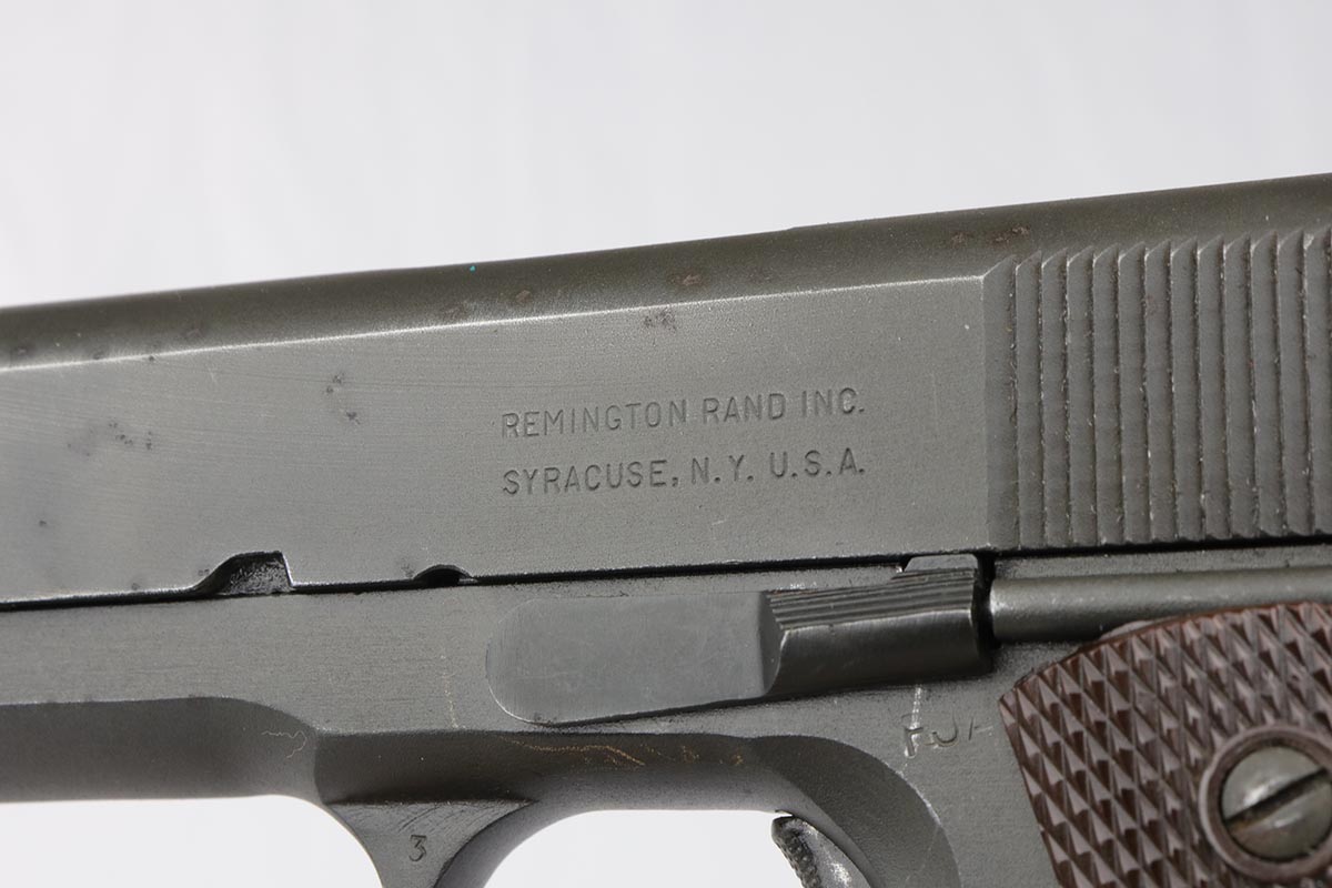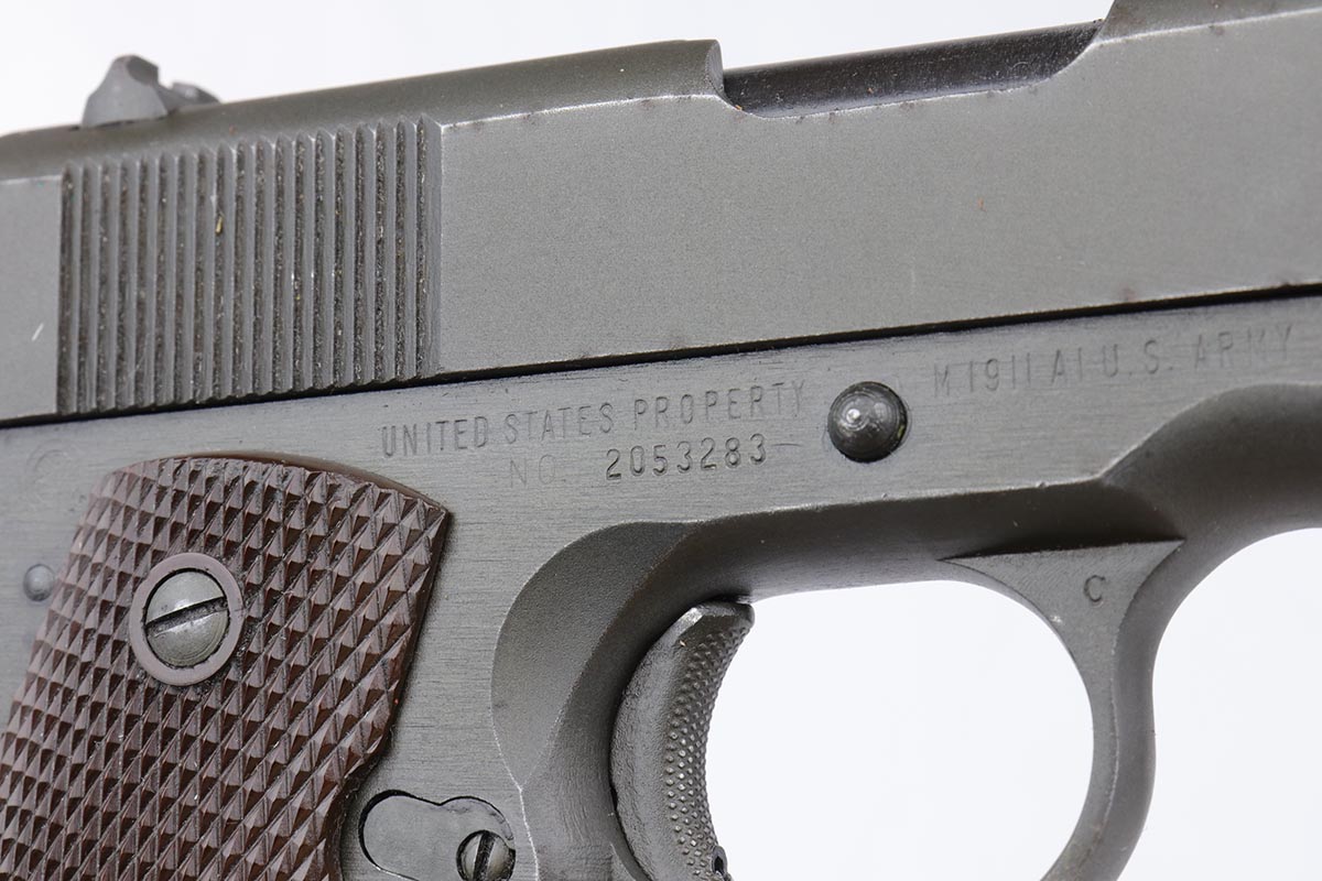 6/27/19 – This is an original Remington 1911A1 rig from early 1945, with holster, belt, magazine pouch and two spare magazines. The pistol is all correct with 95-97% parkerized finish, showing only minor finish loss on the slide and front edge of the frame. There are also several small areas of oxidation and discoloration on both sides of the slide. Very nice grips and terrific bore. Correct ‘HS’ barrel. Magazine in the pistol is ‘R’ marked on the toe. The two spares are unmarked. Mag pouch is maker marked and 1942 dated. Holster is made by Milwaukee Saddlery and 1944 dated.