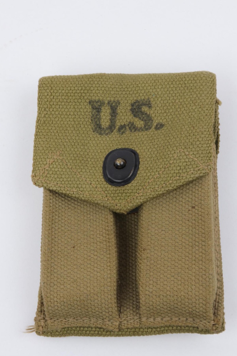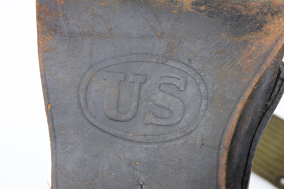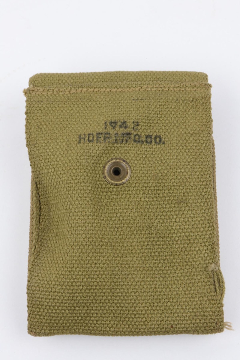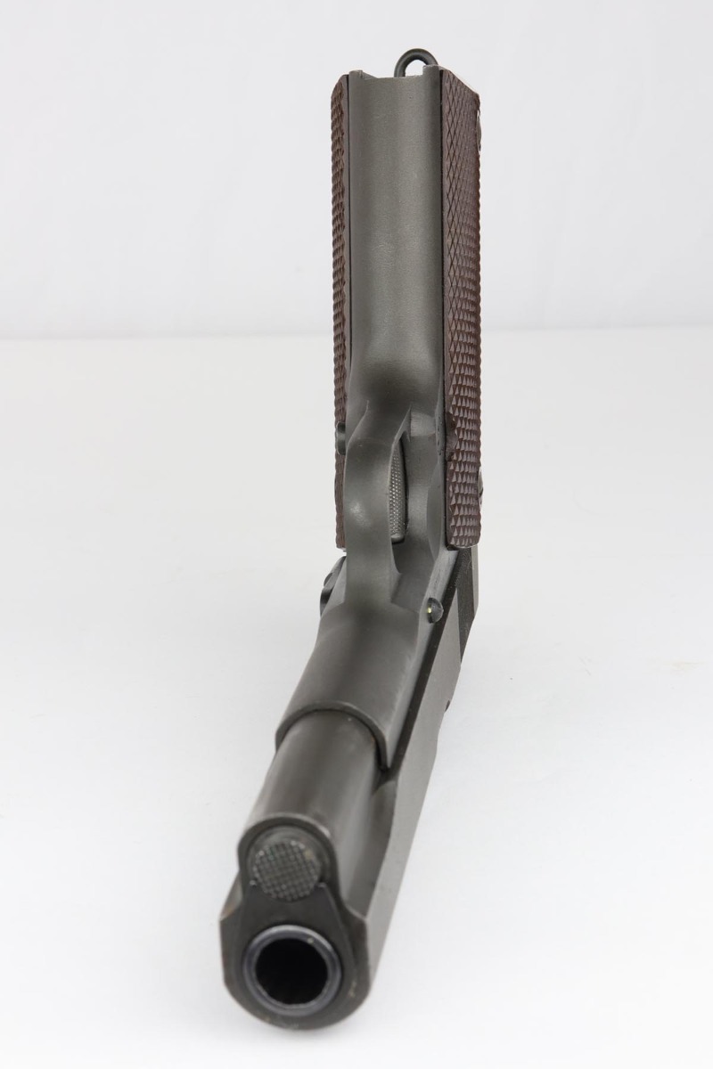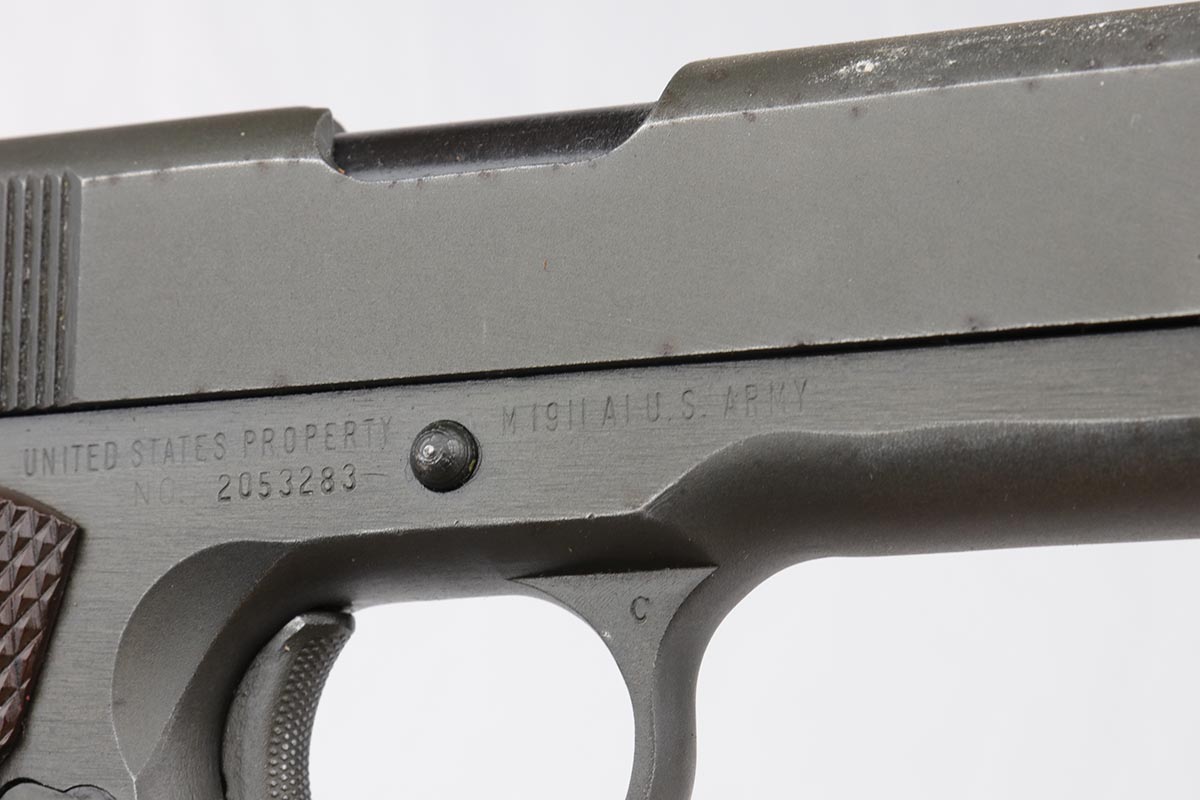 6/27/19 – This is an original Remington 1911A1 rig from early 1945, with holster, belt, magazine pouch and two spare magazines. The pistol is all correct with 95-97% parkerized finish, showing only minor finish loss on the slide and front edge of the frame. There are also several small areas of oxidation and discoloration on both sides of the slide. Very nice grips and terrific bore. Correct ‘HS’ barrel. Magazine in the pistol is ‘R’ marked on the toe. The two spares are unmarked. Mag pouch is maker marked and 1942 dated. Holster is made by Milwaukee Saddlery and 1944 dated.