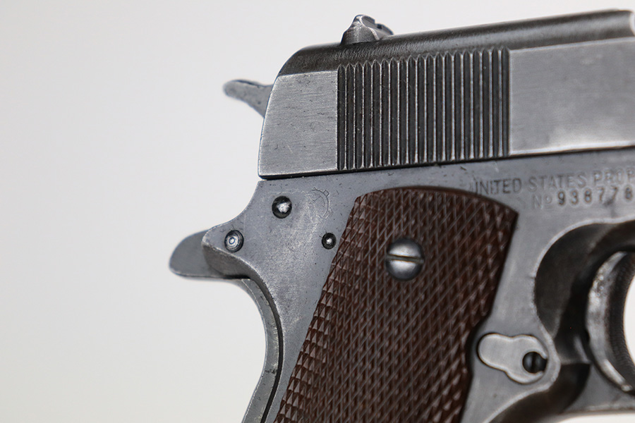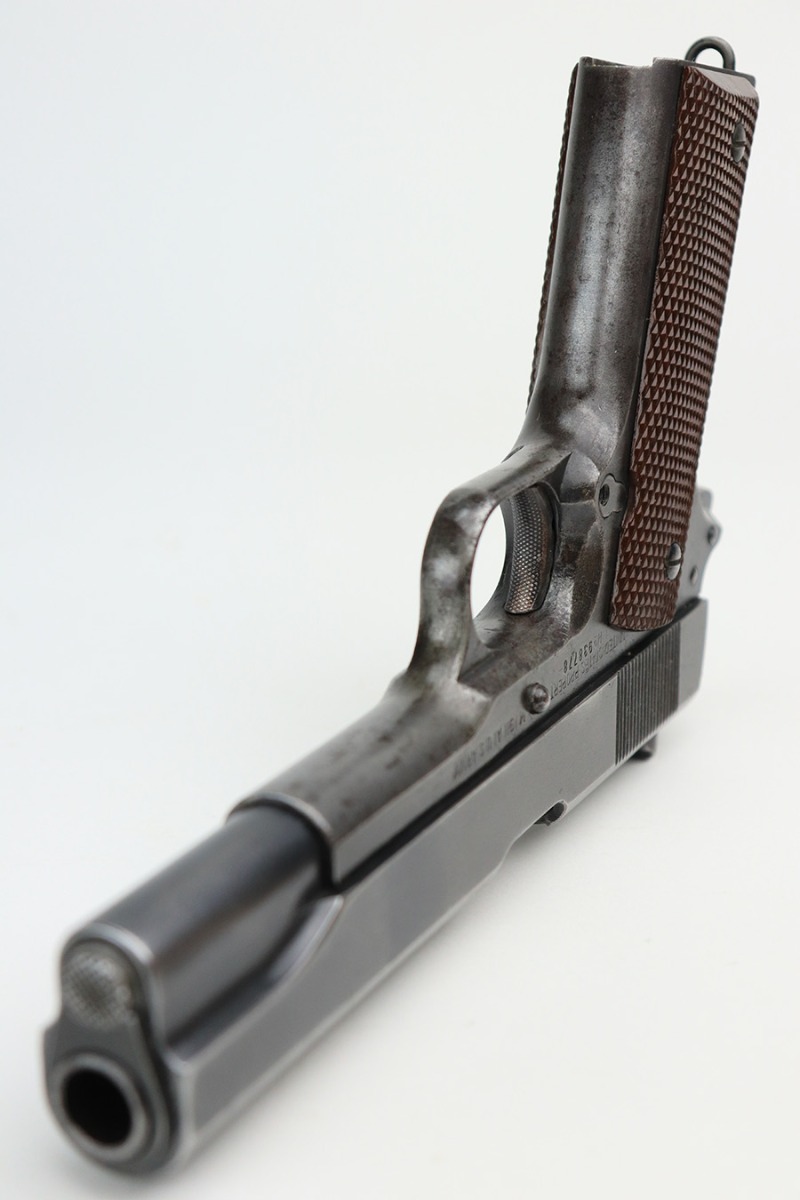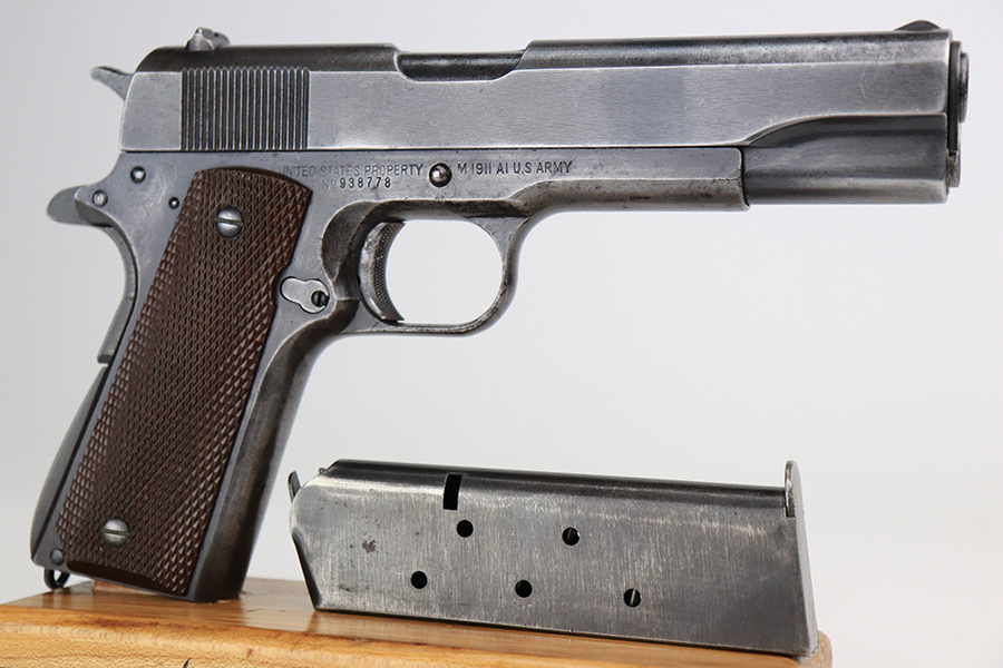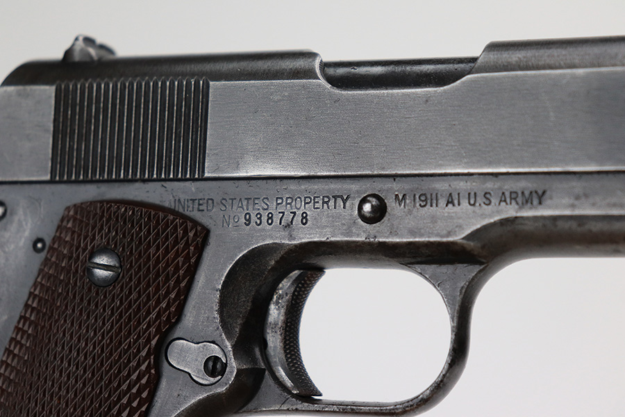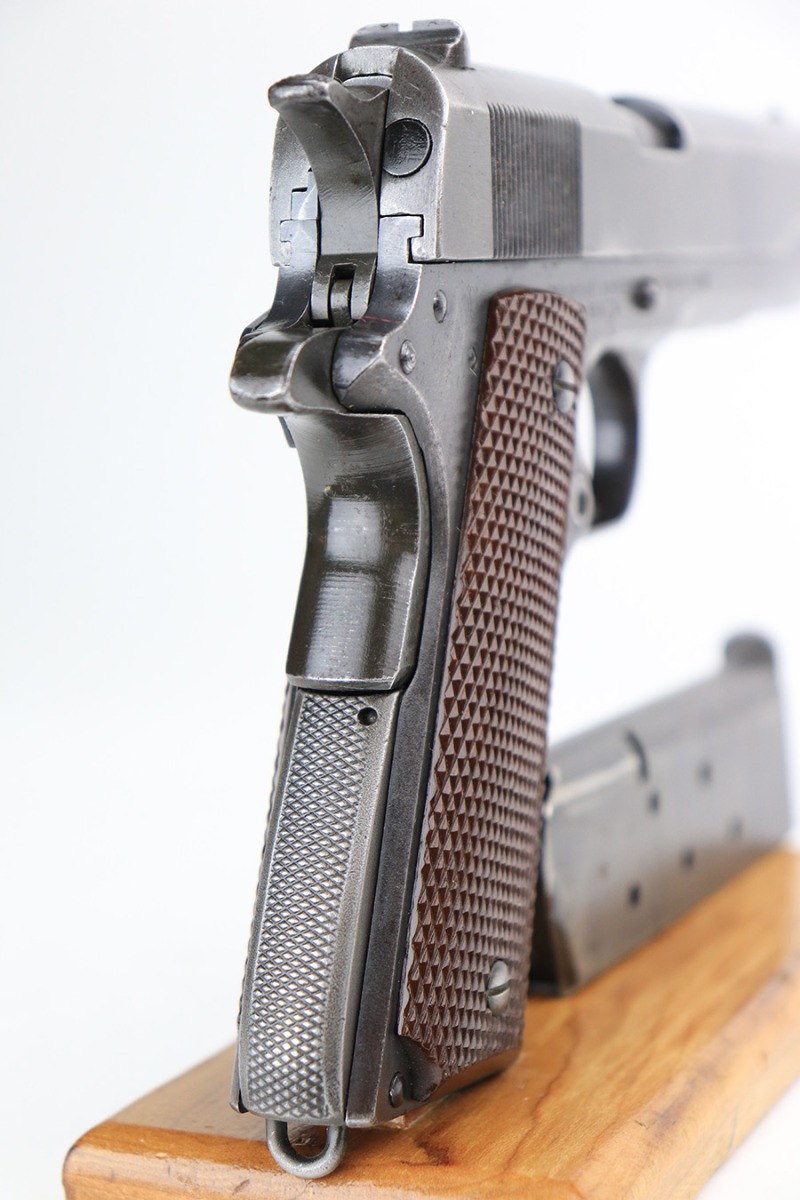 5/4/22 – This is a nice example of a Remington Model 1911A1 issued to the US military in 1942-43. This one is a scarce 2nd variation example with a proper 2nd variation slide and a proper main spring housing. Also has a correct HS barrel. The gun has retained roughly 80% of its original finish. There are areas of thinning in the finish and tiny dots of oxidation throughout. Comes with excellent period-correct plastic grips and a proper WW2-era magazine. The bore has good rifling, but there are tiny dots of oxidation throughout.