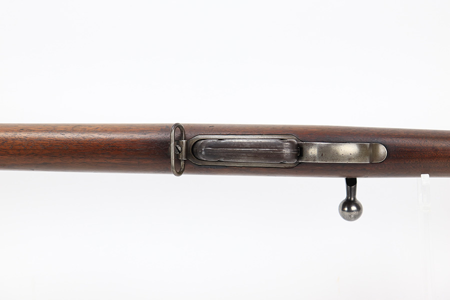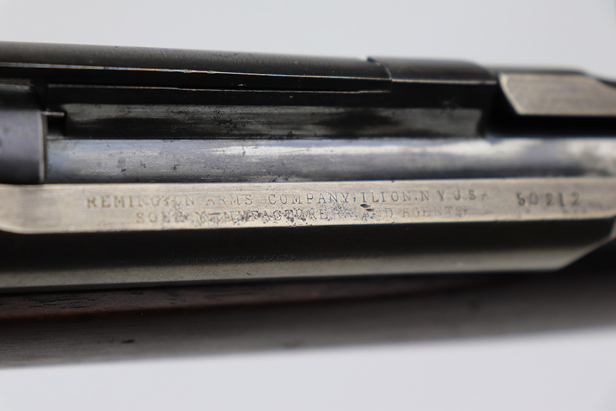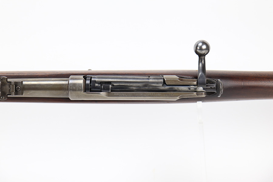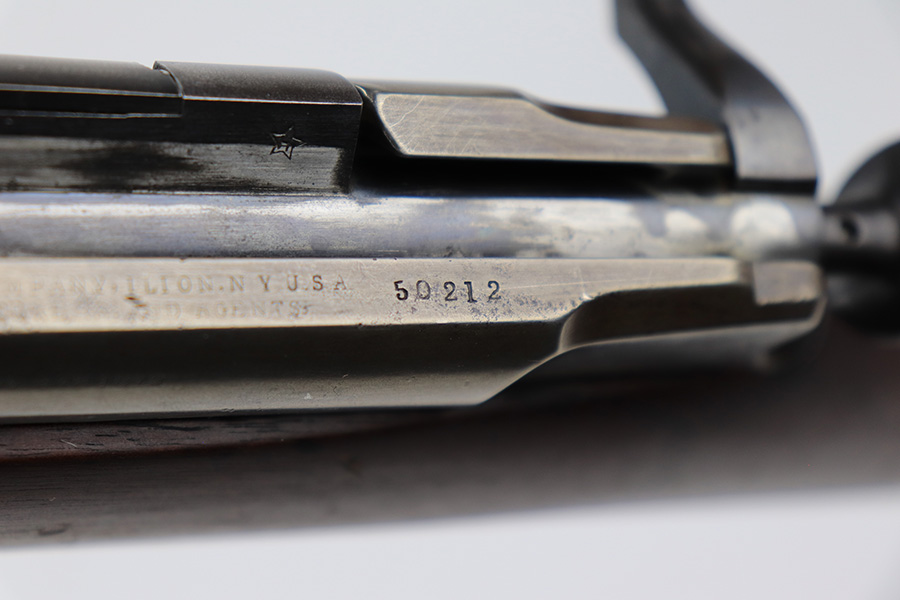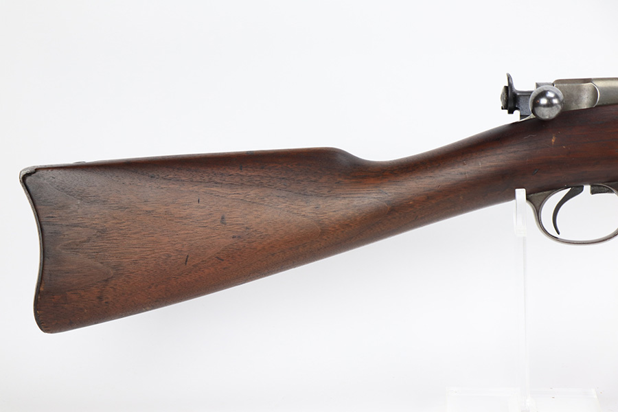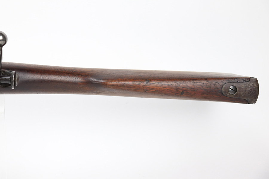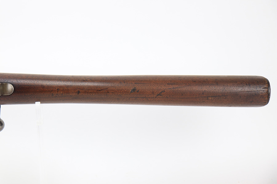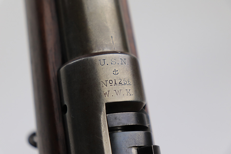 6/6/23 – This is an original Remington-Lee Navy Model 1885 bolt action rifle. This rifle was patented by the same man (James Paris Lee) who is known for the Lee-Enfield rifles made for British use during WW1 and WW2. The model 1885 was not nearly as popular, and was only used by the U.S. Navy from 1885-1892. Despite being a revolutionary design at the time, the US military switched to the Krag M1892 shortly after their first order of these rifles in 1885. The rifle features a 5 round box magazine and adjustable rear sight. The receiver is stamped “U.S.N. No 1256 W.W.K.” with an anchor logo. There’s also a Remington patent stamp and serial number 50212. The bolt and receiver have matching star shaped acceptance proofs. The metal has traces of original finish, but most of the finish is worn away leaving a steel color underneath. However, there’s minimal surface patina and no rust or pitting, making this example in great overall condition for its’ age. The wood is excellent with some normal signs of use and aging, but no cracks or notable issues. The bore has nice rifling, but there is some textured areas and pitting within the grooves about 10 inches down from the muzzle of the bore. We rate at 7/10 overall. Mechanically sound and comes with an original clean rod, as shown.