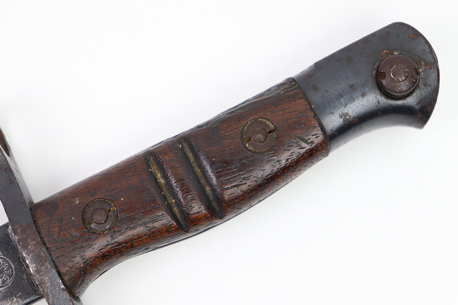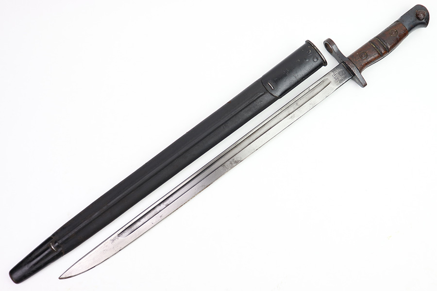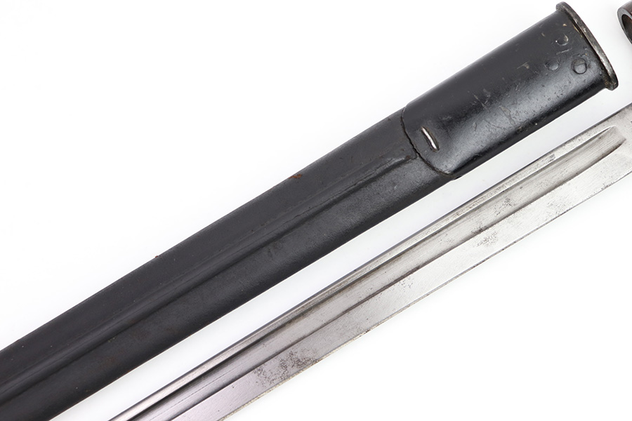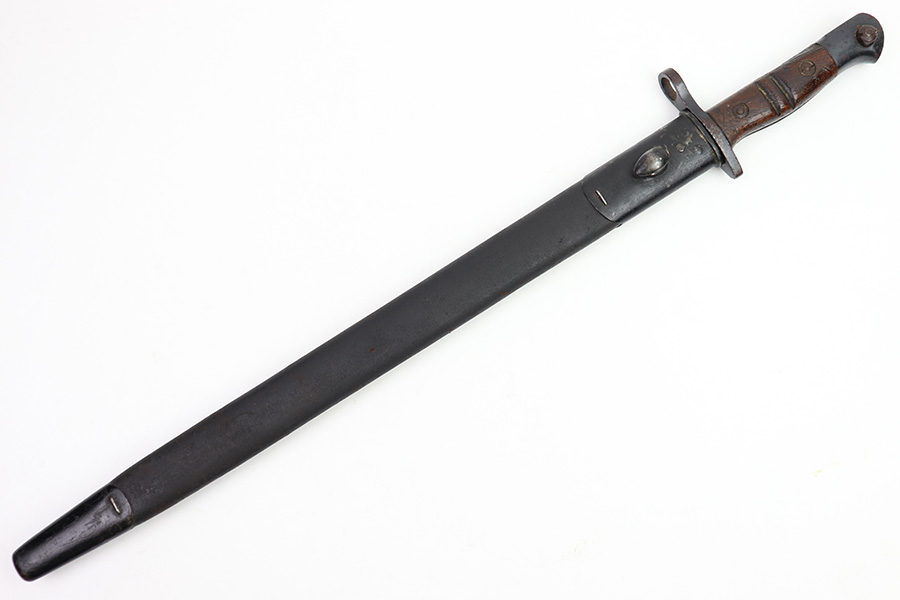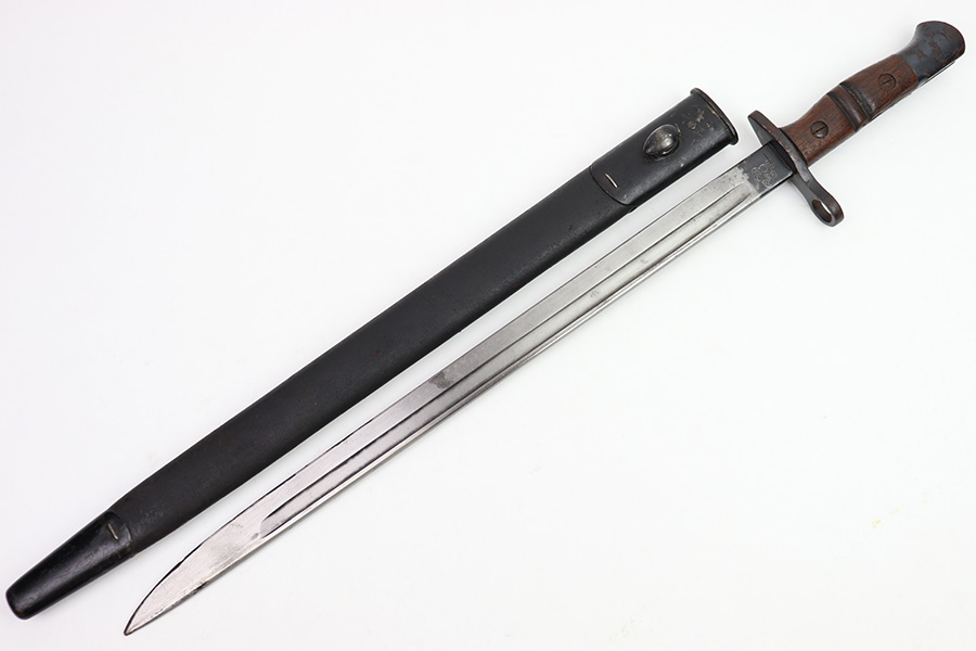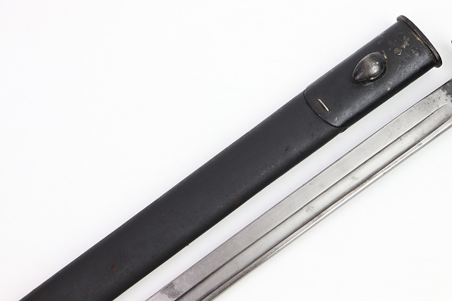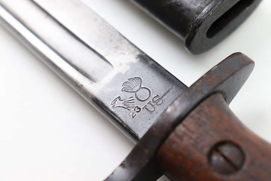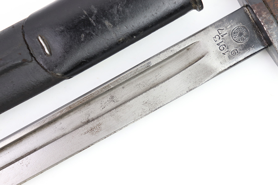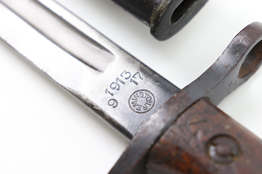 11/16/22 – This is an original Remington M1913 bayonet from WW1. The bayonet blade is in great condition with some dark areas of surface oxidation on each side. The edge shows some mild use wear and a few small chips or imperfections. The ricasso is US stamped with a flaming bomb on one side, and Remington 1913 stamped on the other side with a “9 17” date for September 1917 production. The hand guard and pommel have some spotty surface patina and a few small spots of rust mixed within the blued finish. The wood grips have no cracks or chips. Comes with a British style Enfield scabbard, stamped “RE” on the metal fitting near the mouth.