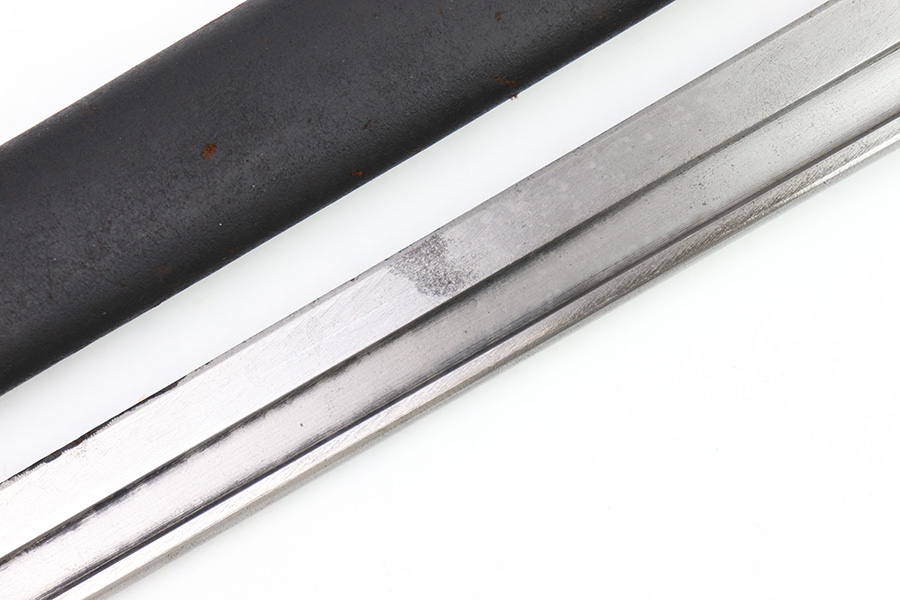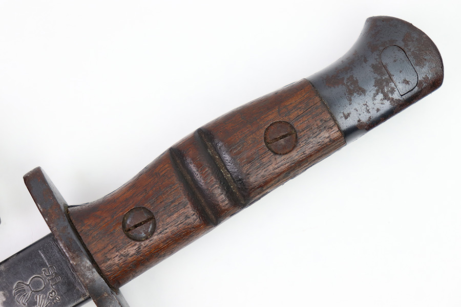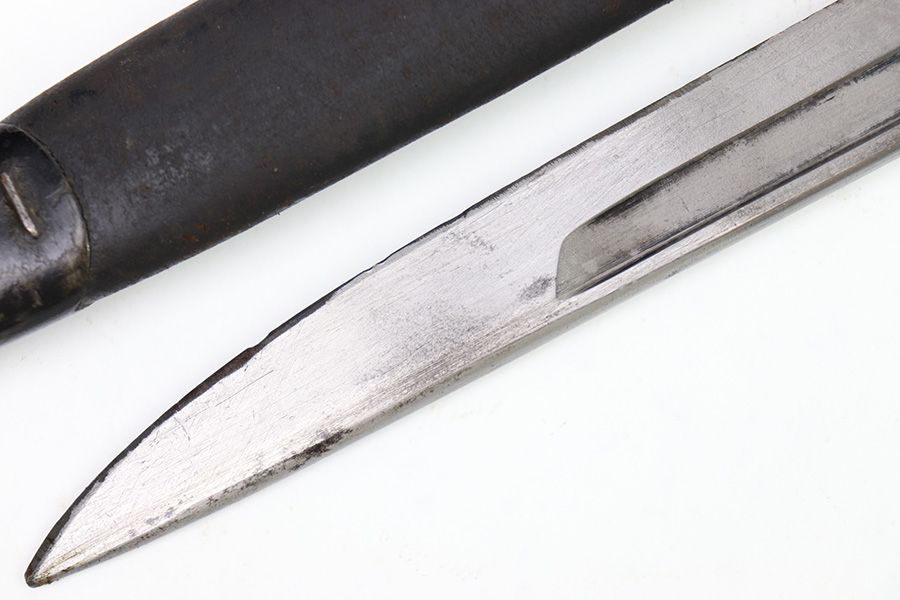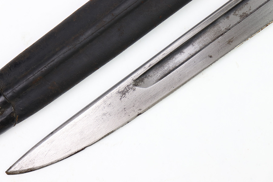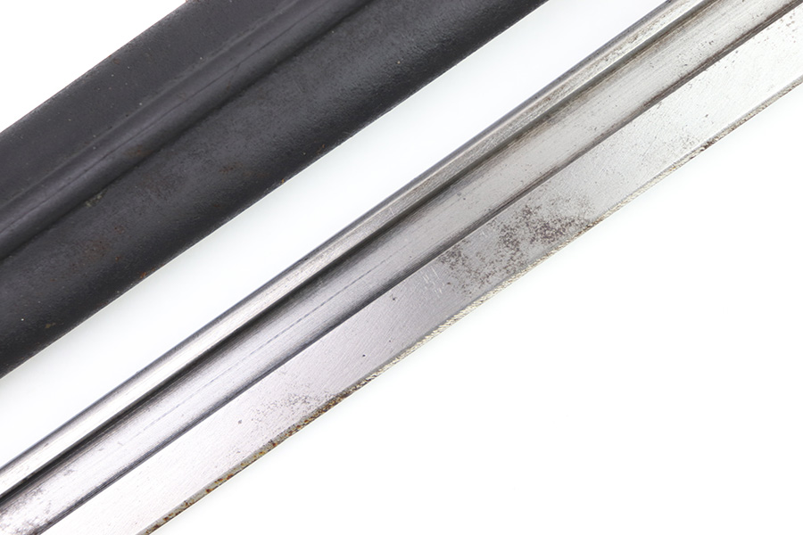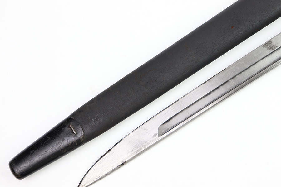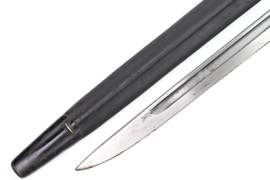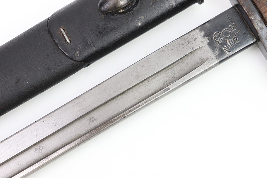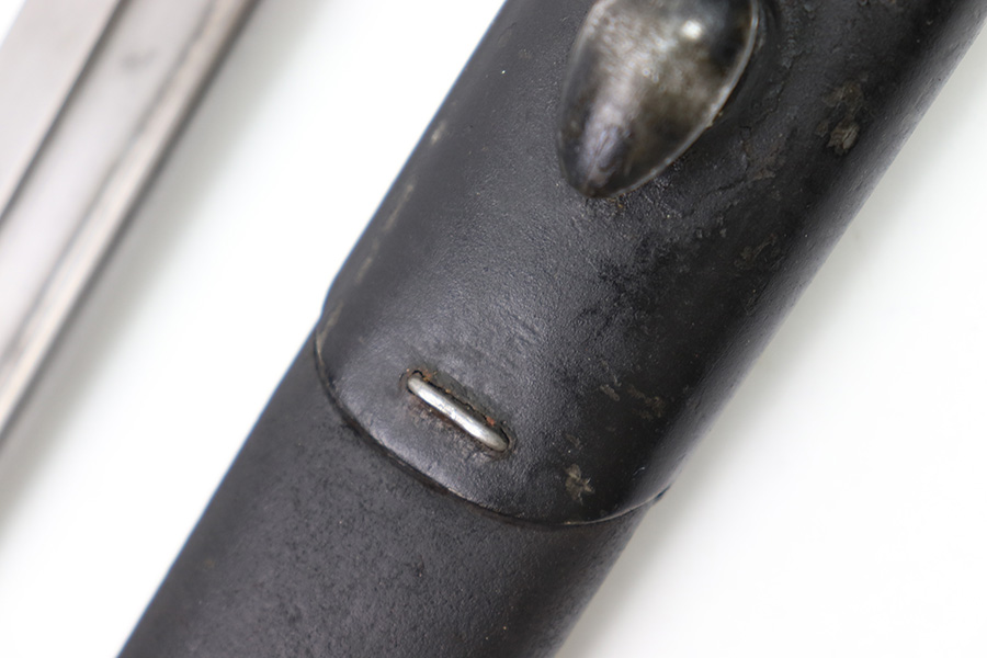 11/16/22 – This is an original Remington M1913 bayonet from WW1. The bayonet blade is in great condition with some dark areas of surface oxidation on each side. The edge shows some mild use wear and a few small chips or imperfections. The ricasso is US stamped with a flaming bomb on one side, and Remington 1913 stamped on the other side with a “9 17” date for September 1917 production. The hand guard and pommel have some spotty surface patina and a few small spots of rust mixed within the blued finish. The wood grips have no cracks or chips. Comes with a British style Enfield scabbard, stamped “RE” on the metal fitting near the mouth.
