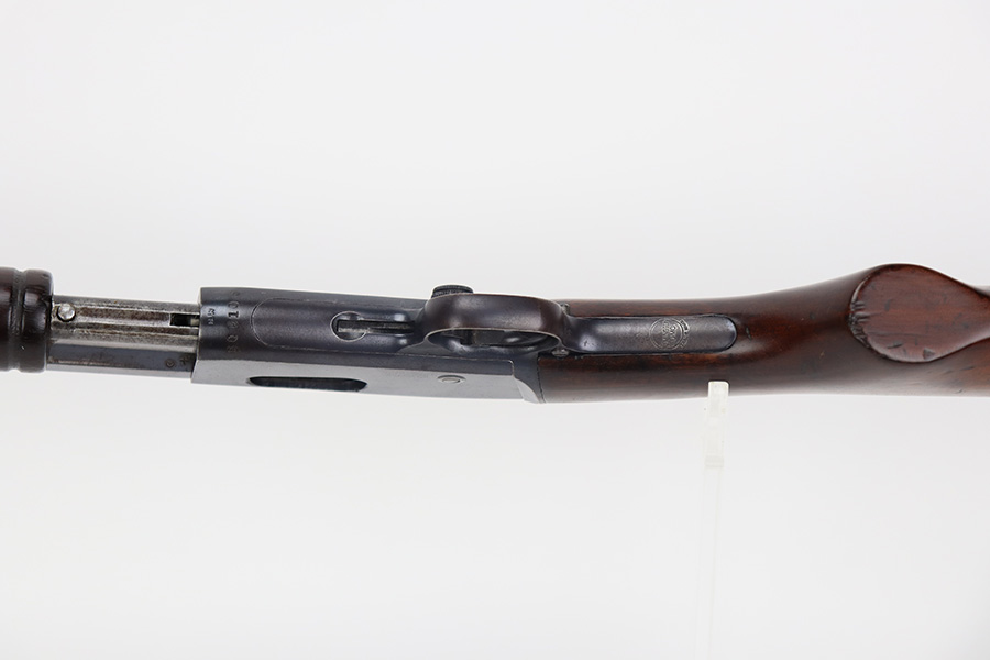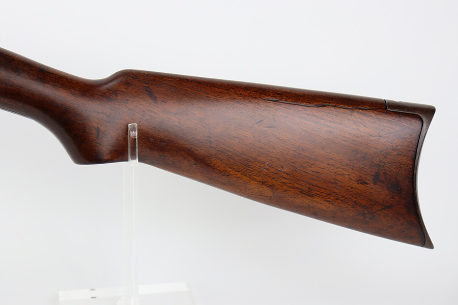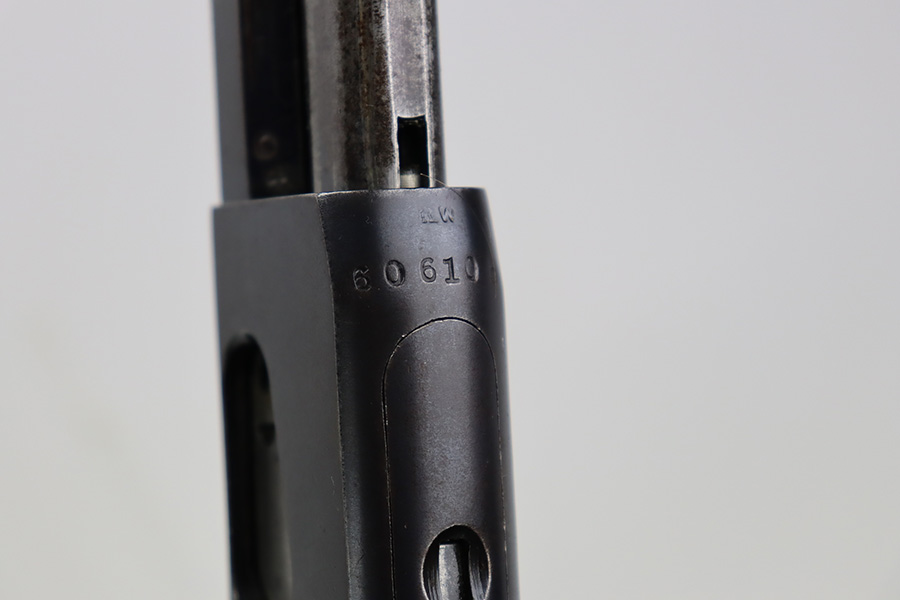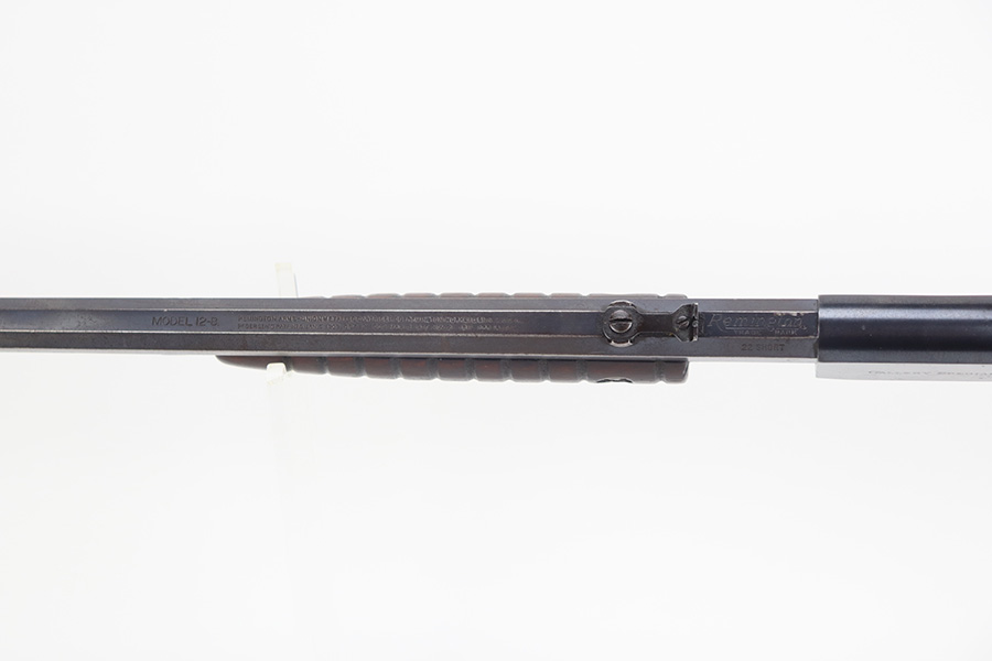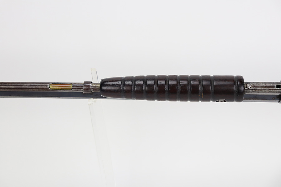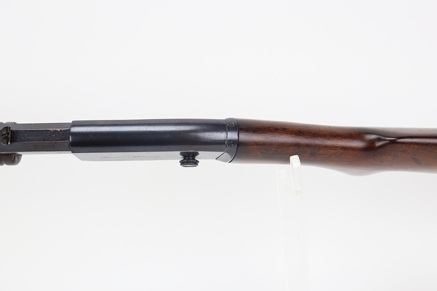 8/16/23 – These were made from 1909 to 1936. During the 37-year period, there were 820,759 guns sold and it was available in several different configurations. The Model 12B “Galley Special” was chambered for 22 Short Only and was used primarily for Indoor and portable shooting ranges. This one is matching and has retained about 90% of its original finish. While there isn’t a lot of actual finish loss, there is brown patina and light spotty oxidation throughout. There is general high edge wear and some light scratches and handling marks here and there along the barrel. There is no major damage to the wood furniture, but there are obvious dings and scratches throughout. The bore has decent rifling, but there is minor pitting throughout.