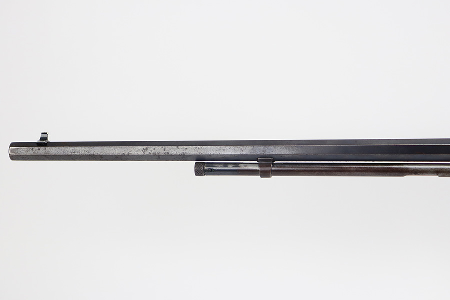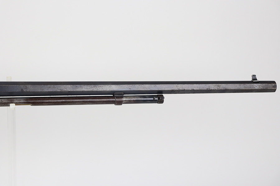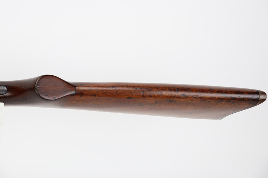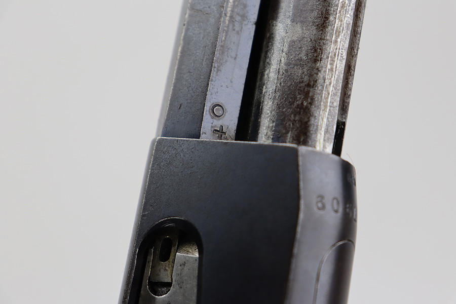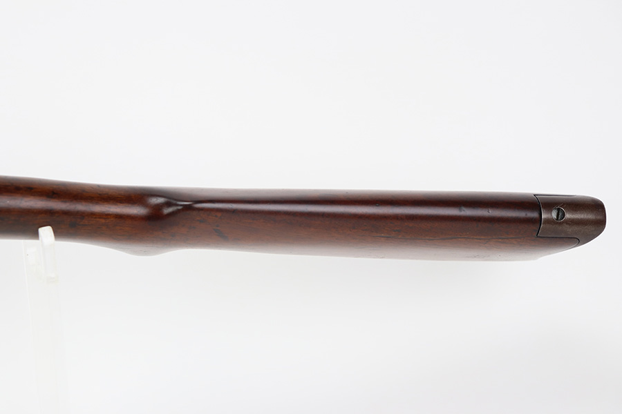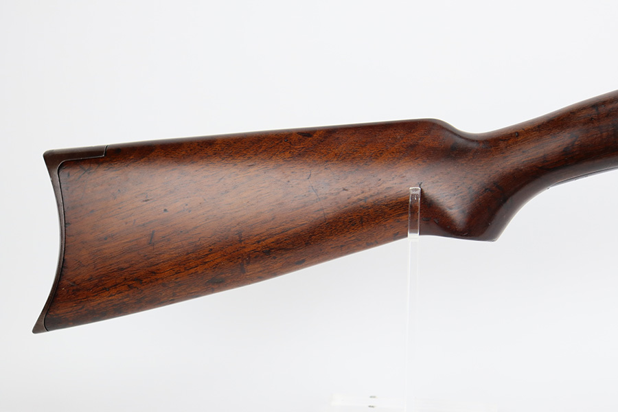8/16/23 – These were made from 1909 to 1936. During the 37-year period, there were 820,759 guns sold and it was available in several different configurations. The Model 12B “Galley Special” was chambered for 22 Short Only and was used primarily for Indoor and portable shooting ranges. This one is matching and has retained about 90% of its original finish. While there isn’t a lot of actual finish loss, there is brown patina and light spotty oxidation throughout. There is general high edge wear and some light scratches and handling marks here and there along the barrel. There is no major damage to the wood furniture, but there are obvious dings and scratches throughout. The bore has decent rifling, but there is minor pitting throughout.