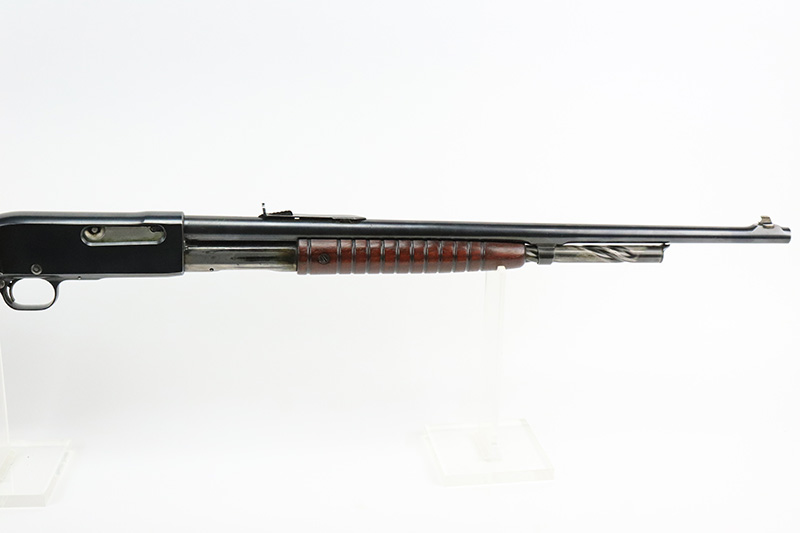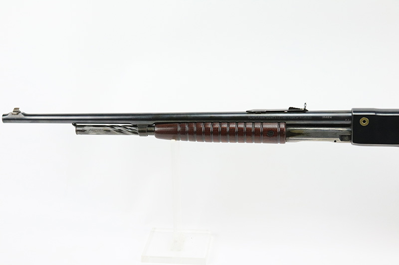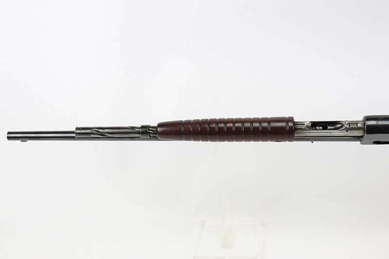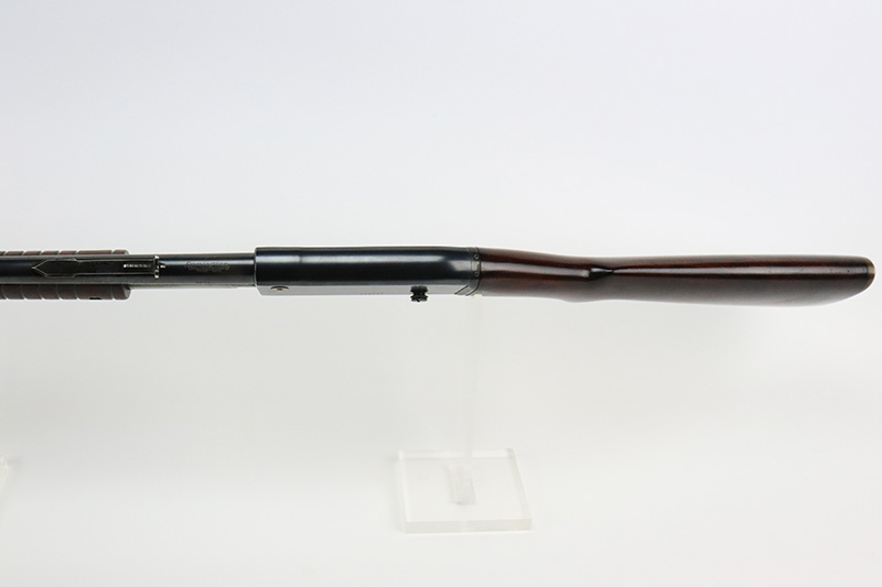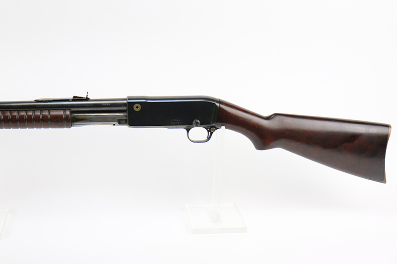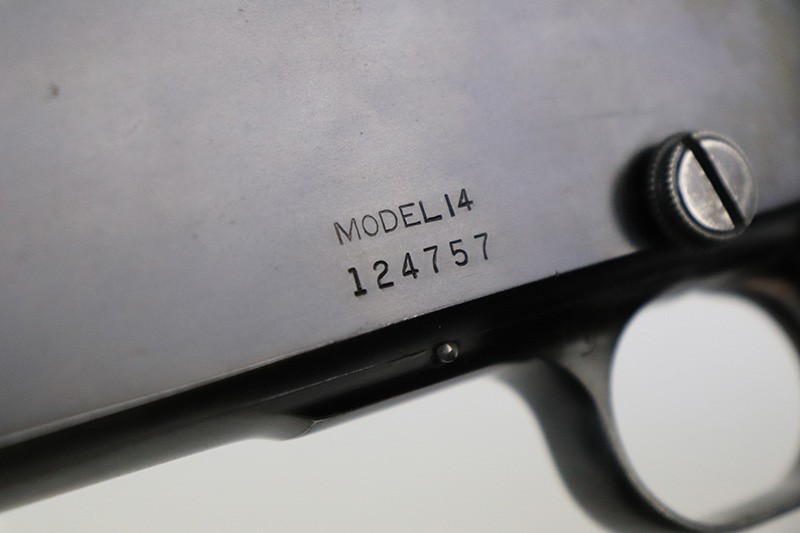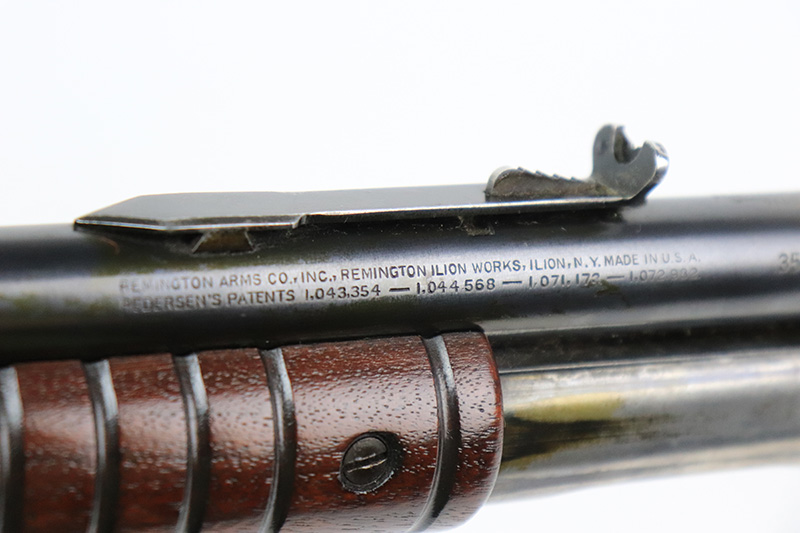 10/5/22 – The Remington Model 14 was a pump-action repeating rifle designed for the Remington Arms company by John Pedersen from 1912 to 1919, when it was changed to the 14A. Chambered in .35 Remington, this rifle is in excellent original condition. The receiver and barrel show only minor finish loss, though there is some staining on the sides of the receiver and behind the trigger guard that is likely caused by some varnish that was used on the stock. Wood parts are in great shape with no cracks or chips. Bore is minty with strong rifling. The Model 14’s design incorporated several innovative concepts. Among them was a spiral magazine tube to prevent bullet tips from contacting the primer of the cartridge in front of them. This magazine moved with the fore-end when pumping the action. Loading was through an opening in the magazine itself located between the fore-end and the receiver. The bolt unlocked via a button pressed through the ejection port though firing the gun automatically unlocked the bolt. The Model 14 was a takedown rifle that featured a single knurled screw on the left side of the receiver that was withdrawn allowing the trigger group and buttstock to be removed from the bottom of the gun.