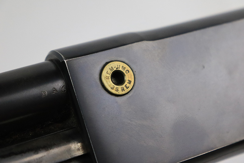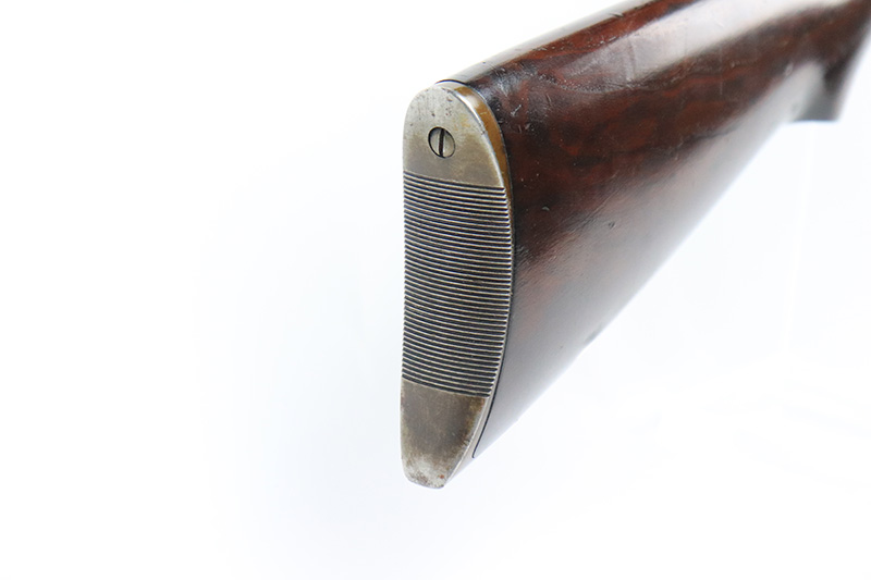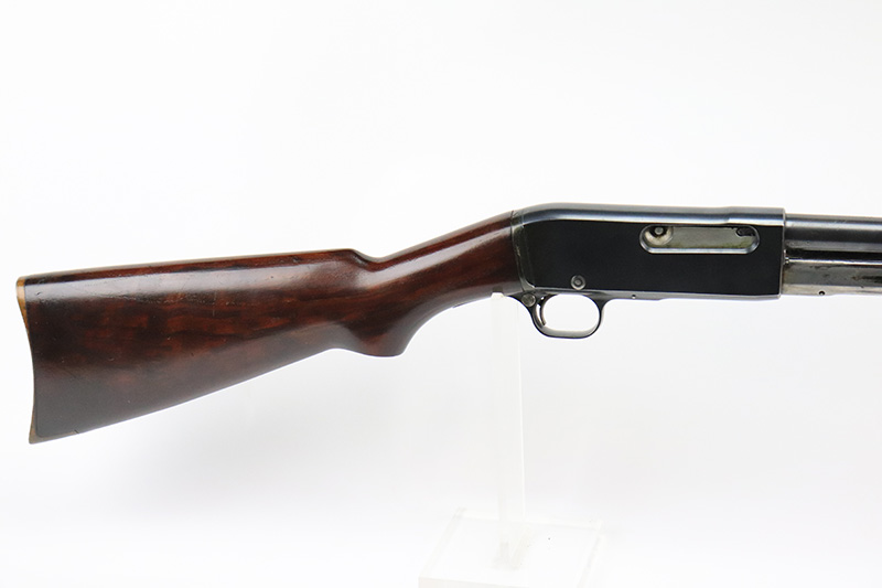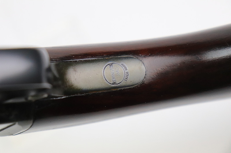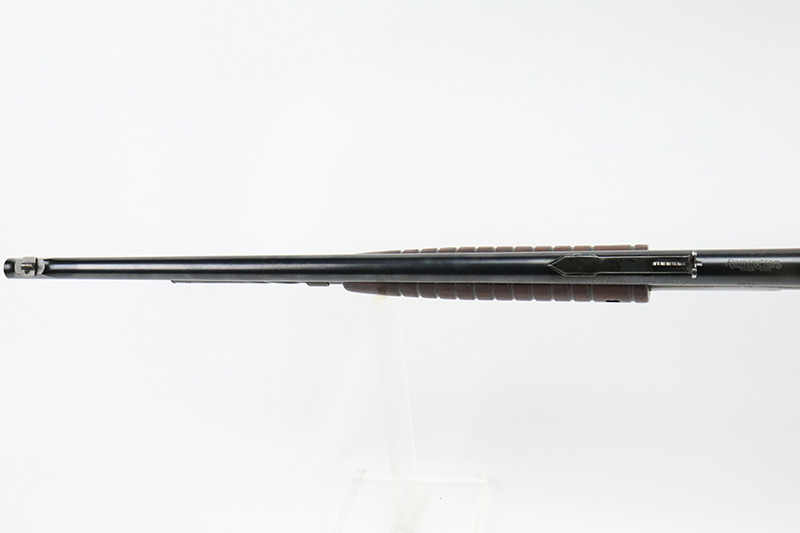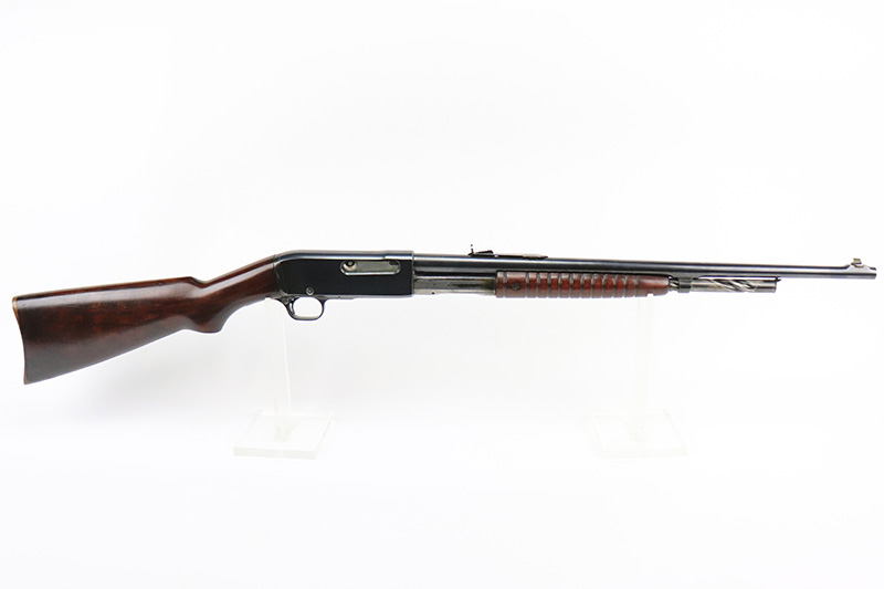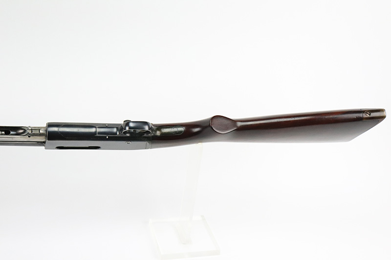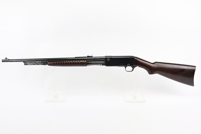 10/5/22 – The Remington Model 14 was a pump-action repeating rifle designed for the Remington Arms company by John Pedersen from 1912 to 1919, when it was changed to the 14A. Chambered in .35 Remington, this rifle is in excellent original condition. The receiver and barrel show only minor finish loss, though there is some staining on the sides of the receiver and behind the trigger guard that is likely caused by some varnish that was used on the stock. Wood parts are in great shape with no cracks or chips. Bore is minty with strong rifling. The Model 14’s design incorporated several innovative concepts. Among them was a spiral magazine tube to prevent bullet tips from contacting the primer of the cartridge in front of them. This magazine moved with the fore-end when pumping the action. Loading was through an opening in the magazine itself located between the fore-end and the receiver. The bolt unlocked via a button pressed through the ejection port though firing the gun automatically unlocked the bolt. The Model 14 was a takedown rifle that featured a single knurled screw on the left side of the receiver that was withdrawn allowing the trigger group and buttstock to be removed from the bottom of the gun.