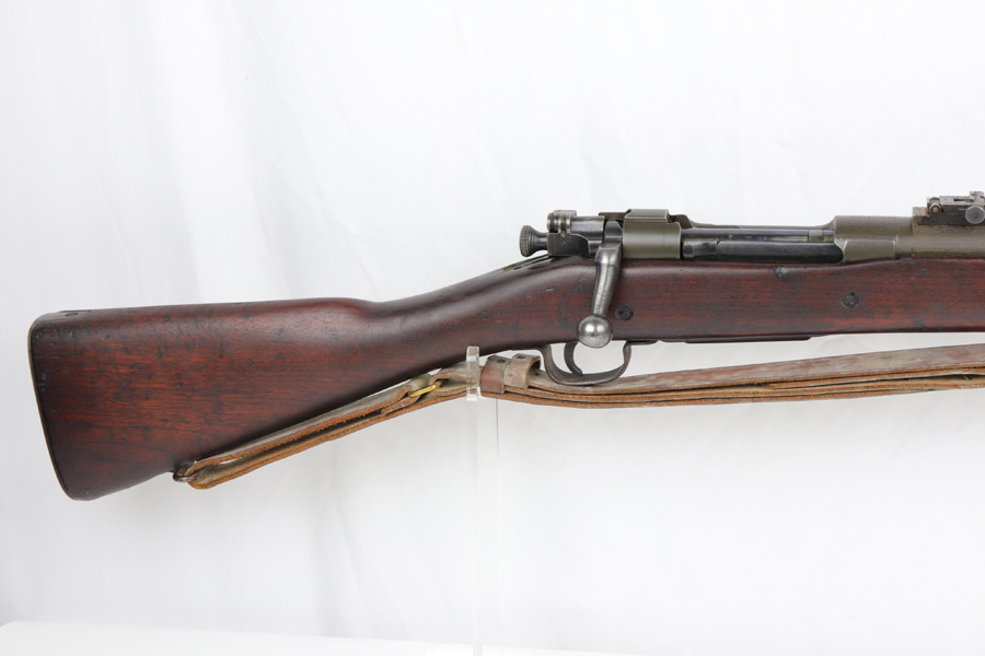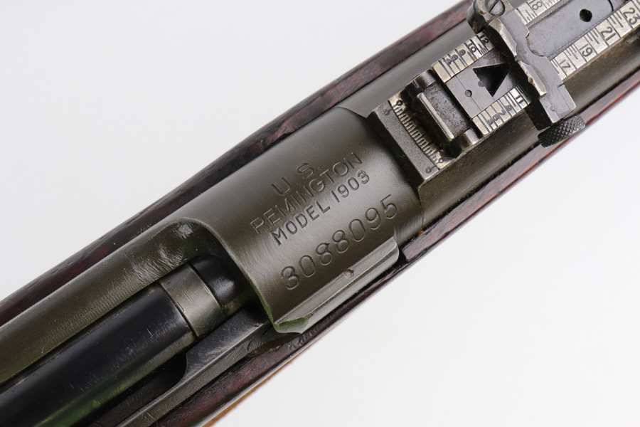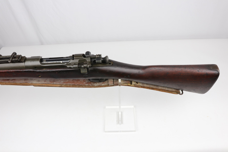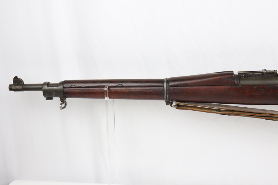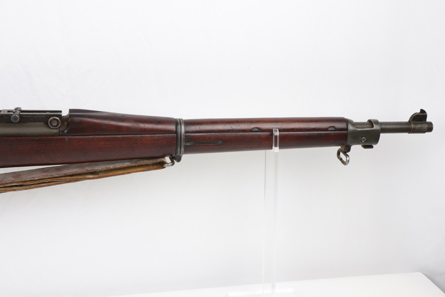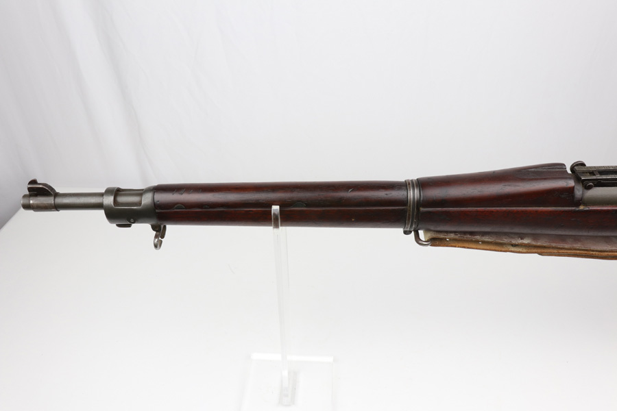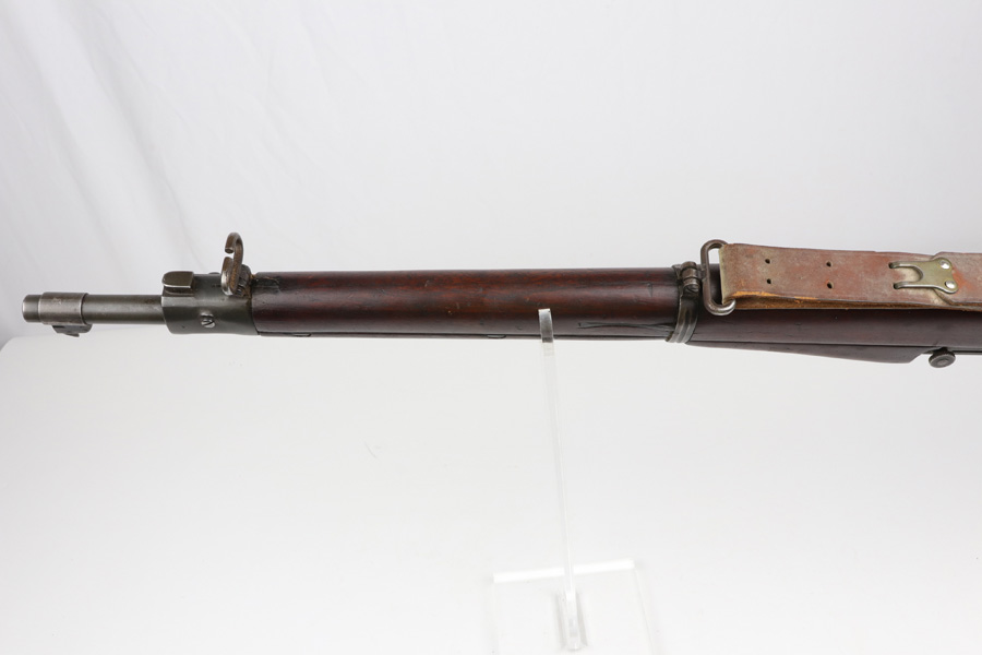 8/6/19 – This is an original Remington model 1903 rifle made during WW2. The barrel and serial number both indicate 1942 production. The rifle appears to be all original except for the stock. The stock doesn’t have hand grooves, and there’s no visible sign of a cartouche or inspector stamp. LIkely this is a replacement stock. The metal is excellent though, and appears all original. There’s some light thinning of the finish in a few small areas, as well as light finish loss on the muzzle end of the barrel / front sight. The bore is very nice with strong rifling, and some minor signs of use, 8/10 overall. Comes with a leather strap that appears period correct, but there’s no stamps or markings on the leather. There’s light mold throughout the leather as shown in photos.