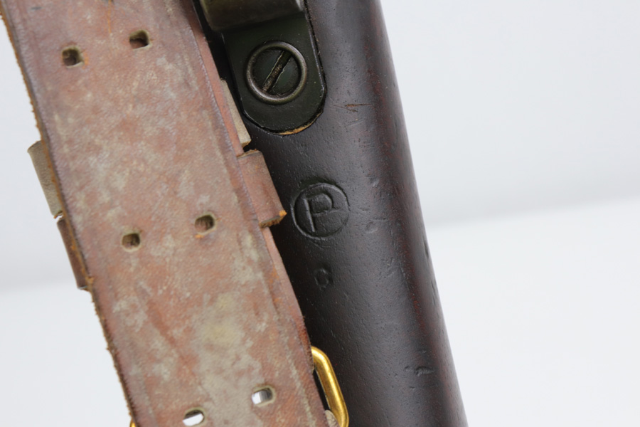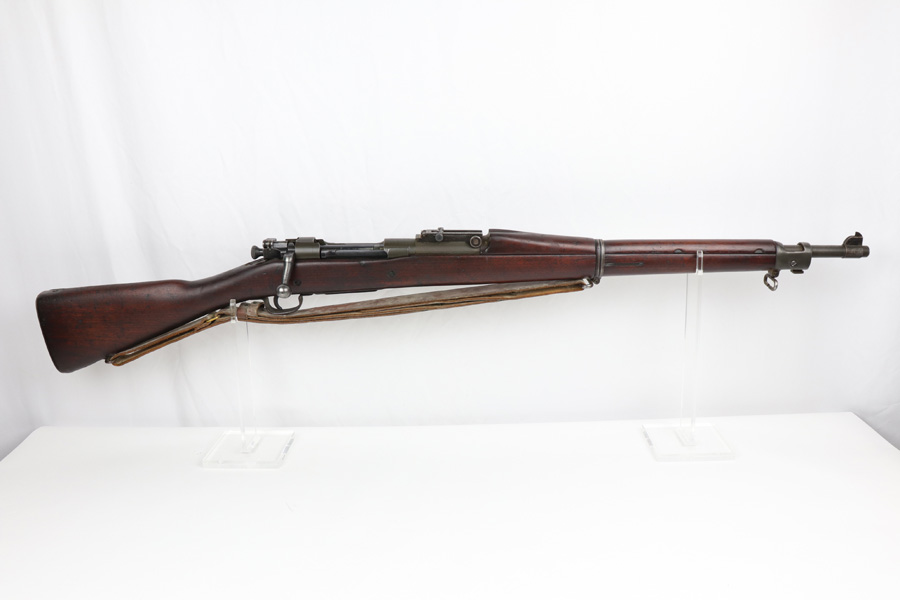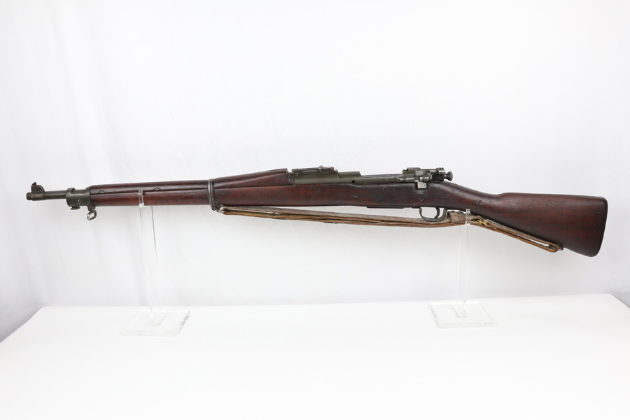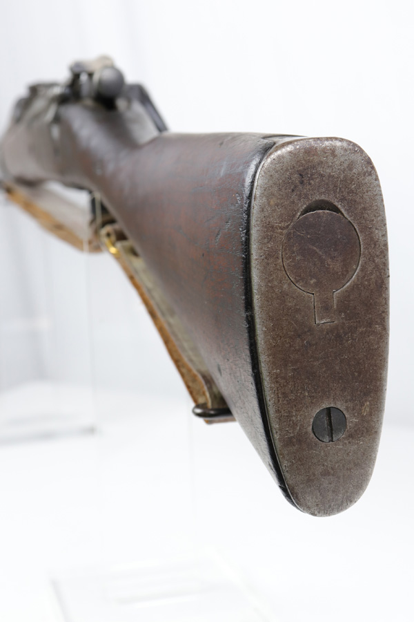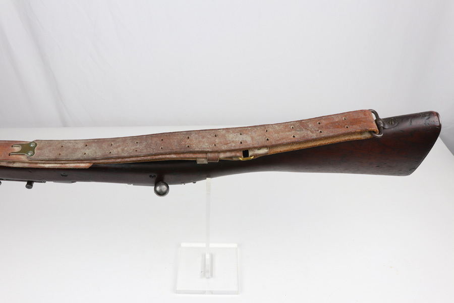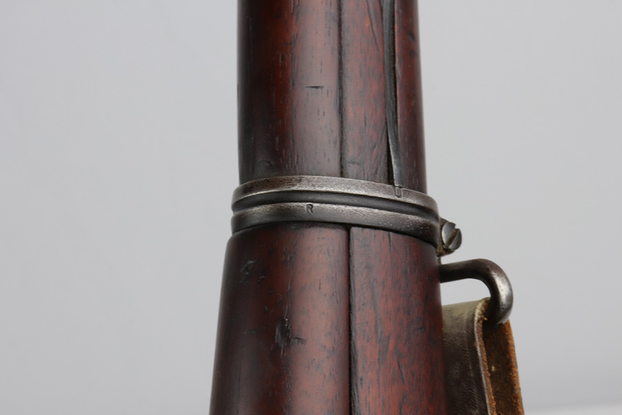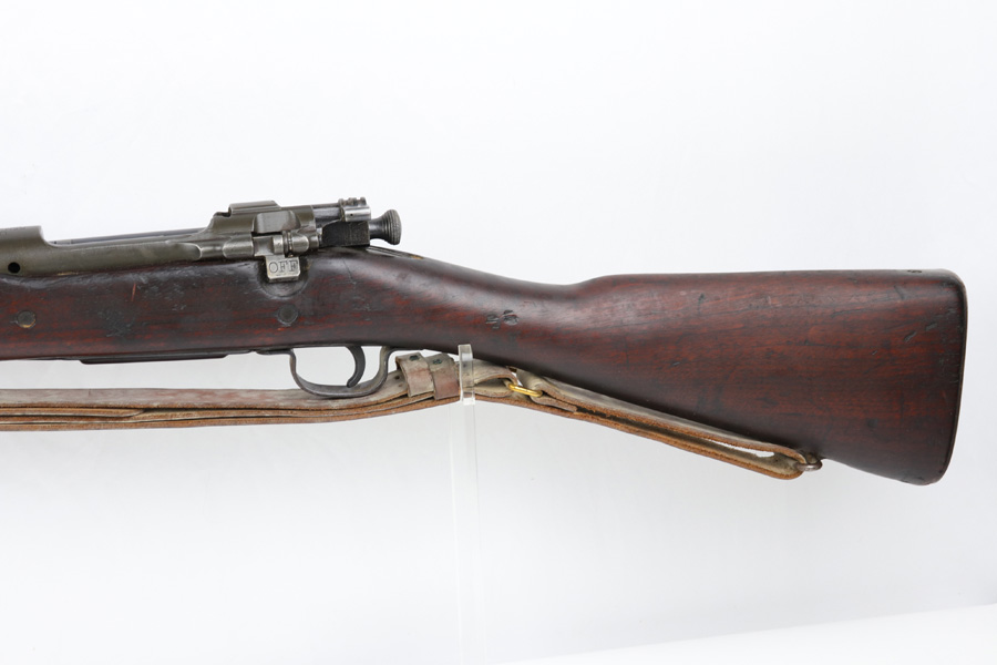 8/6/19 – This is an original Remington model 1903 rifle made during WW2. The barrel and serial number both indicate 1942 production. The rifle appears to be all original except for the stock. The stock doesn’t have hand grooves, and there’s no visible sign of a cartouche or inspector stamp. LIkely this is a replacement stock. The metal is excellent though, and appears all original. There’s some light thinning of the finish in a few small areas, as well as light finish loss on the muzzle end of the barrel / front sight. The bore is very nice with strong rifling, and some minor signs of use, 8/10 overall. Comes with a leather strap that appears period correct, but there’s no stamps or markings on the leather. There’s light mold throughout the leather as shown in photos.