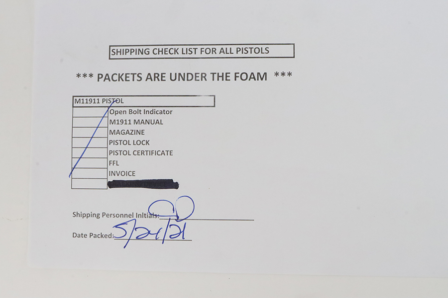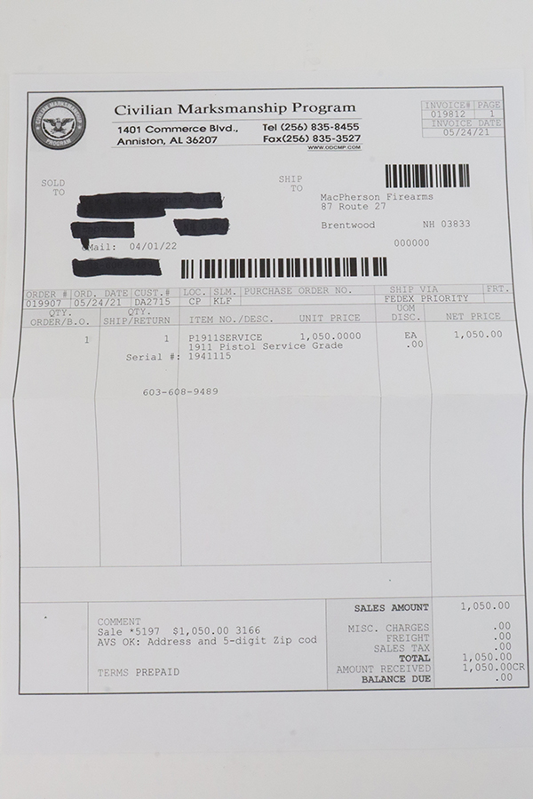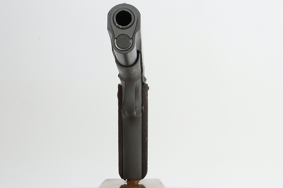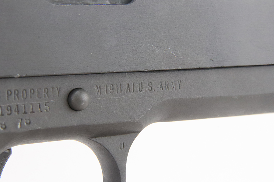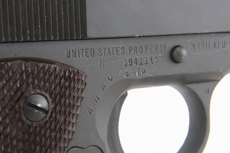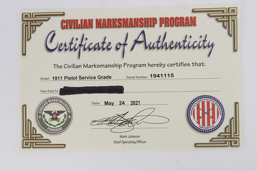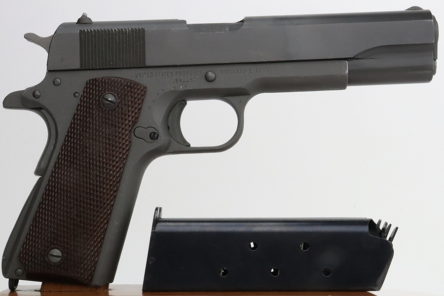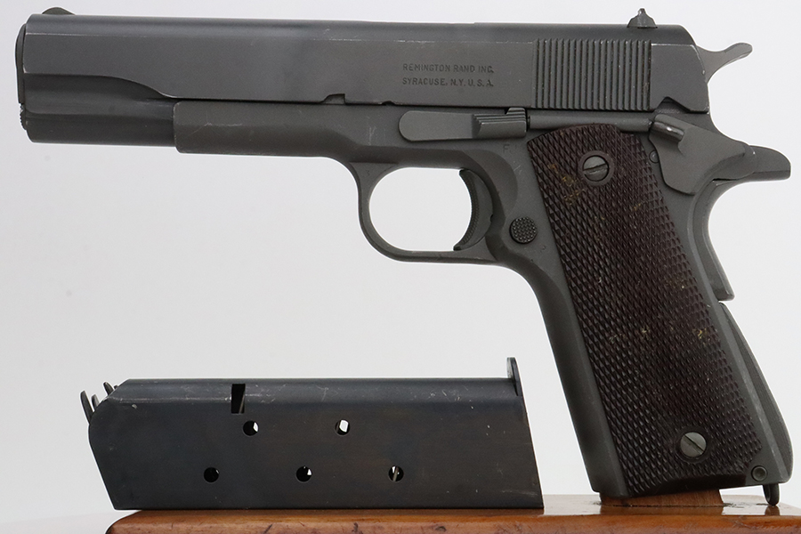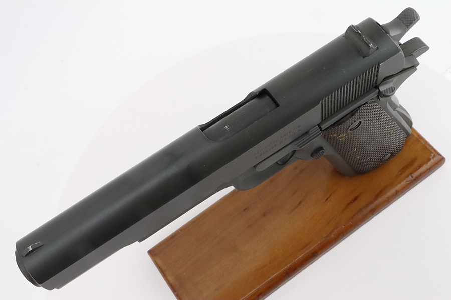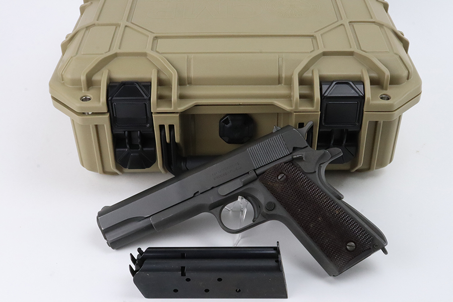2/28/24 – This is a Remington 1911A1 issued to the US military in 1944. Modern replacement barrel. It was restored and sold to the American public through the Civilian Marksmanship Program (CMP). It comes with its original CMP Certificate of Authenticity, owners manual, CMP Pelican-style case, and two post-war magazines. The gun itself has retained nearly all of its finish with just some very light scuffs here and there. Fitted with period-correct reddish plastic grips. Factory-new bore. The left locking closure on the case is broken off.