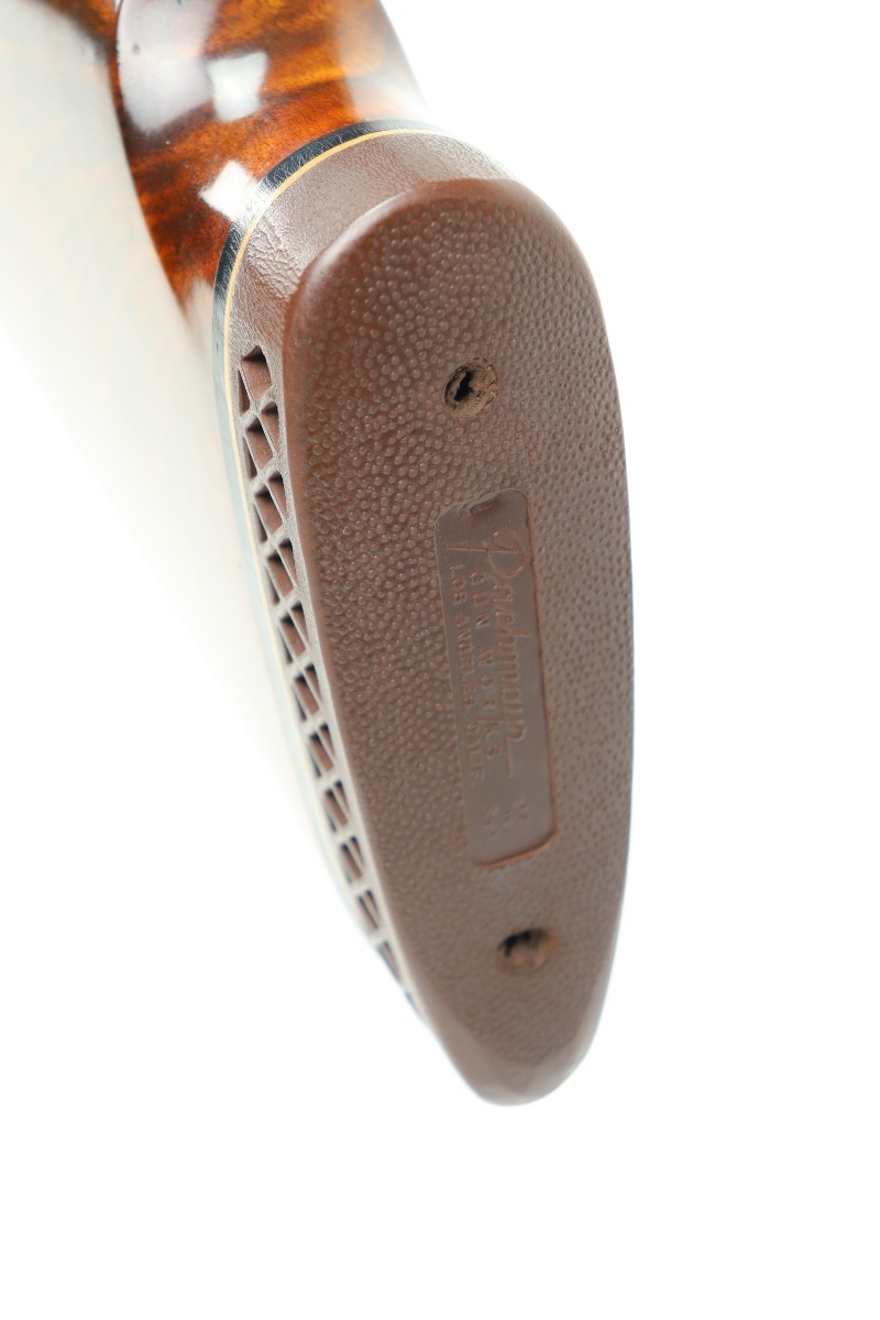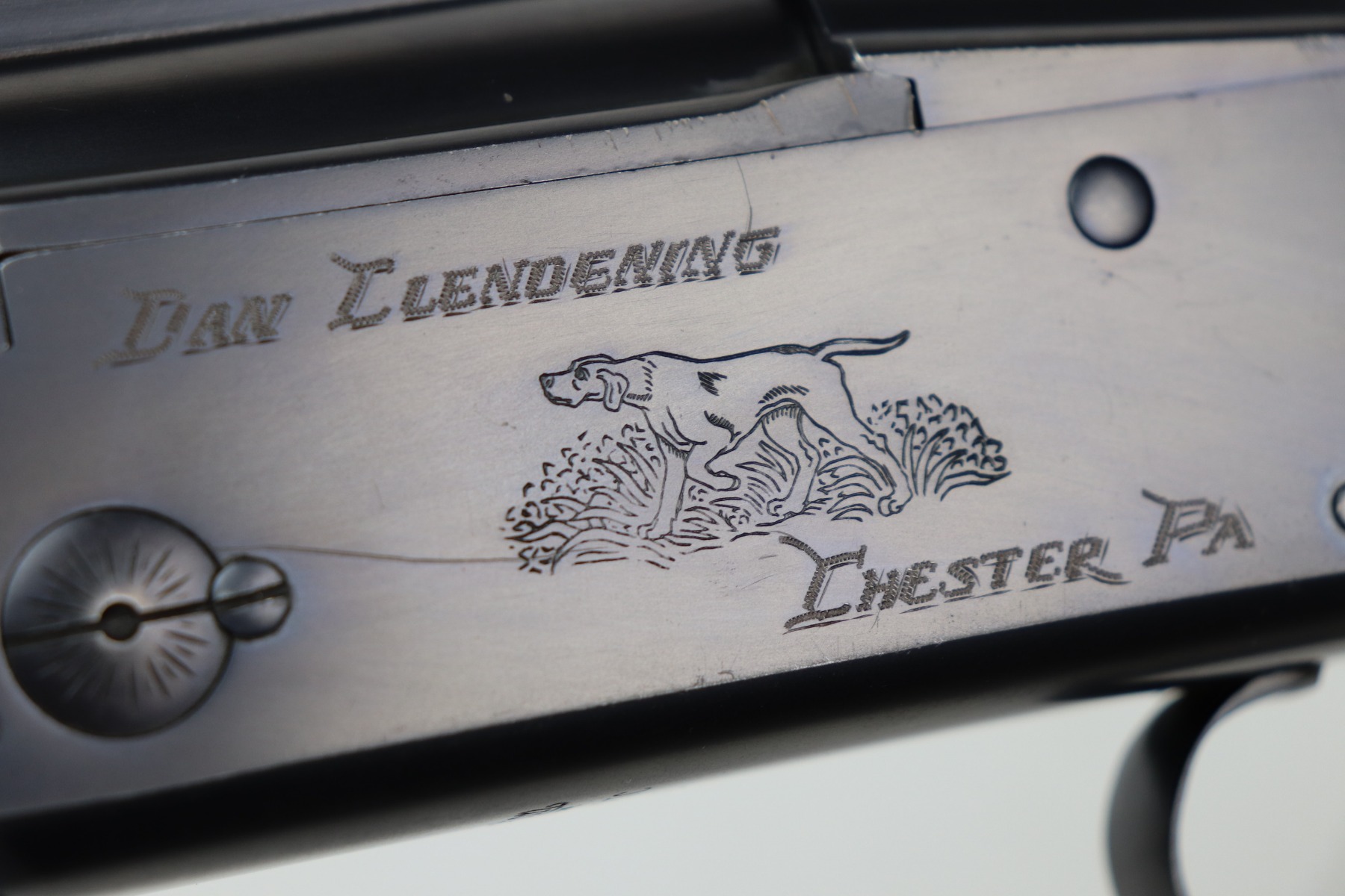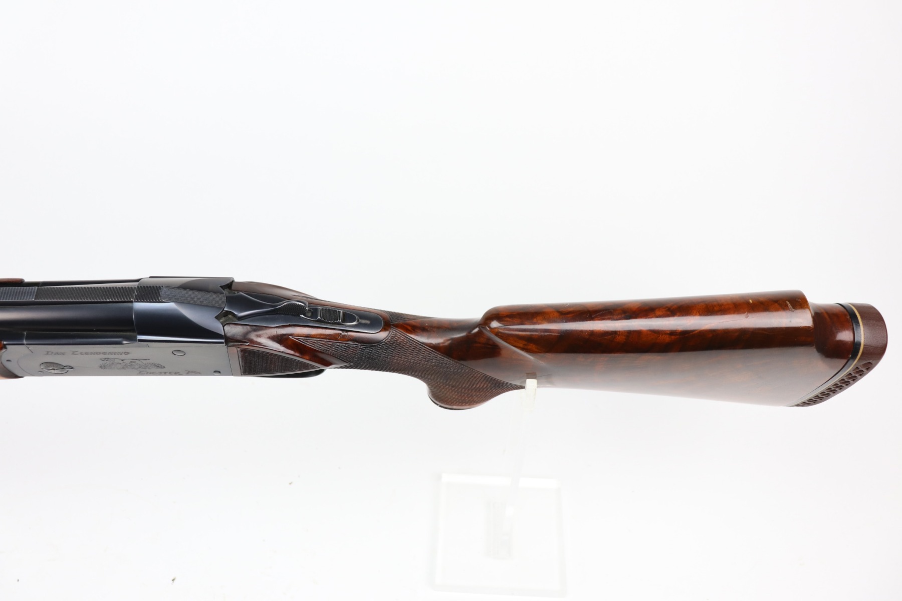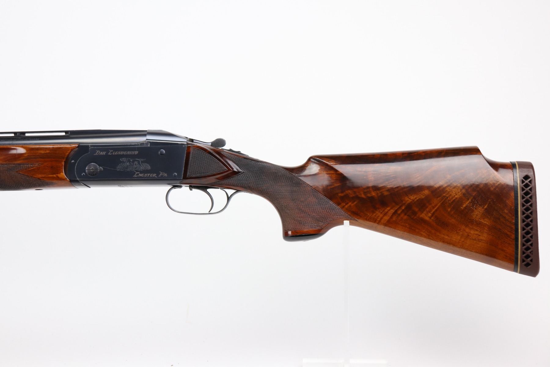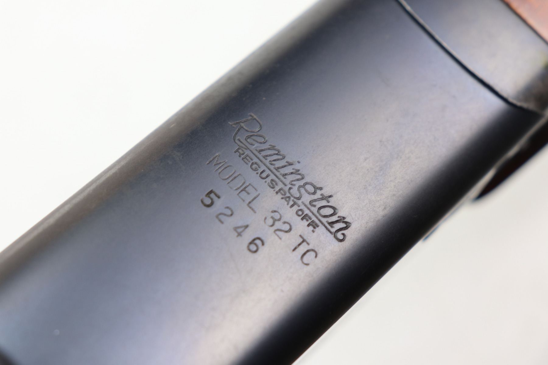 5/24/21 – This is an excellent example of a Remington Model 32TC over/under shotgun, made in 1937/38. This one is rare as only about 5,000 were made. The sides of the receiver feature a hunting dog scene. 30 inch barrel, full choke, 14.5 inch length of pull. Improved Miller Trigger. Someone’s name and place of birth is engraved on the left side of the receiver. The gun has retained almost all of its original bluing. There is minor muzzle wear, an area of wear on the right side of the receiver, and a scratch on the left side of the receiver. The stock is excellent – just a few minor dings. Small crack in left side of forend. The bores are minty. The sight bead position has been changed from the factory original location, likely just modified based on preference by a previous owner.