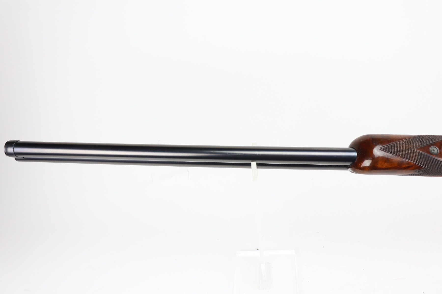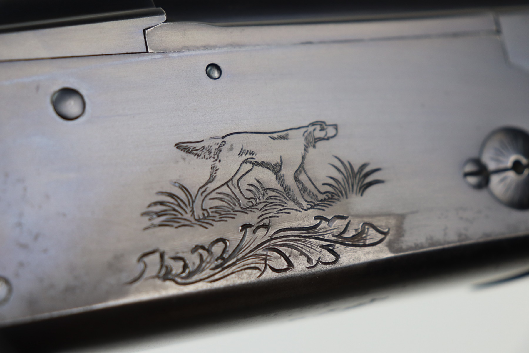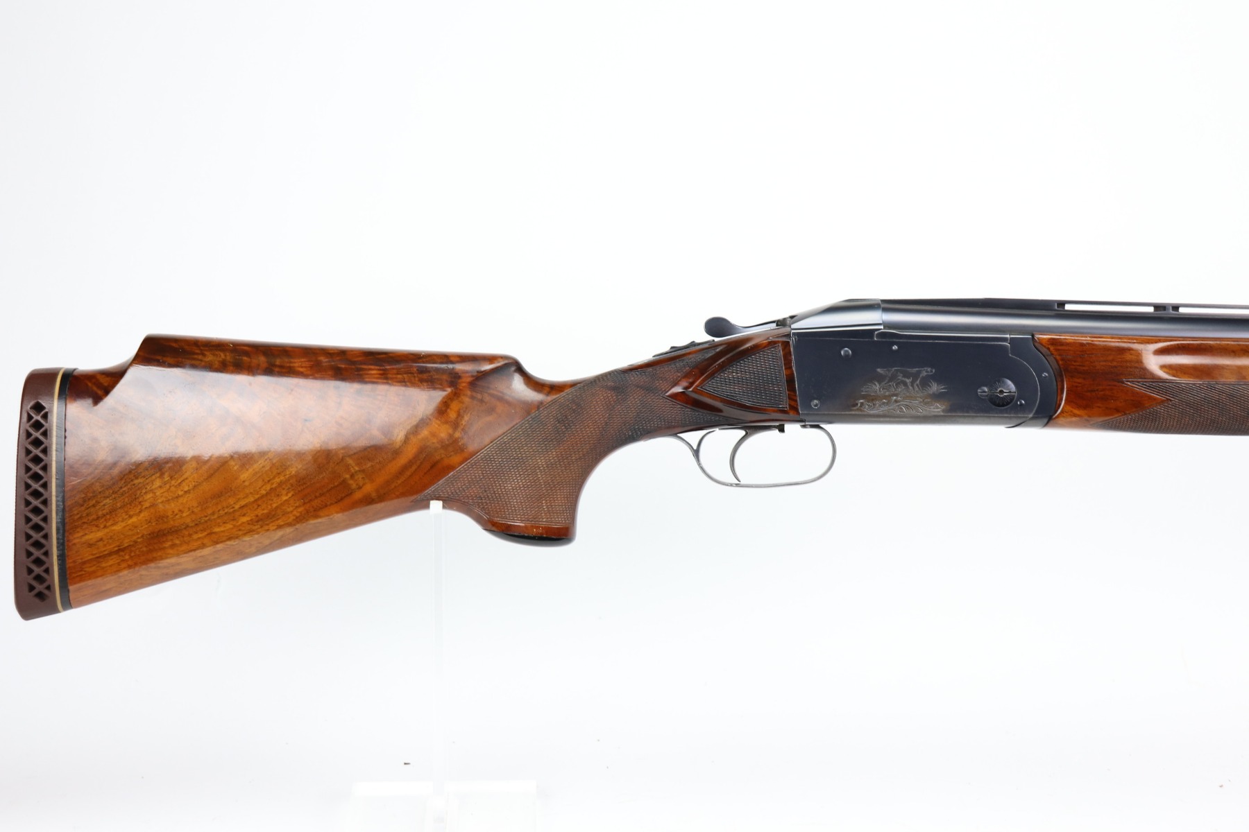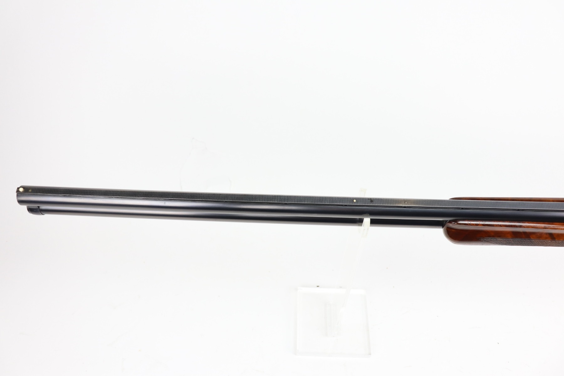 5/24/21 – This is an excellent example of a Remington Model 32TC over/under shotgun, made in 1937/38. This one is rare as only about 5,000 were made. The sides of the receiver feature a hunting dog scene. 30 inch barrel, full choke, 14.5 inch length of pull. Improved Miller Trigger. Someone’s name and place of birth is engraved on the left side of the receiver. The gun has retained almost all of its original bluing. There is minor muzzle wear, an area of wear on the right side of the receiver, and a scratch on the left side of the receiver. The stock is excellent – just a few minor dings. Small crack in left side of forend. The bores are minty. The sight bead position has been changed from the factory original location, likely just modified based on preference by a previous owner.