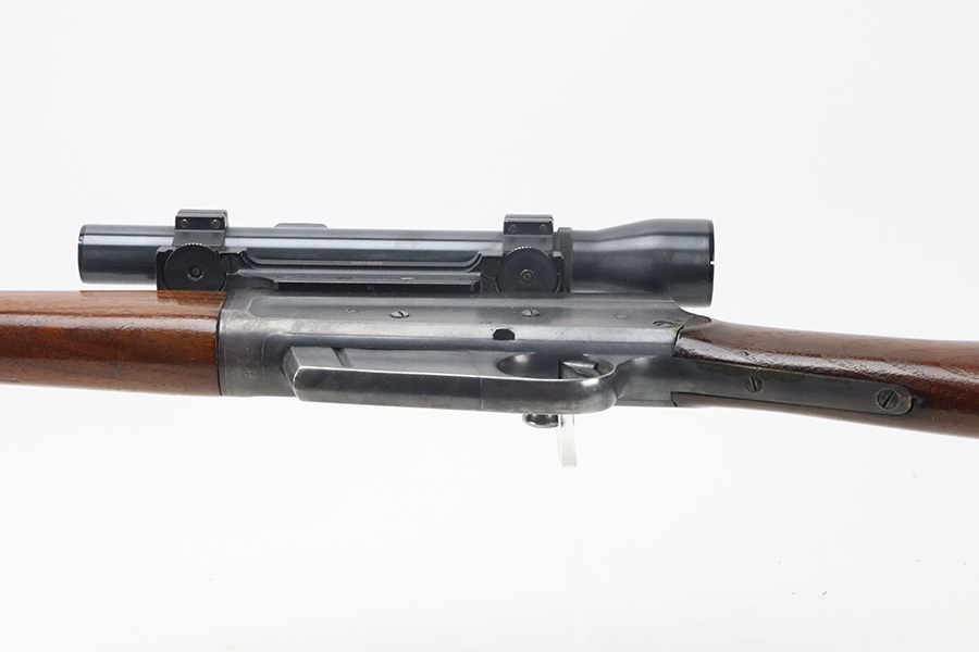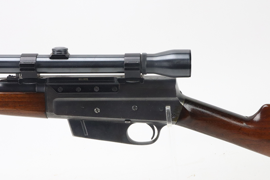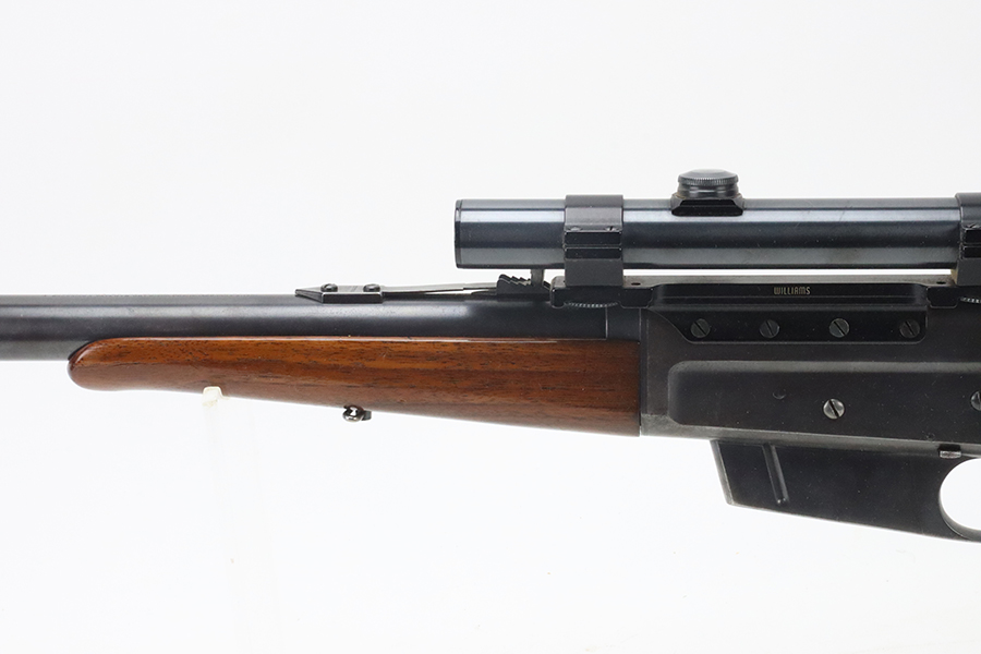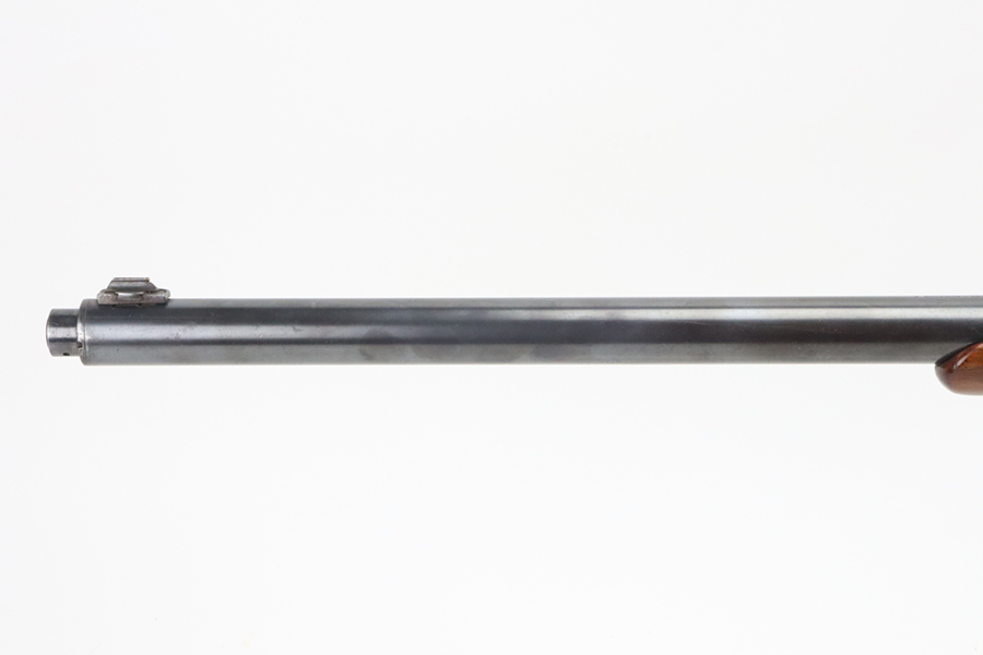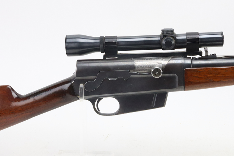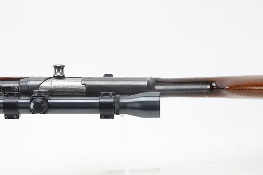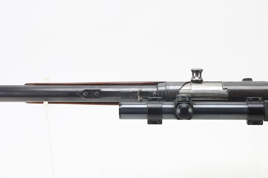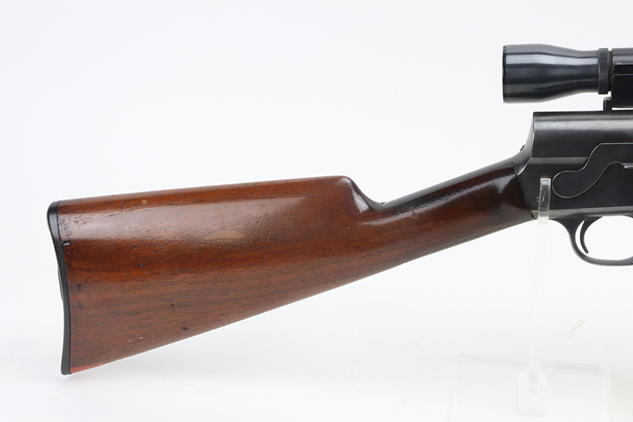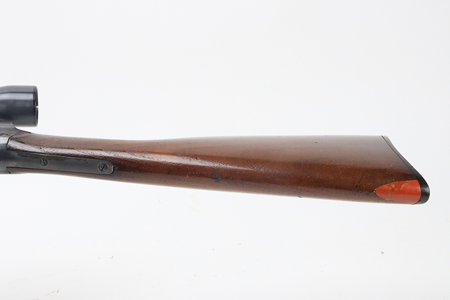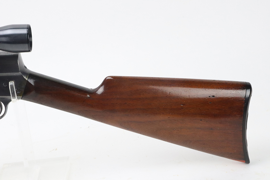 5/20/24 – This is an excellent example of a Remington Model 8 semi auto rifle, manufactured in 1906-36 and chambered in .35 Remington. Equipped with a nice rifle scope – very nice optics, but the lenses good use a good cleaning. The gun’s original bluing rates about 95%. There is minor wear on the underside of the receiver, a few small marks on the receiver, and one small spot of minor wear on the right side of the receiver. The wood stock is nice but has been lightly lacquered. Small repair in the butt stock. Excellent bore.