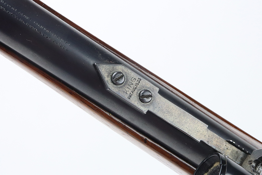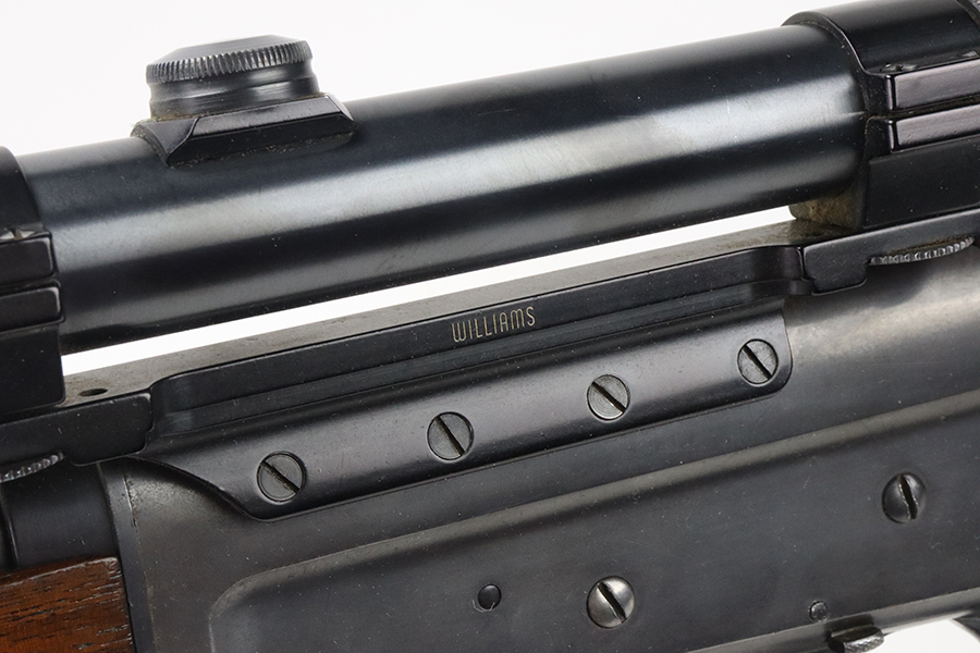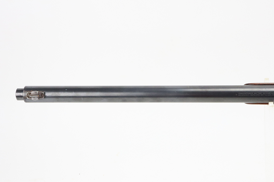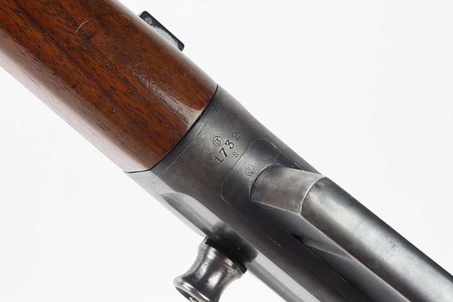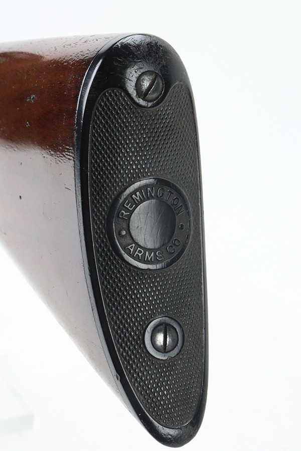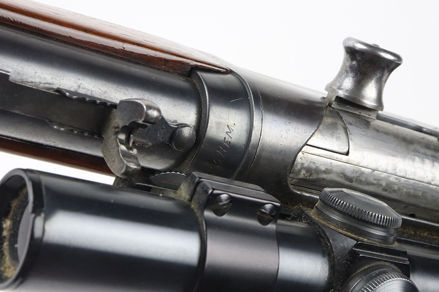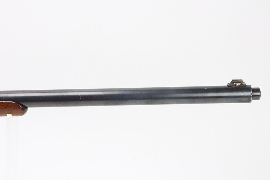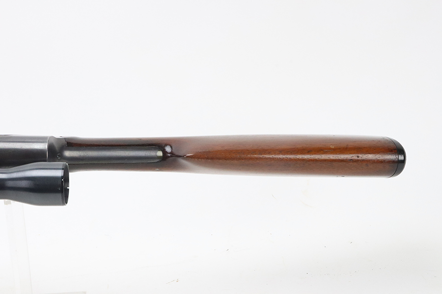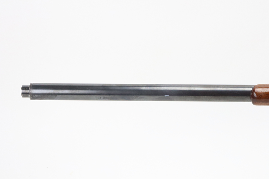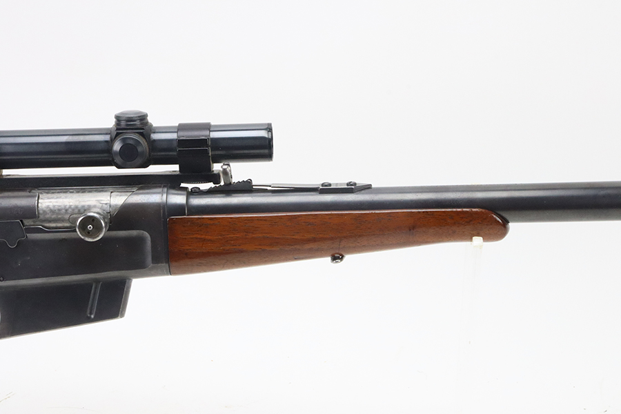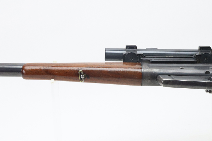 5/20/24 – This is an excellent example of a Remington Model 8 semi auto rifle, manufactured in 1906-36 and chambered in .35 Remington. Equipped with a nice rifle scope – very nice optics, but the lenses good use a good cleaning. The gun’s original bluing rates about 95%. There is minor wear on the underside of the receiver, a few small marks on the receiver, and one small spot of minor wear on the right side of the receiver. The wood stock is nice but has been lightly lacquered. Small repair in the butt stock. Excellent bore.