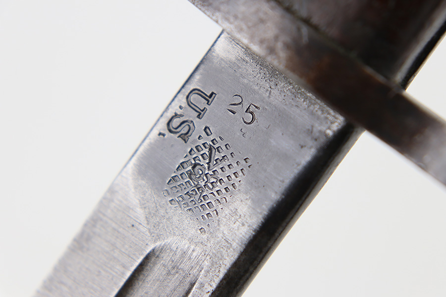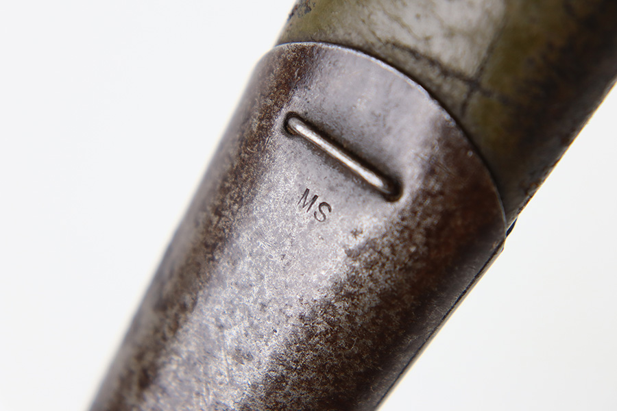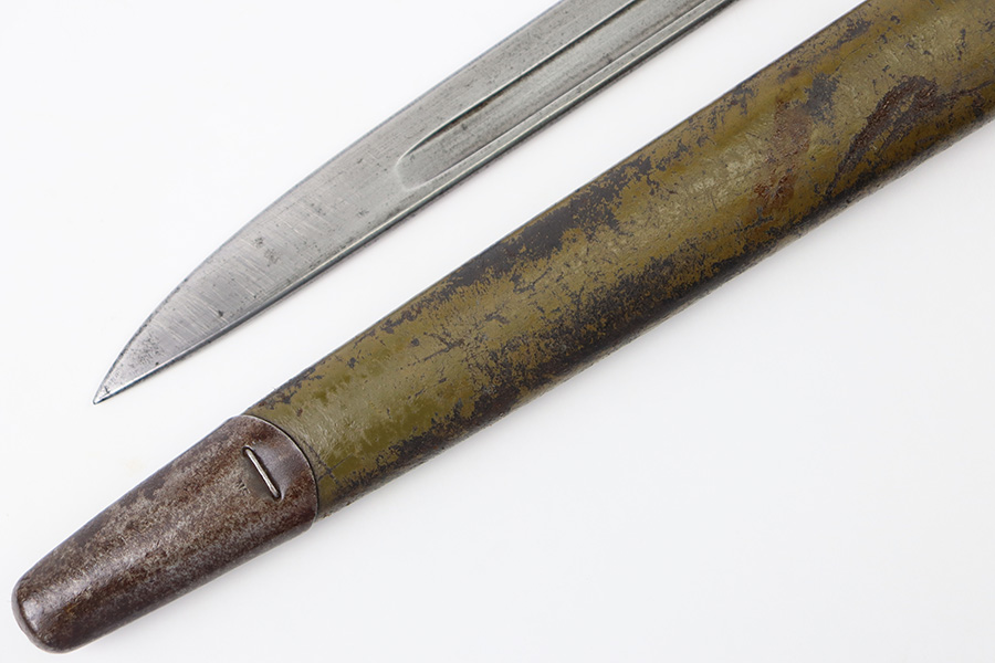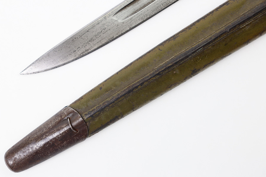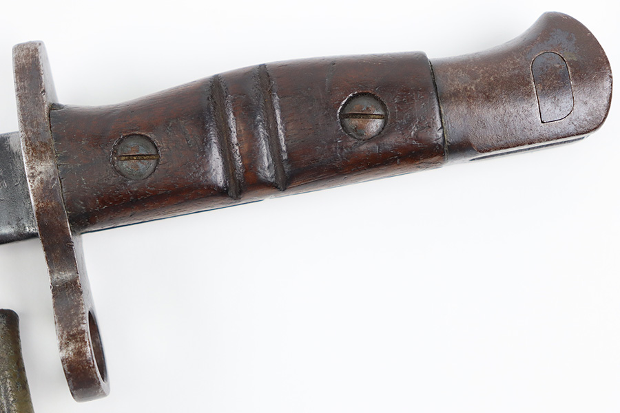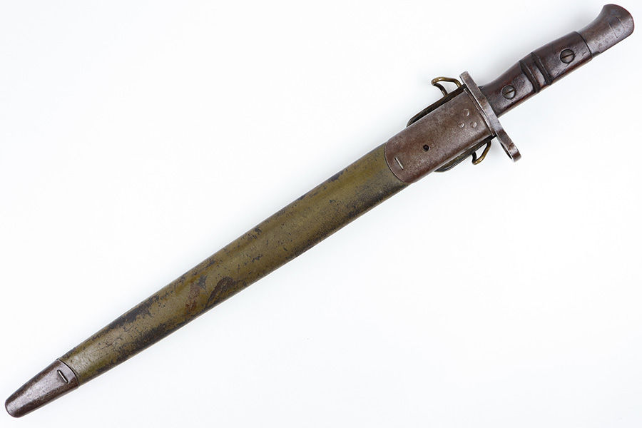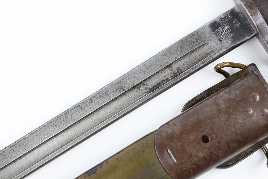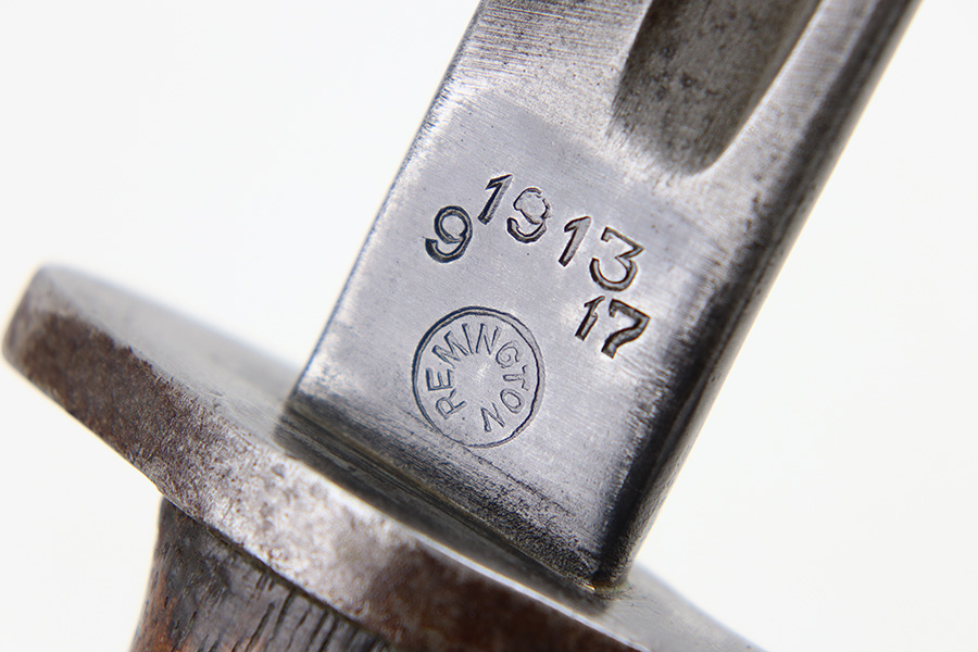 10/25/23 – This is a WW1 era Remington made P1913 Enfield Rifle bayonet. The bayonet is in great overall condition and comes with an original scabbard. The bayonet blade has some dark surface oxidation and spotty discoloration, but no rust or pitting. The edge is clean with no nicks or dings, and only some very light signs of sharpening. The base of the blade is British proof stamped, and US stamped on one side, and the other side is maker stamped and 1917 dated (with a 1913 designation stamp). The hand guard and pommel have dark browning patina throughout. Nice wood handles. The scabbard has a very faint maker stamp on the backside but it’s too hard to decipher. Great overall condition on the scabbard with natural surface wear and aging throughout.