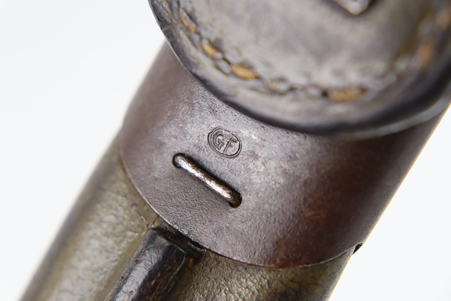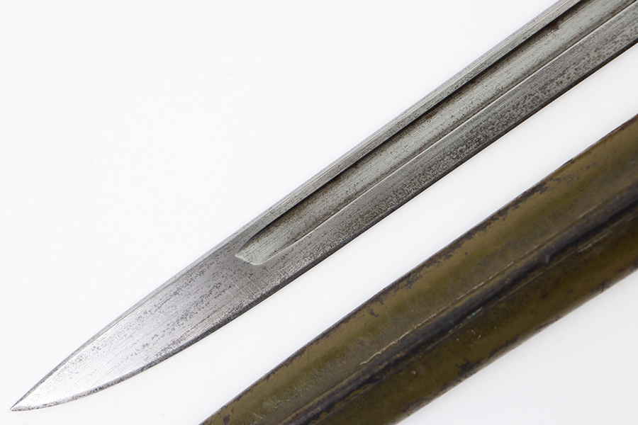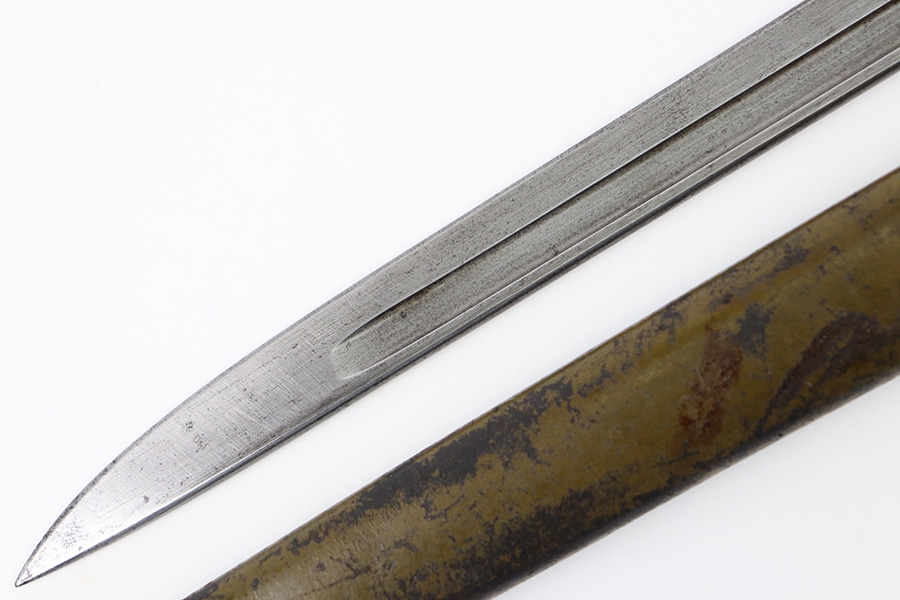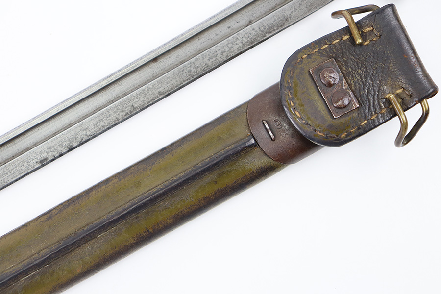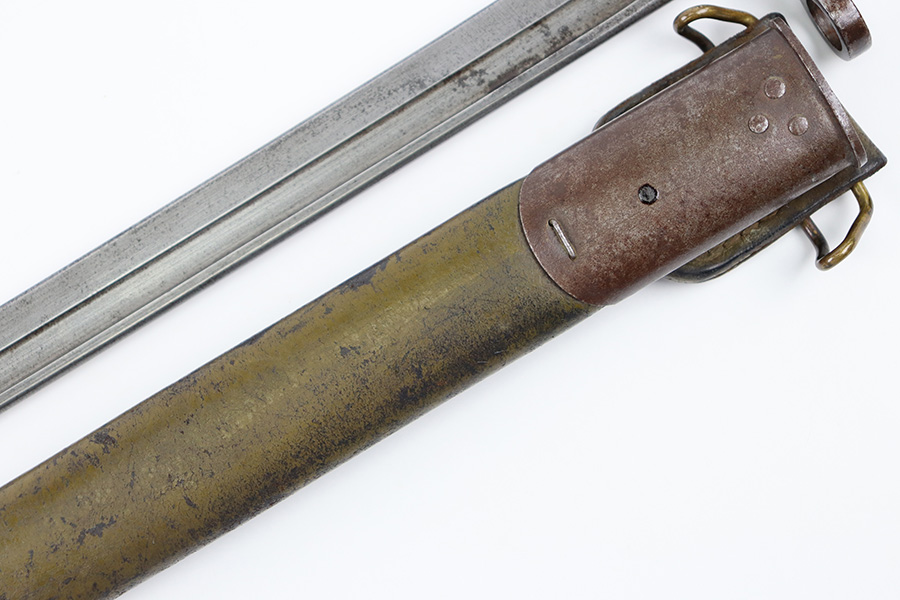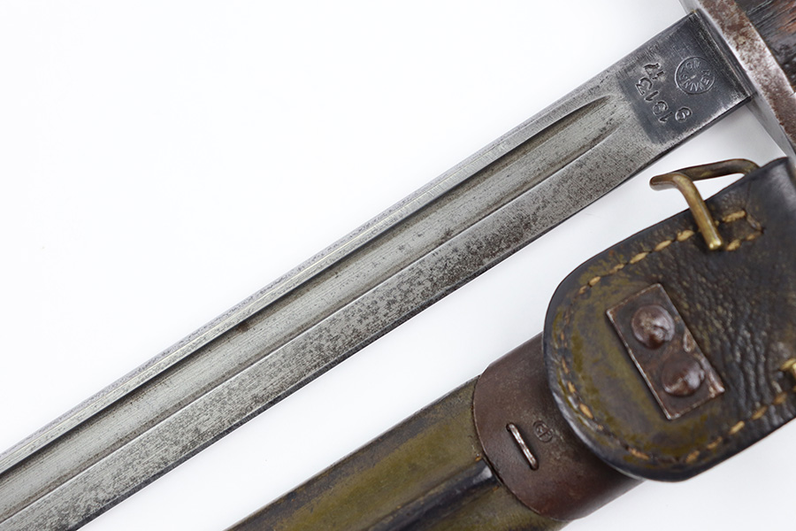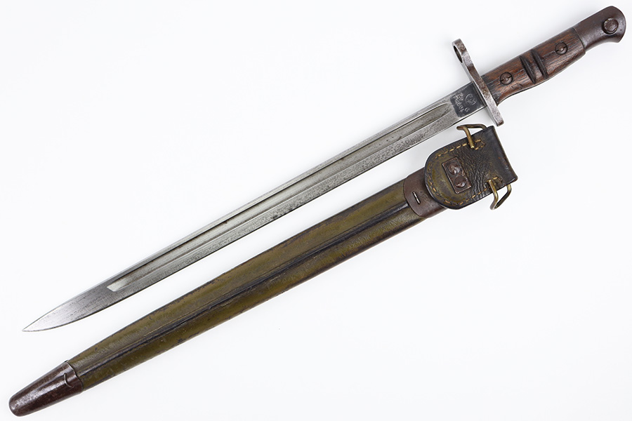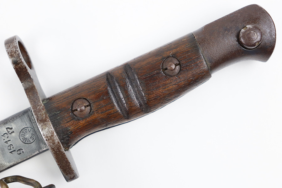 10/25/23 – This is a WW1 era Remington made P1913 Enfield Rifle bayonet. The bayonet is in great overall condition and comes with an original scabbard. The bayonet blade has some dark surface oxidation and spotty discoloration, but no rust or pitting. The edge is clean with no nicks or dings, and only some very light signs of sharpening. The base of the blade is British proof stamped, and US stamped on one side, and the other side is maker stamped and 1917 dated (with a 1913 designation stamp). The hand guard and pommel have dark browning patina throughout. Nice wood handles. The scabbard has a very faint maker stamp on the backside but it’s too hard to decipher. Great overall condition on the scabbard with natural surface wear and aging throughout.