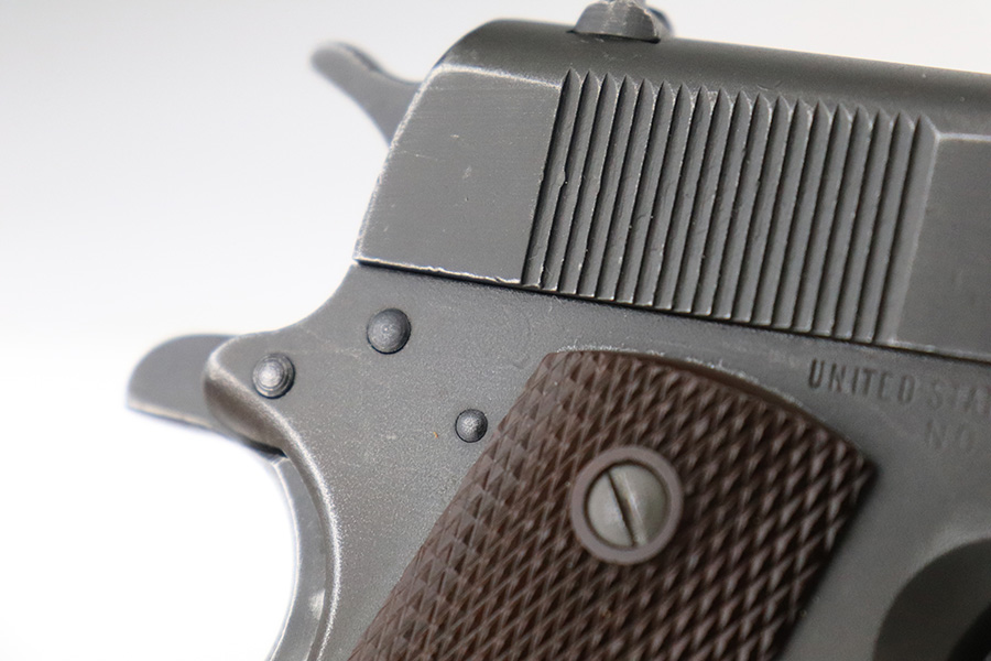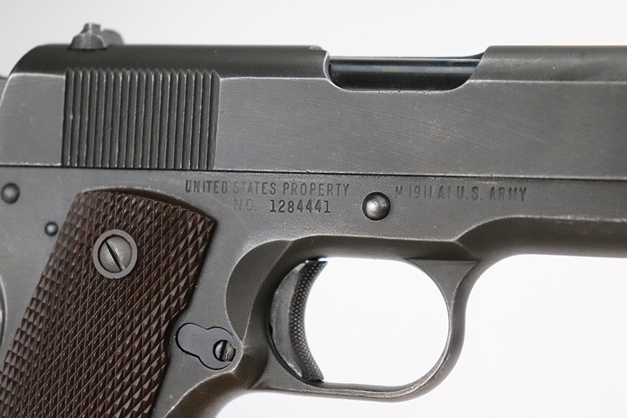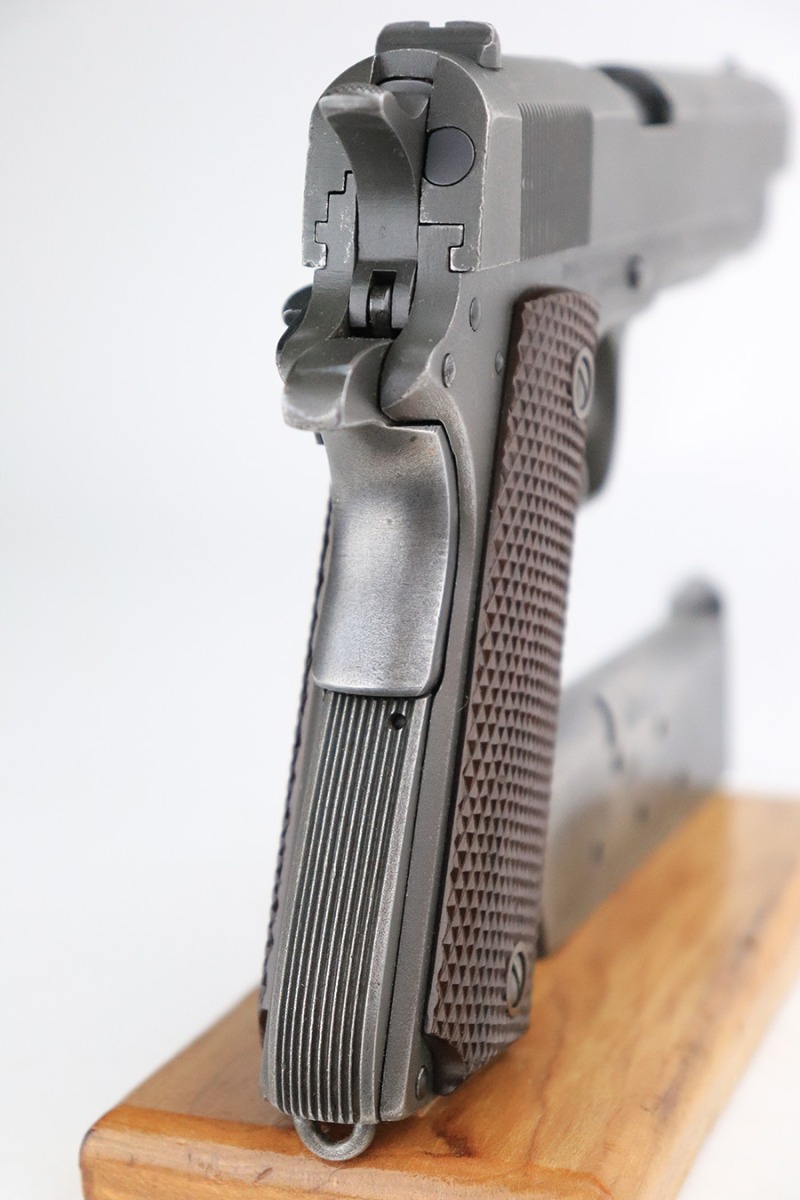 7/29/22 – This is a Remington 1911A1 from late 1943. It’s US military inspected and issued, with proper third variation slide. The finish on the slide is in very good condition with minor high wear, and is the original parkerized finish. The frame has been reparkerized though, and the crossed cannons cartouche is mostly washed out now. Proper HS barrel. ‘S’ marked magazine. Bore is generally shiny with strong rifling.