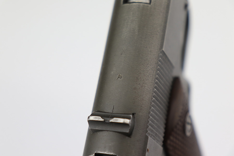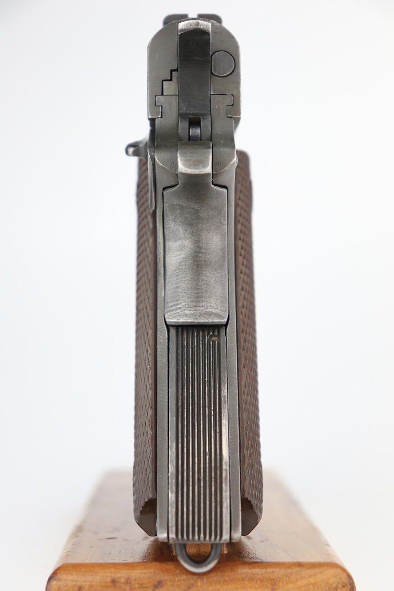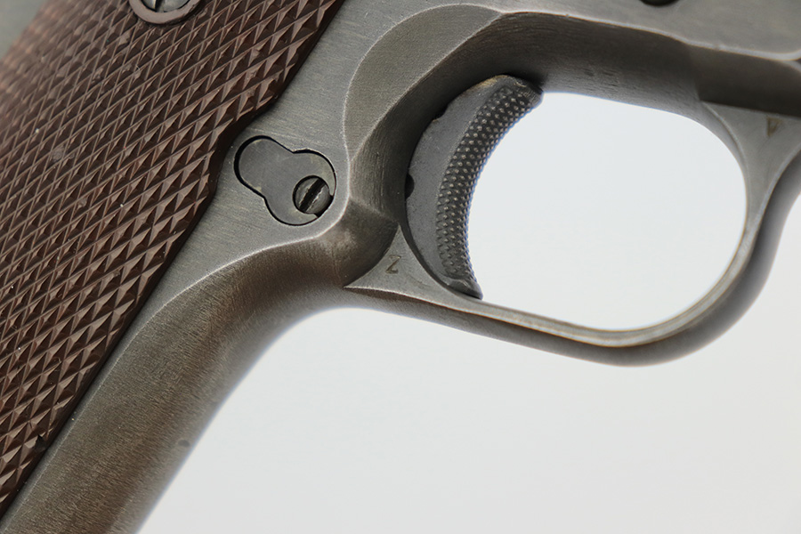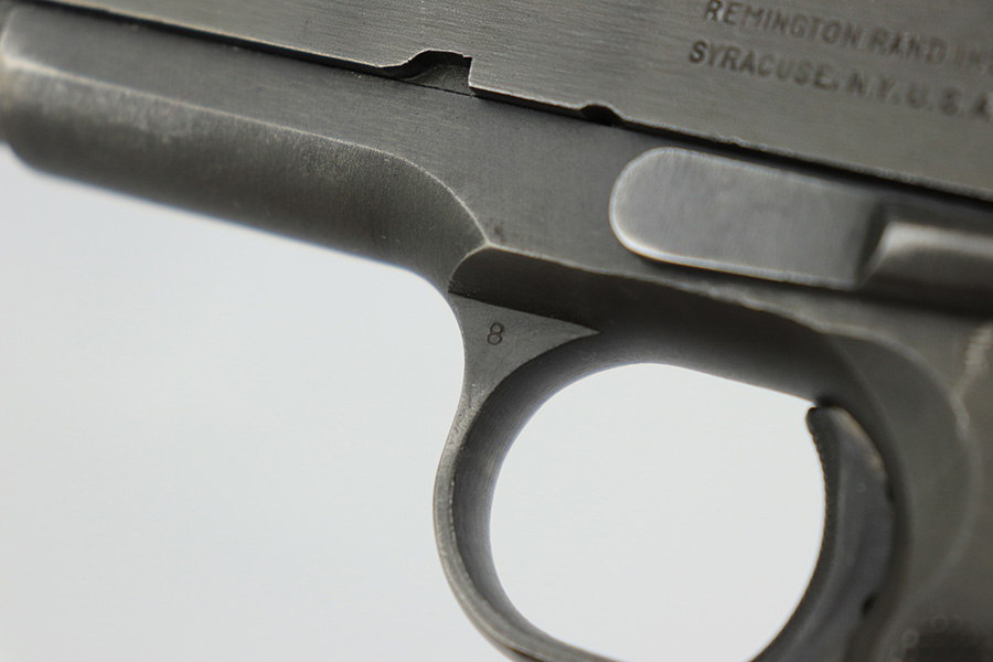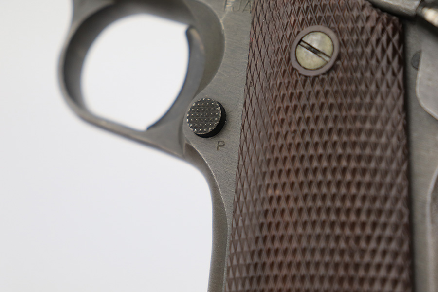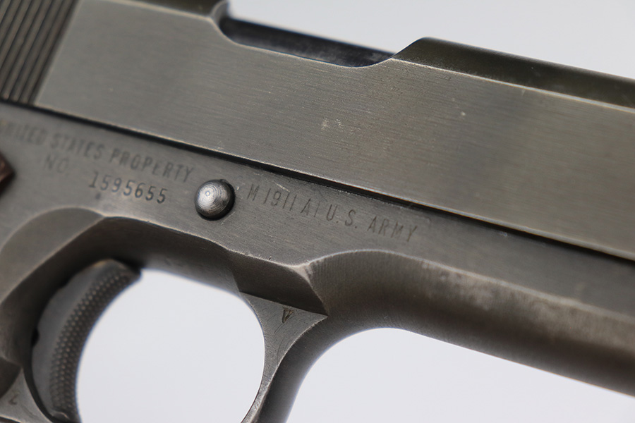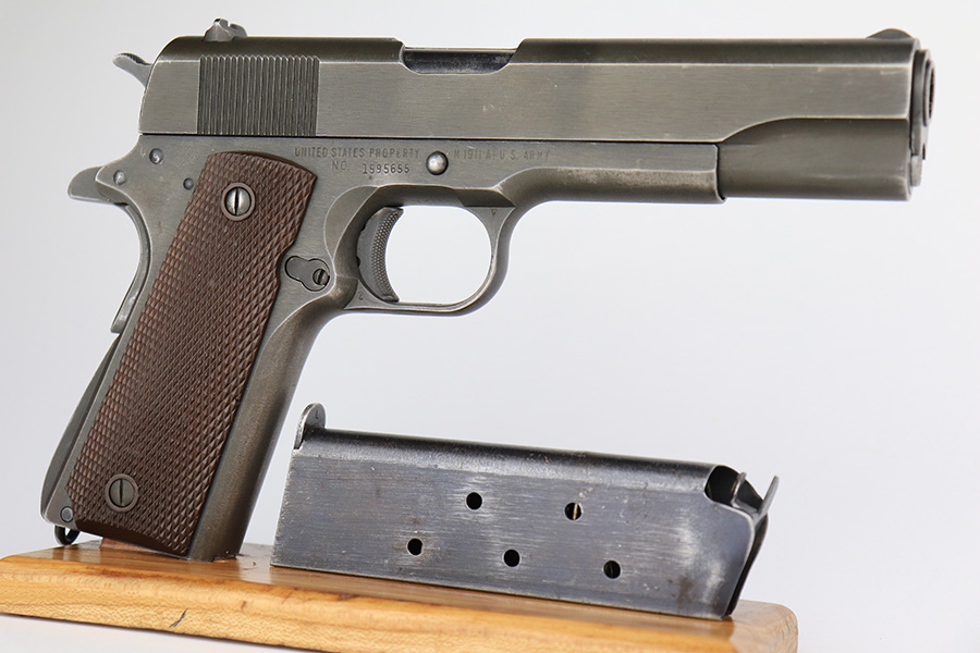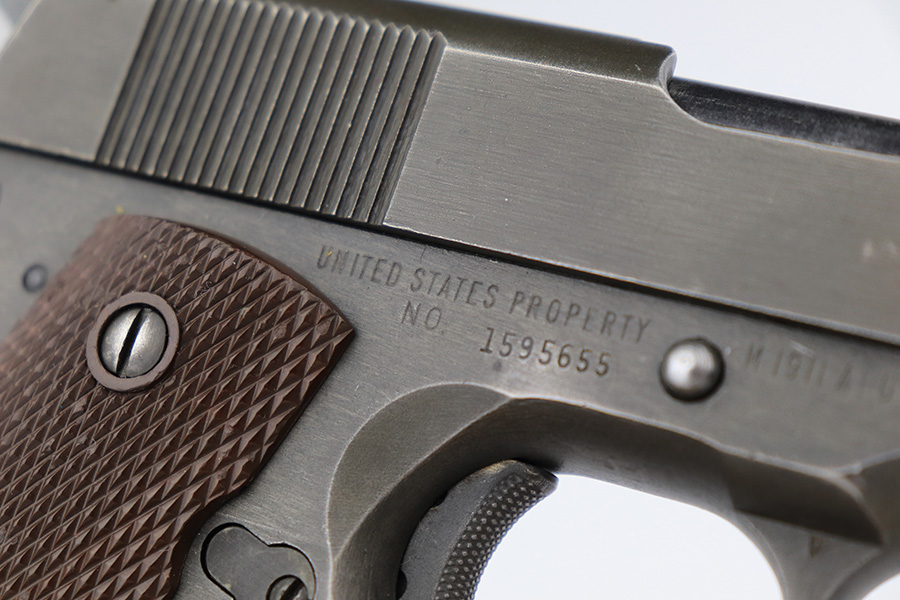 3/28/2023 – This is a Remington Rand Model 1911A1 issued to the US military in early 1944. It is “United States Property” marked, has the proper “FJA” inspection stamp, and has a cross-cannon military cartouche on the right side of the frame. Proper High Standard barrel. The gun has retained about 94-95% of its original parkerized finish. There is some spotty wear in a few areas along the top of the slide, and mild thinning on the grip safety and front strap. Excellent bore and original grips with sharp checkering. Comes with period-correct “Little” magazine.
