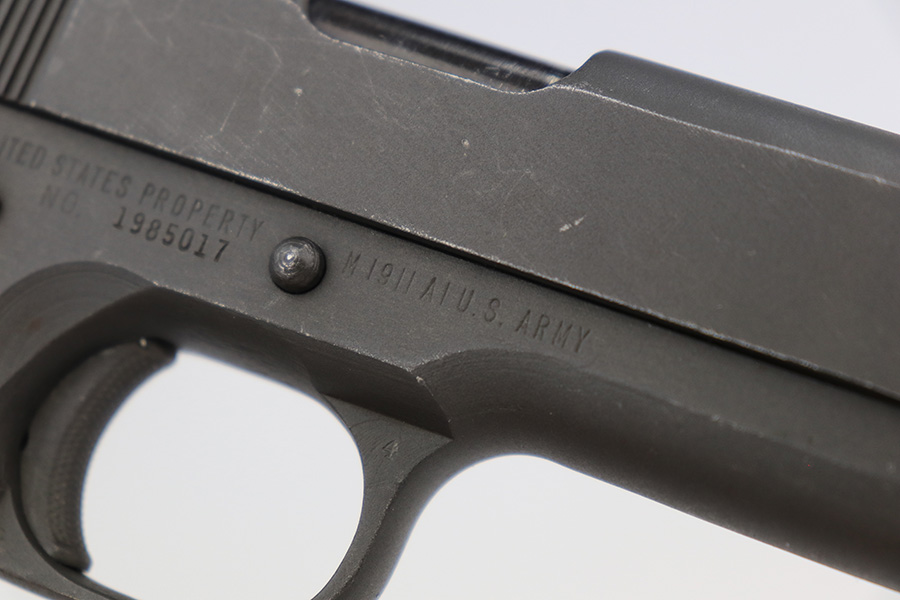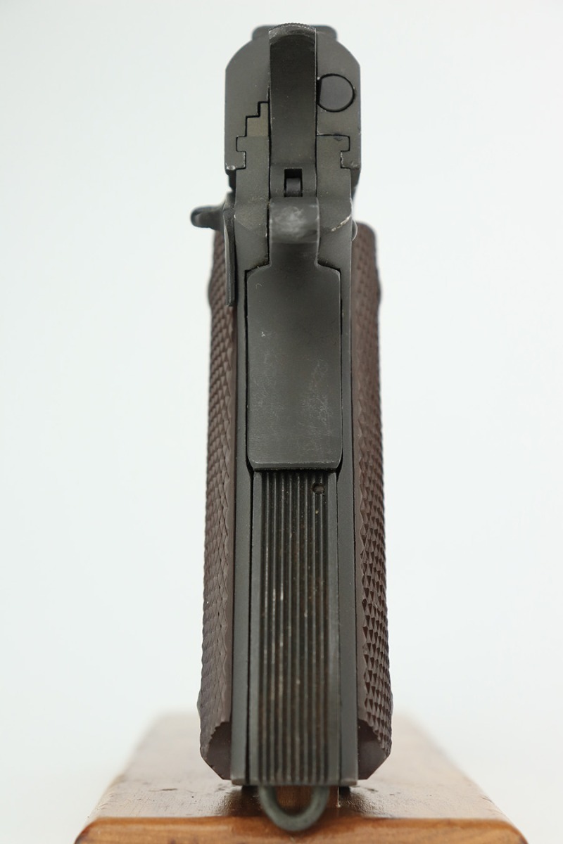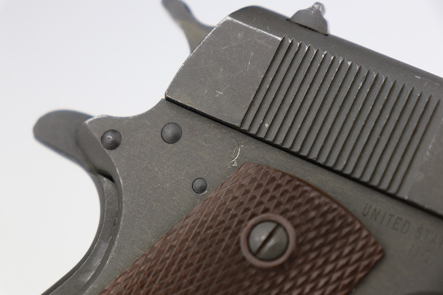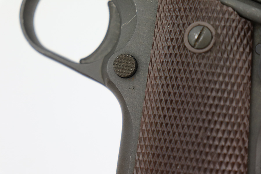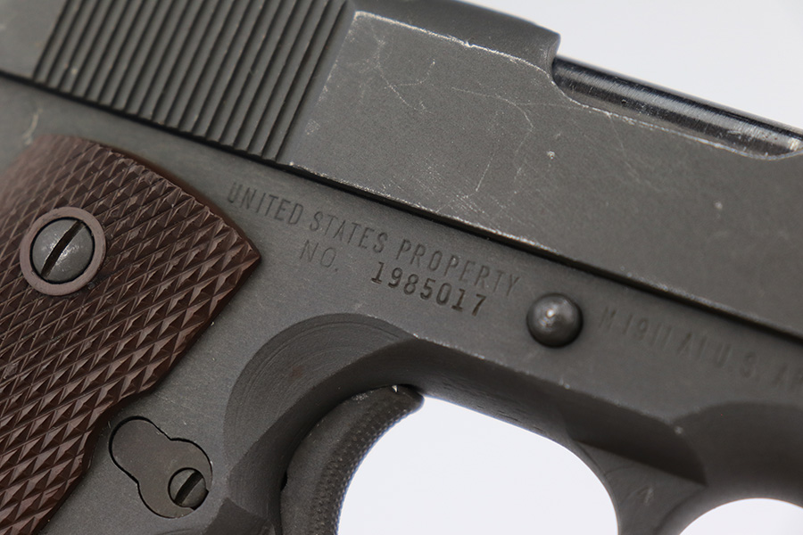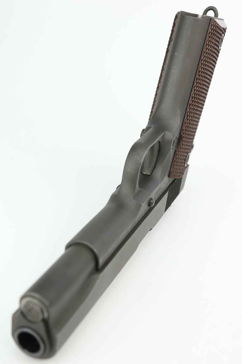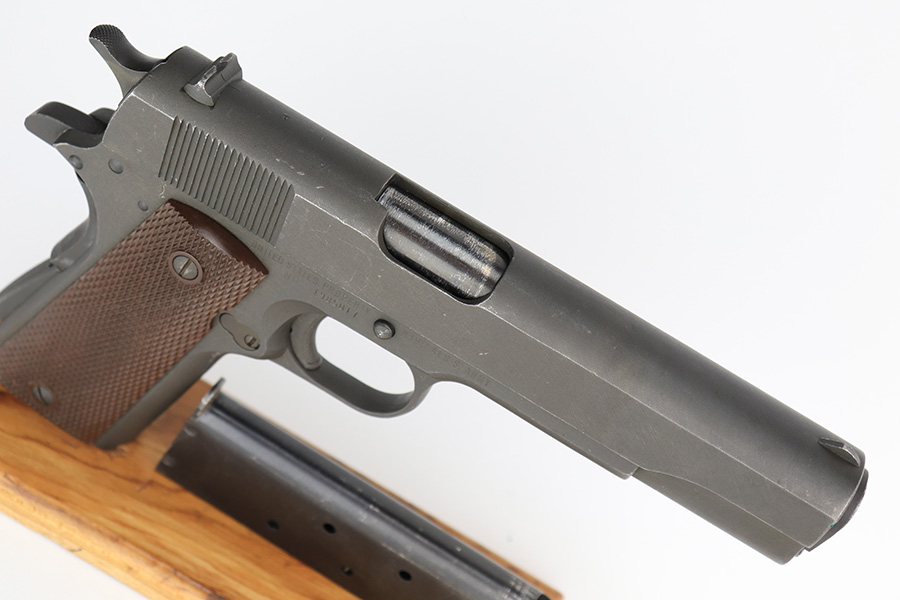 4/10/23 – This is an excellent and original Remington Rand 1911A1 from 1944. Original slide and frame, with proper Flannery barrel. Minor high edge wear only, with about 97% of the original parkerized finish remaining. Excellent grips with sharp checkering. Unmarked WW2 mag. Minty bore.