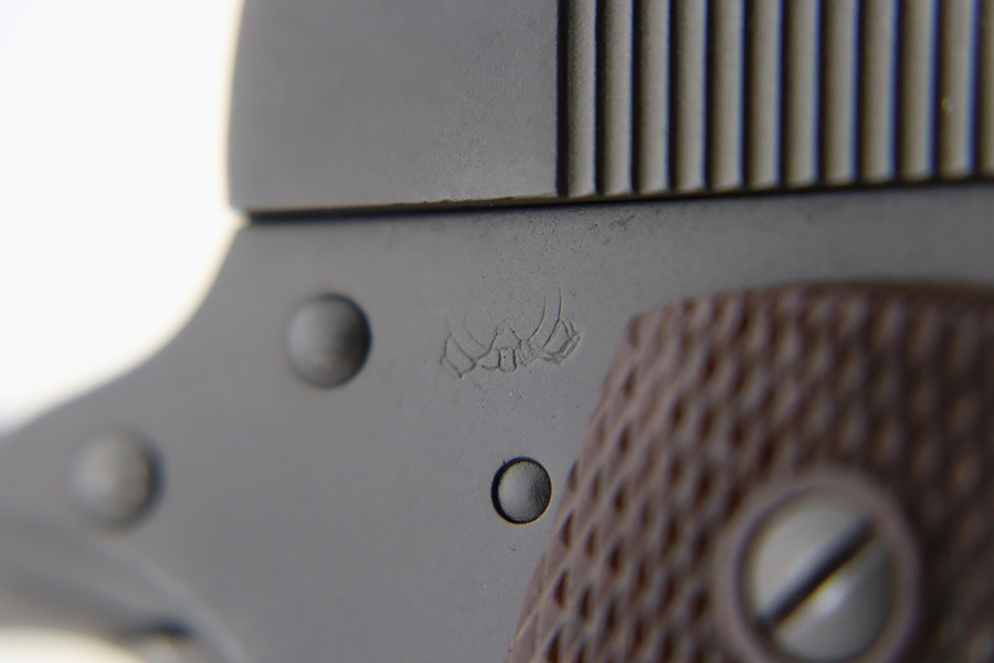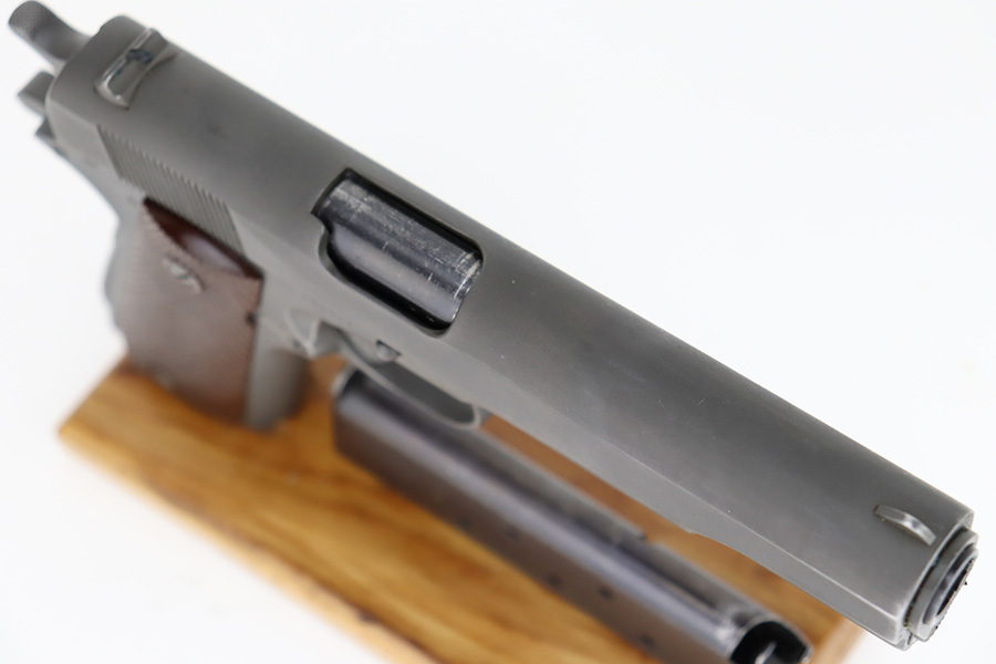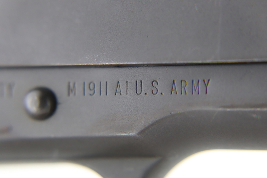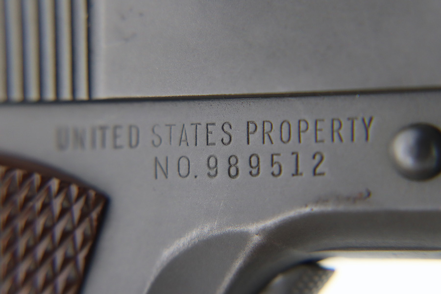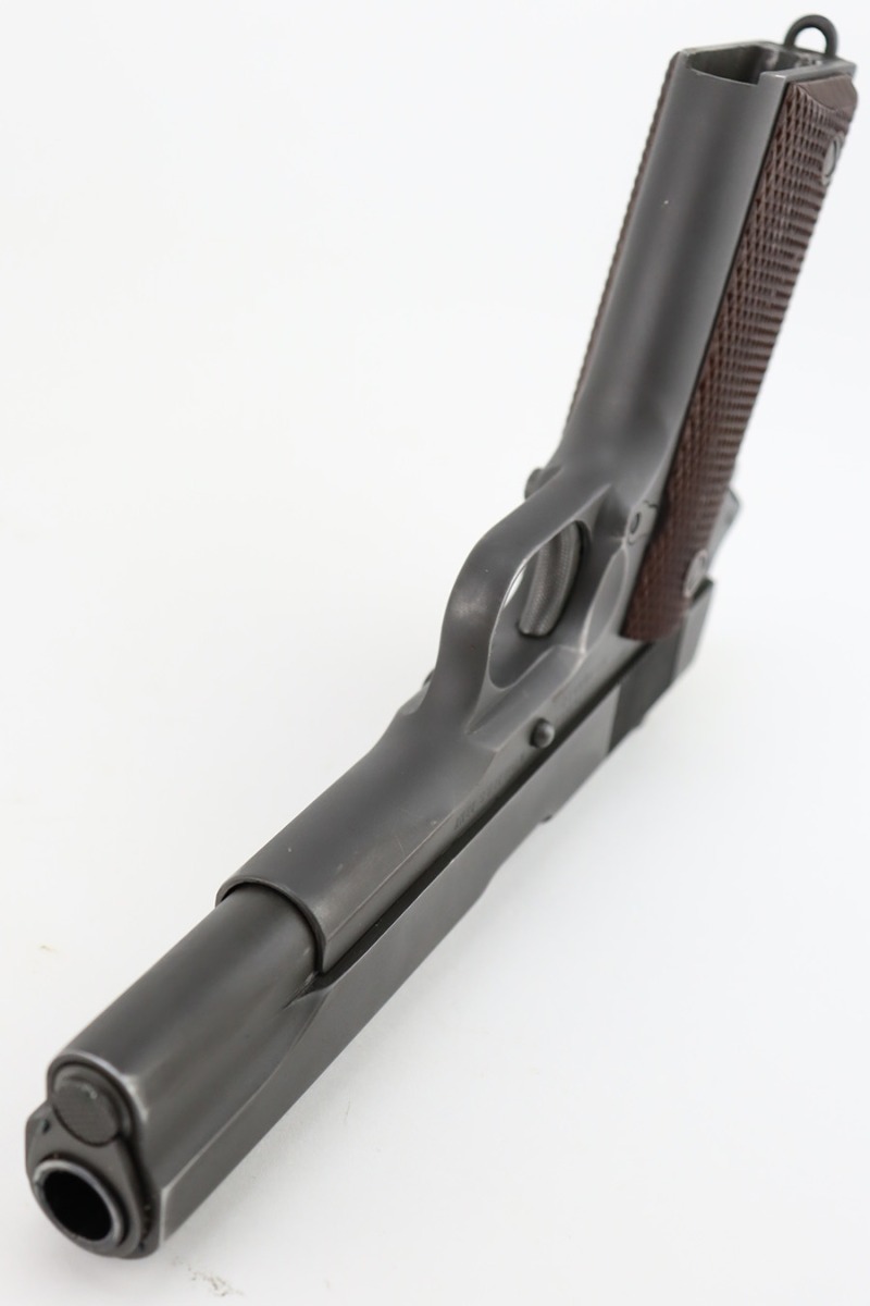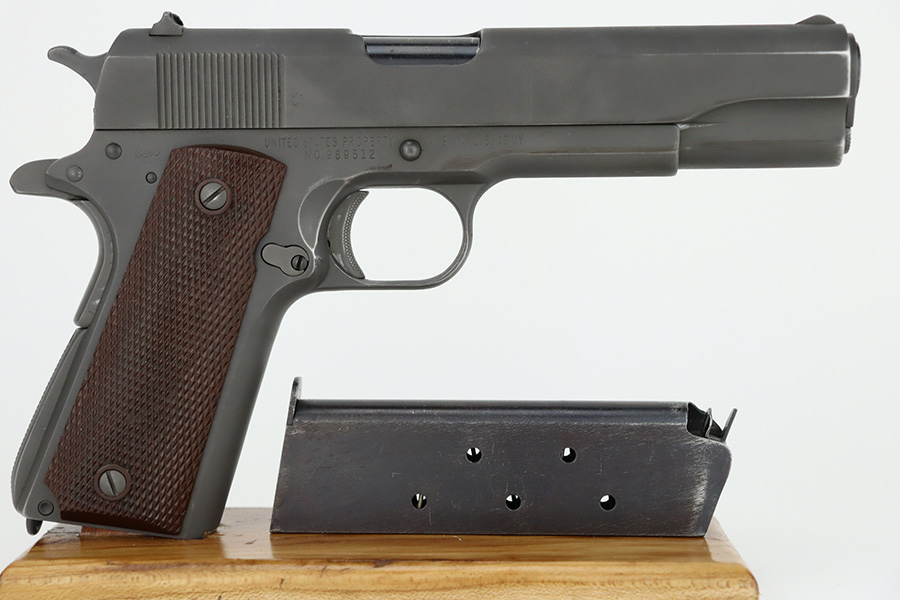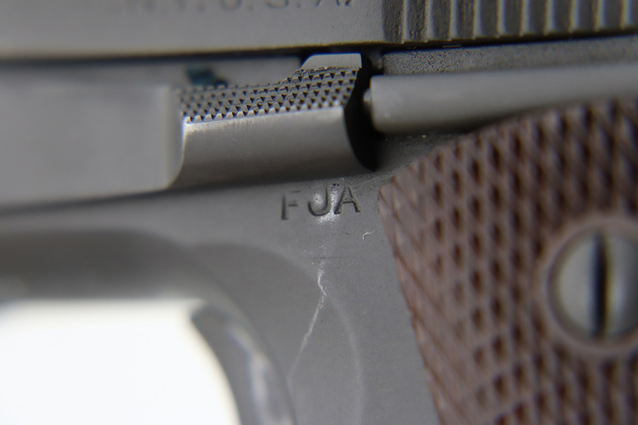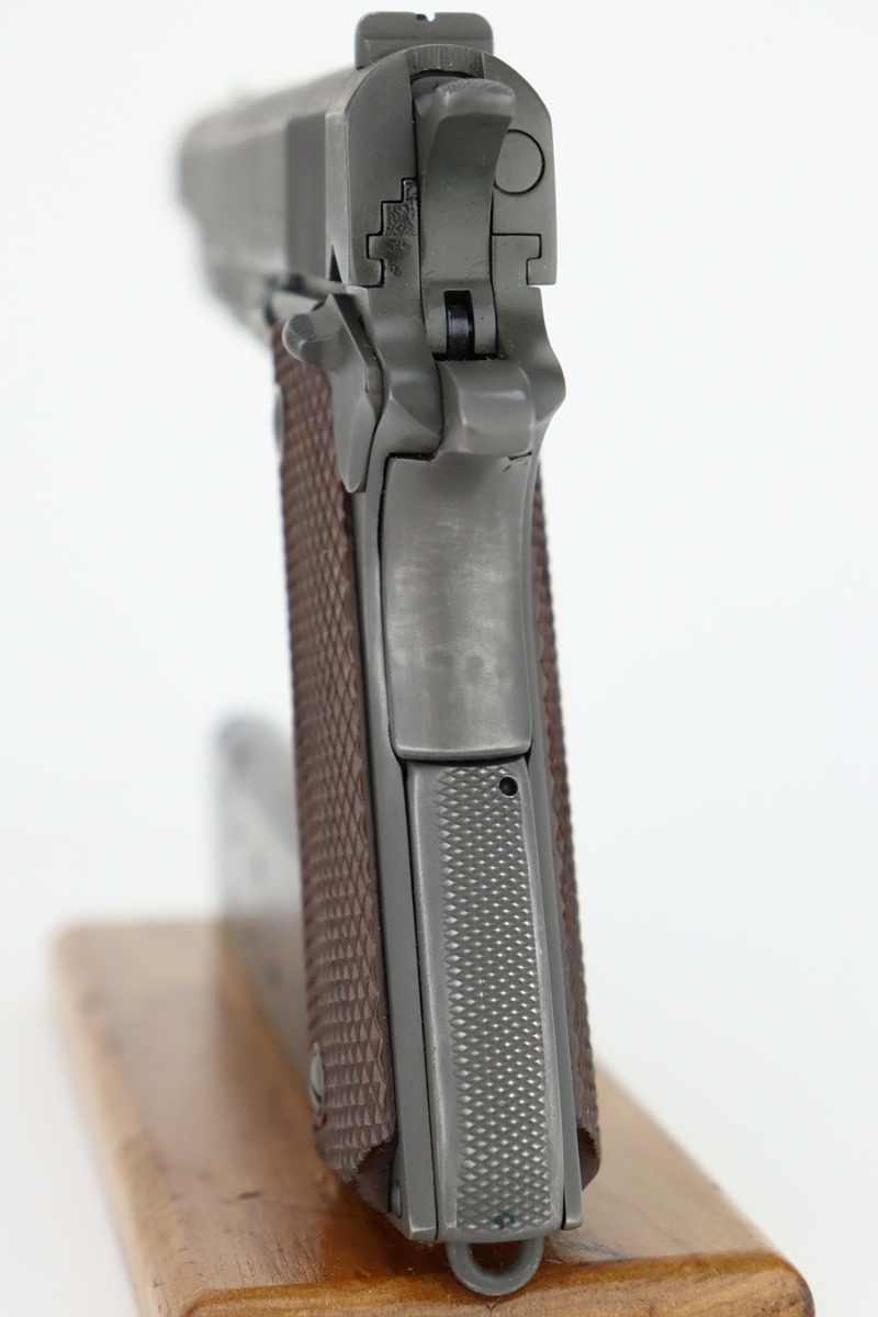 1/5/24 – This is an excellent example of a Remington Rand Model 1911A1 issued to the US military in 1943. It is “United States Property” marked, has a cross-cannon military cartouche, and has the proper “FJA” inspector initials. This one also has a scarce 2nd variation slide and is in the proper serial range for this variation. Correct HS barrel. The gun comes as a rig with one period-correct “L” marked magazine and a nice 1945-dated Boyt holster. The gun itself has been refinished with very little finish loss, just some very minor high edge wear. Fitted with correct reddish plastic grips. Mint bore.