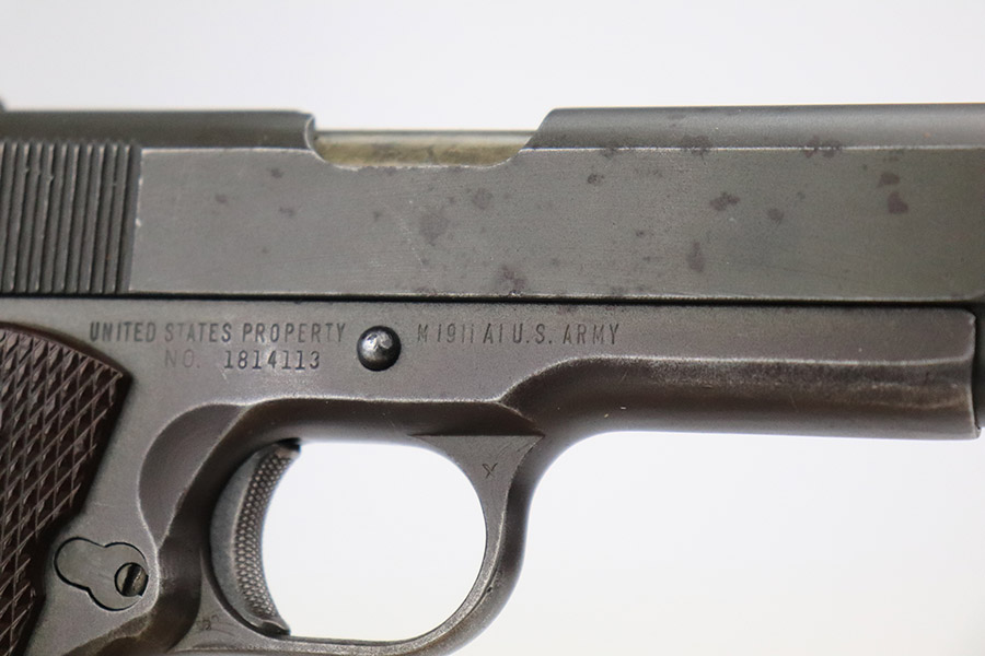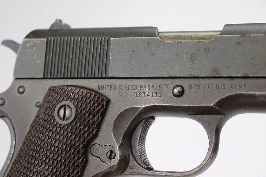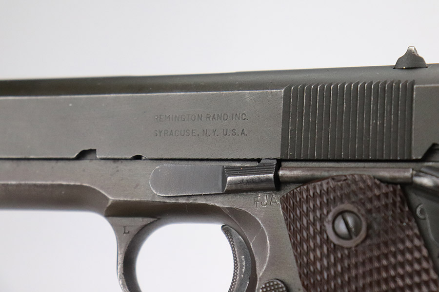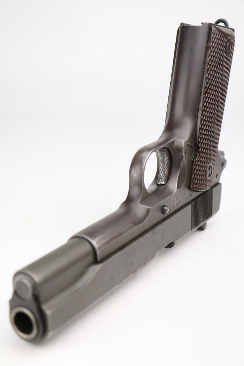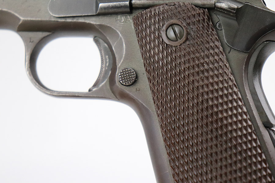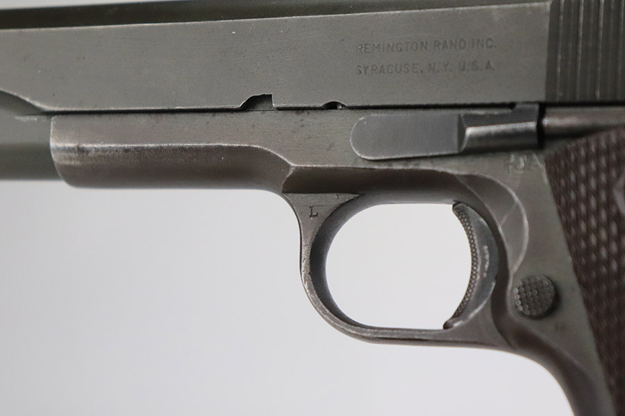 11/15/22 – This is an excellent example of a Remington Rand Model 1911A1 issued to the US military in 1944. It is properly “United States Property”-marked, has the correct “FJA” military inspector proof, and has the proper cross-canon military cartouche on the right side of the frame. High Standard barrel. It has retained about 96-97% of its original parkerized finish. There are areas of minor wear on the high edges of the slide, around the very front edge of the frame, and on the underside of the trigger guard. While there is very little actual finish loss, there is noticeable dark brown patina on the front strap and spotty oxidation on the back strap. There areas of obvious splotchy discoloration on both sides of the gun, most noticeable on the right side. Comes with excellent grips and one proper magazine. The bore is excellent with strong rifling.