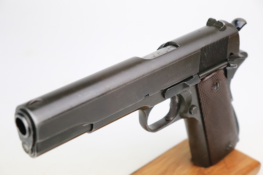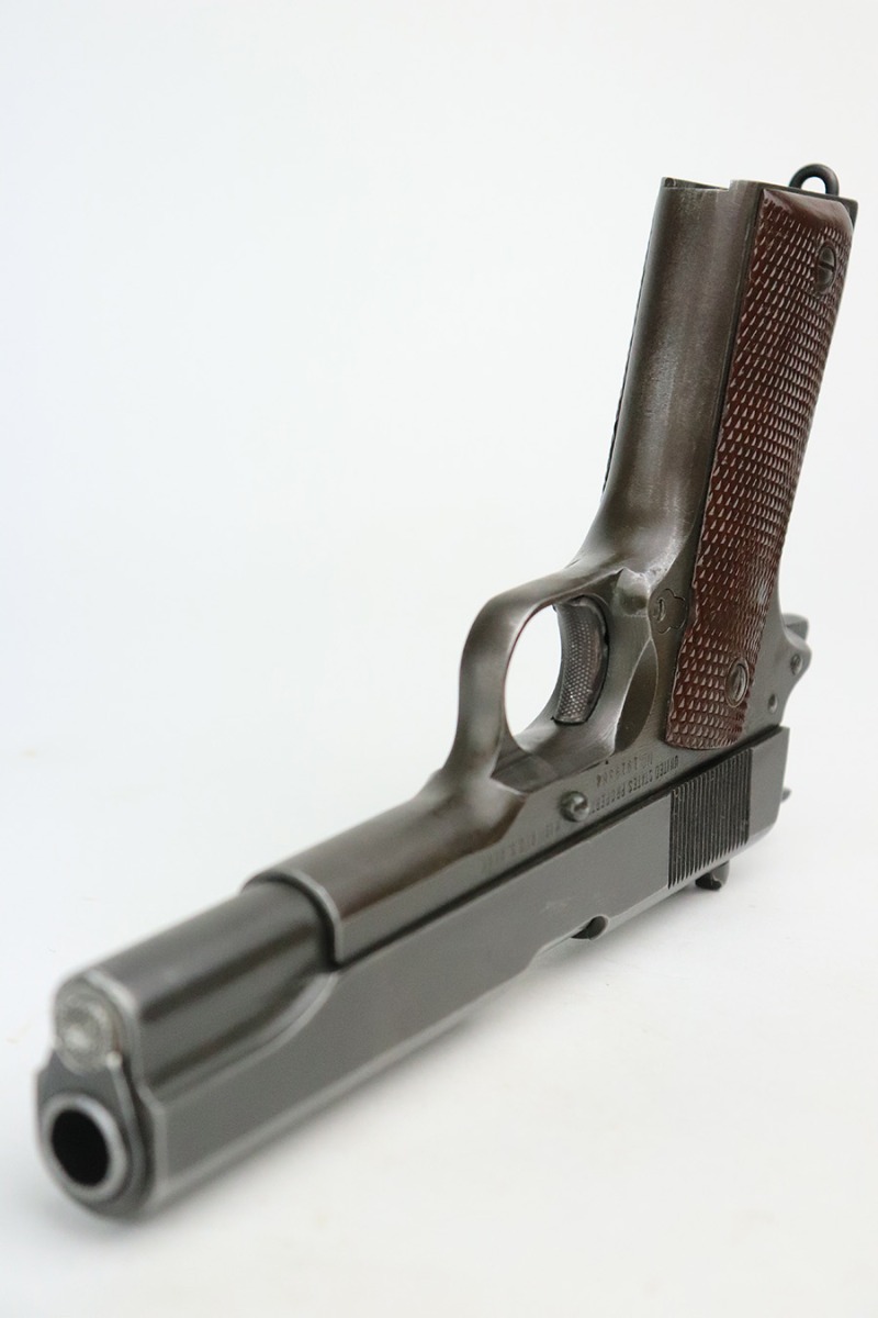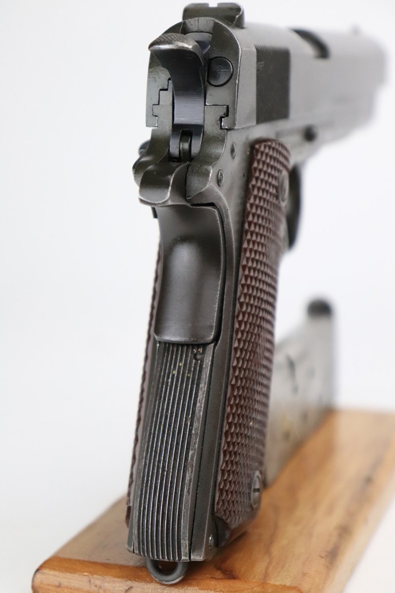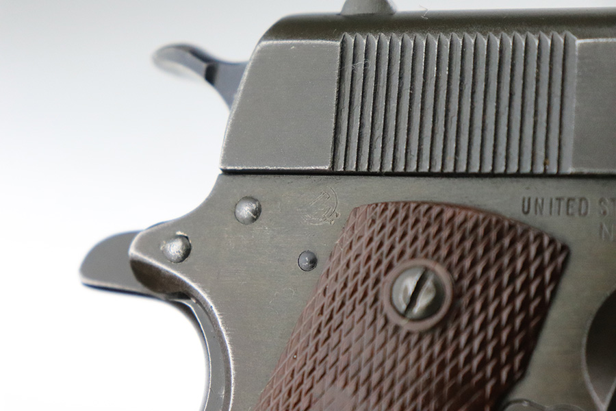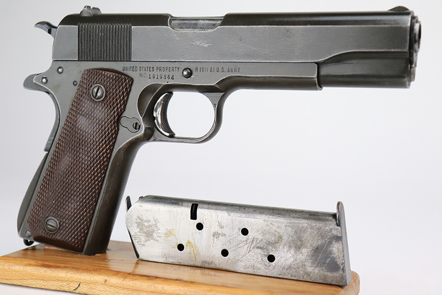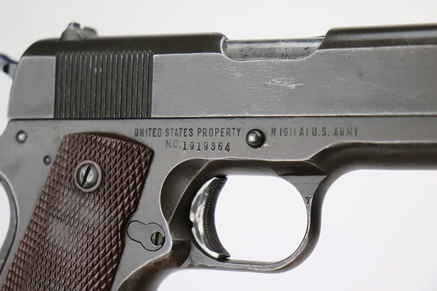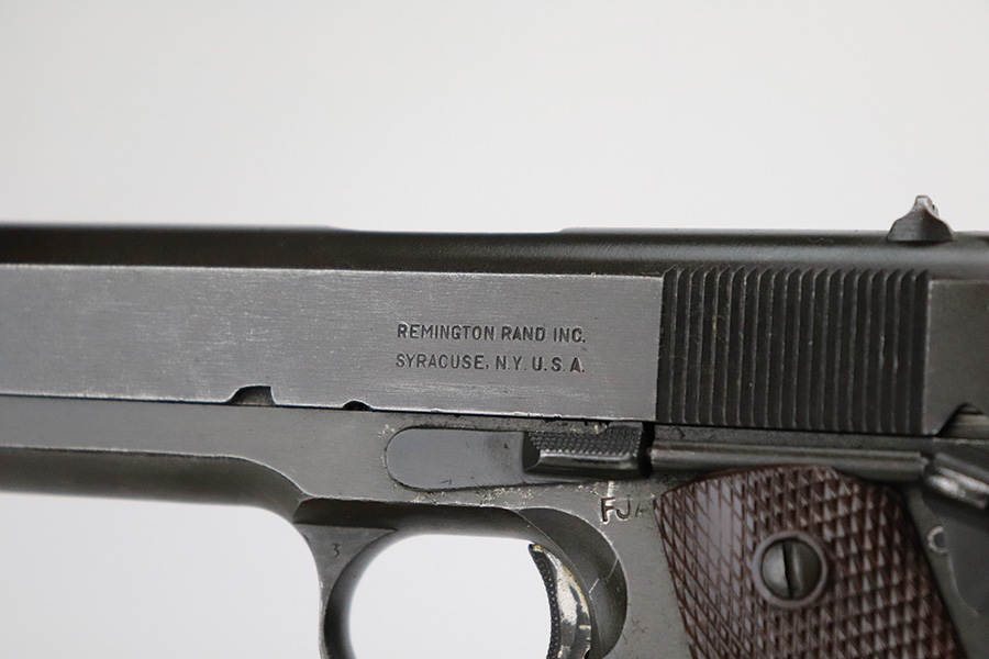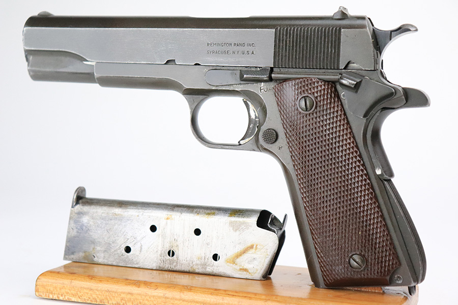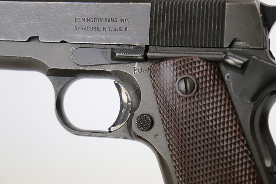 7/17/22 – This is an excellent example of a Remington Rand Model 1911A1 issued to the US military in 1944. It is “United States Property” marked, has a cross-canon military cartouche on the right side of the frame, and has the proper “FJA” inspector initials. Also has a proper High Standard barrel. Overall, the gun has retained about 80% of its original finish. Generally, there is only very minor wear around the high edges in general and very minor thinning on the front strap. While there is very little actual finish loss, there is light brown patina under the finish here and there. Comes with nice period-correct plastic grips (slightly worn on the right side) and a proper “S” marked magazine. The rifling in the bore is a little worn with tiny pits in the grooves.