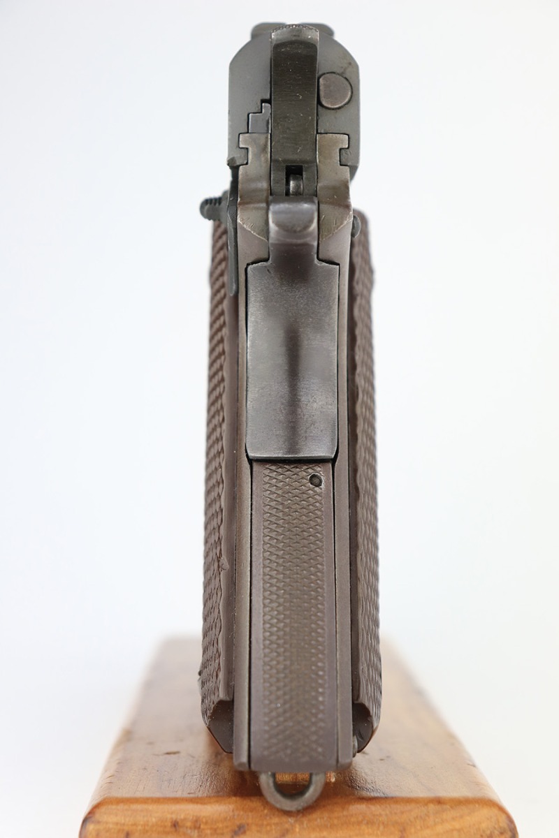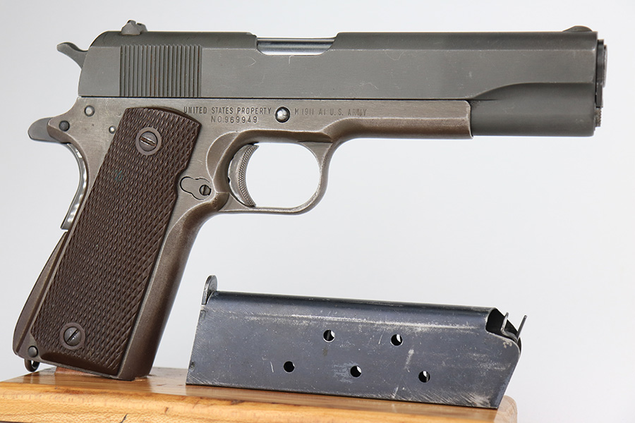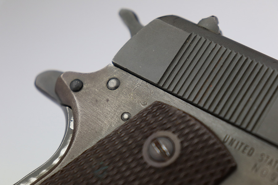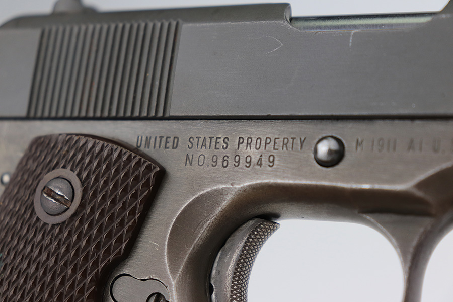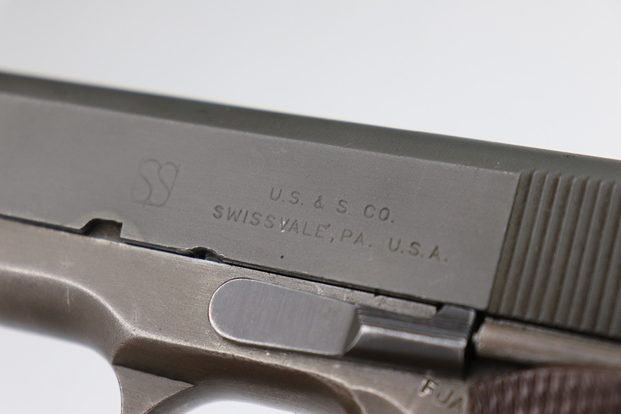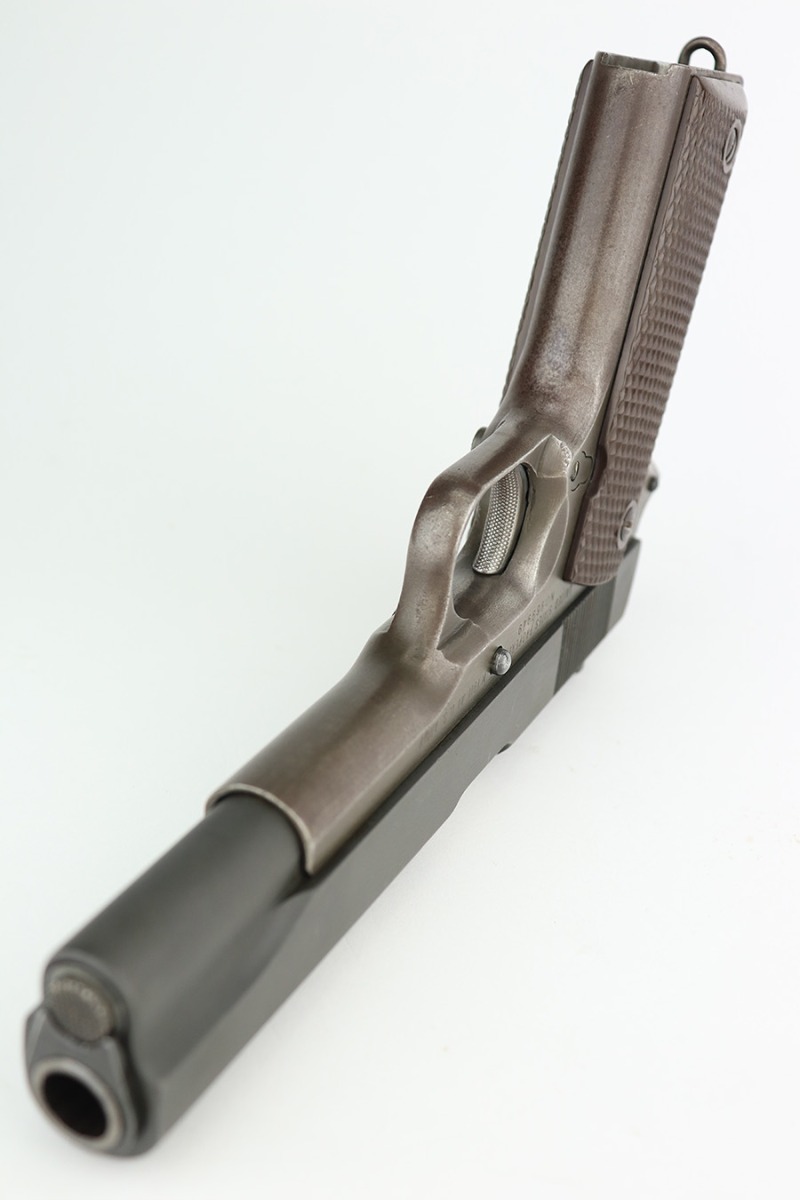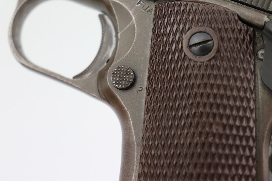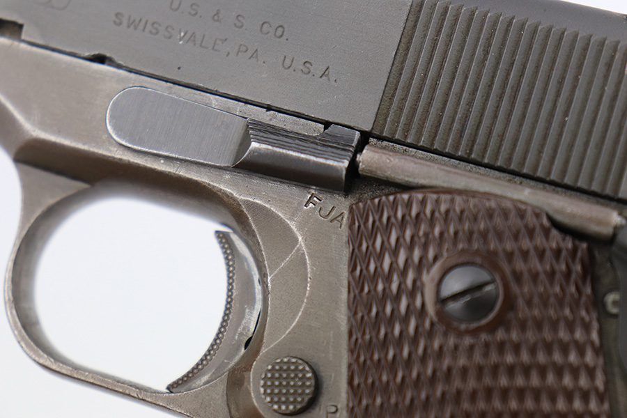 3/7/23 – This is a nice example of a Model 1911A1 put together from a 1942-43 Remington Rand frame and a rare Union Switch & Signal slide. It is “United States Property” marked, has a cross-canon cartouche, and has the proper “FJA” inspector initials. Proper High Standard barrel. The slide has been re-parkerized, so the finish is really nice – just a couple of tiny handling marks on the right side of the slide. There is not much actual finish loss on the frame, but there is noticeable brown patina throughout. Spotty oxidation on the front strap. Fitted a nice set of period-correct reddish plastic grips. Comes with a post-war magazine. The bore is excellent – strong rifling with just a hint of frosting in the grooves.