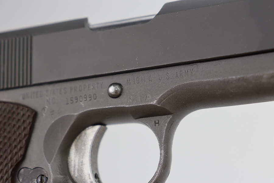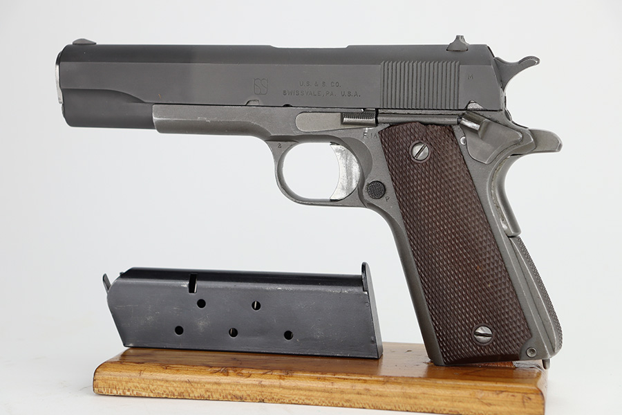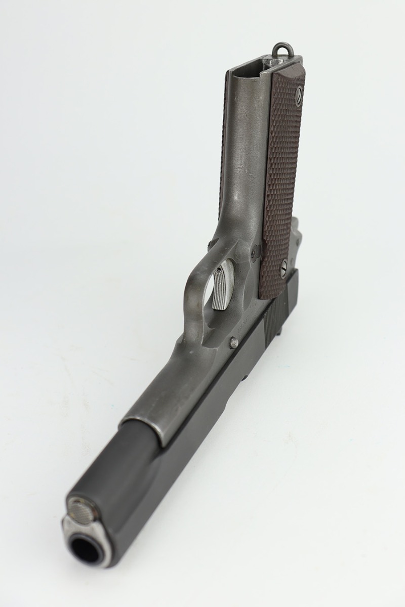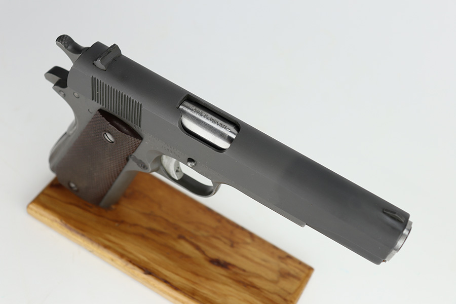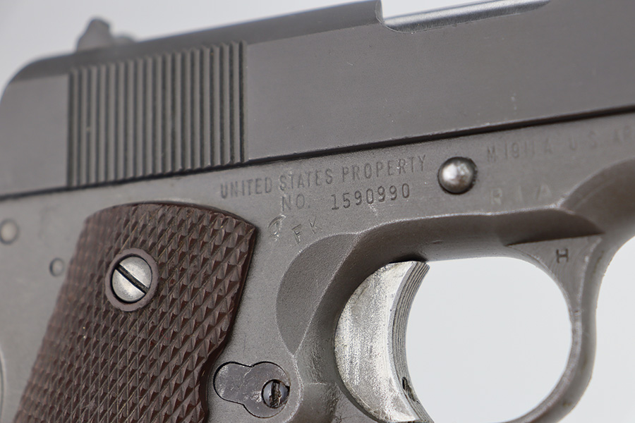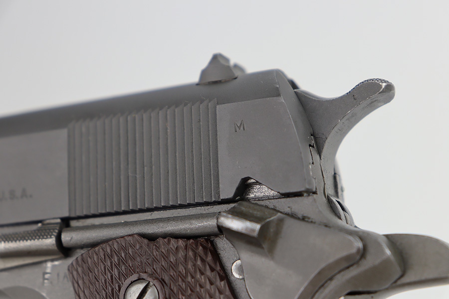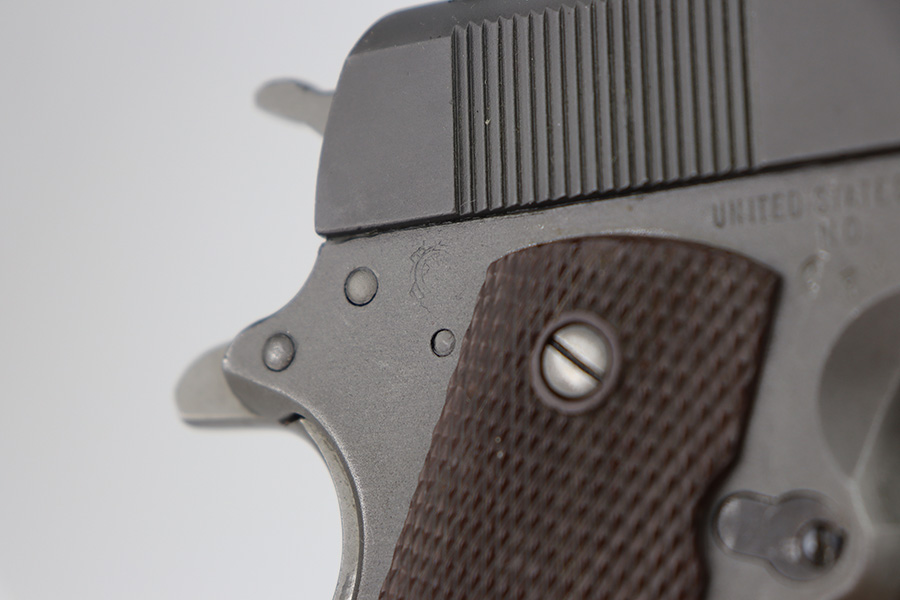 11/17/23 – This is a mixed-parts 1911A1 from WW2. It has a Remington frame from late 1943 with RIA and flaming bomb rework marks, while the slide is a scarce Union Switch & Signal example that has been parkerized. Postwar barrel with minty bore. Nice wartime grips with a minor chip on the top of the left panel. NM marked barrel bushing.