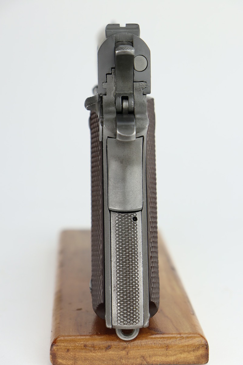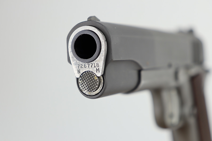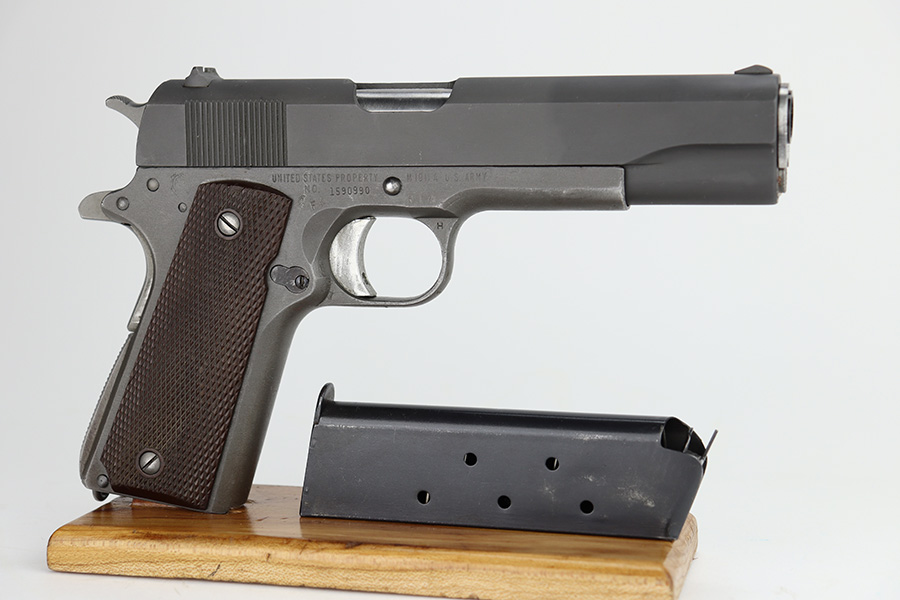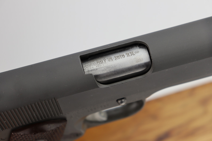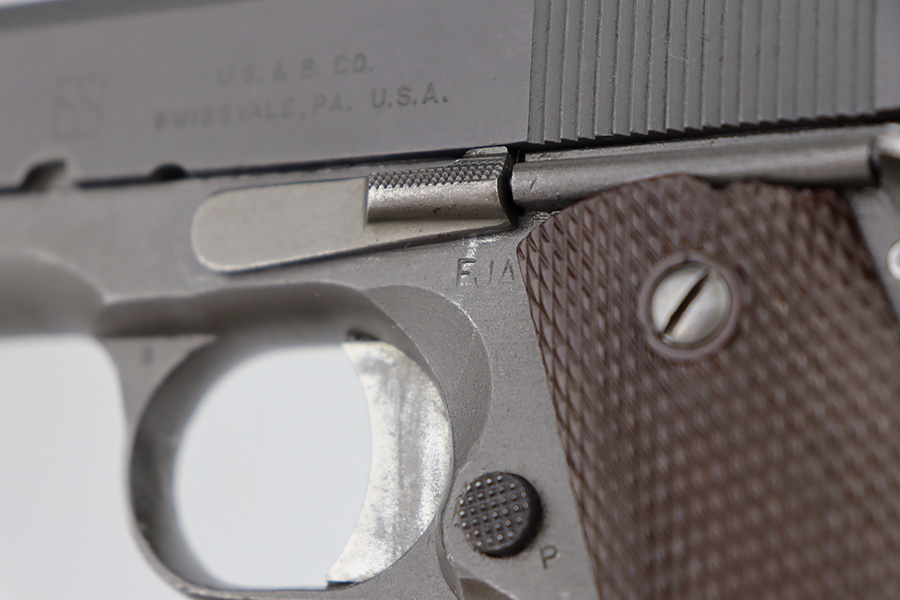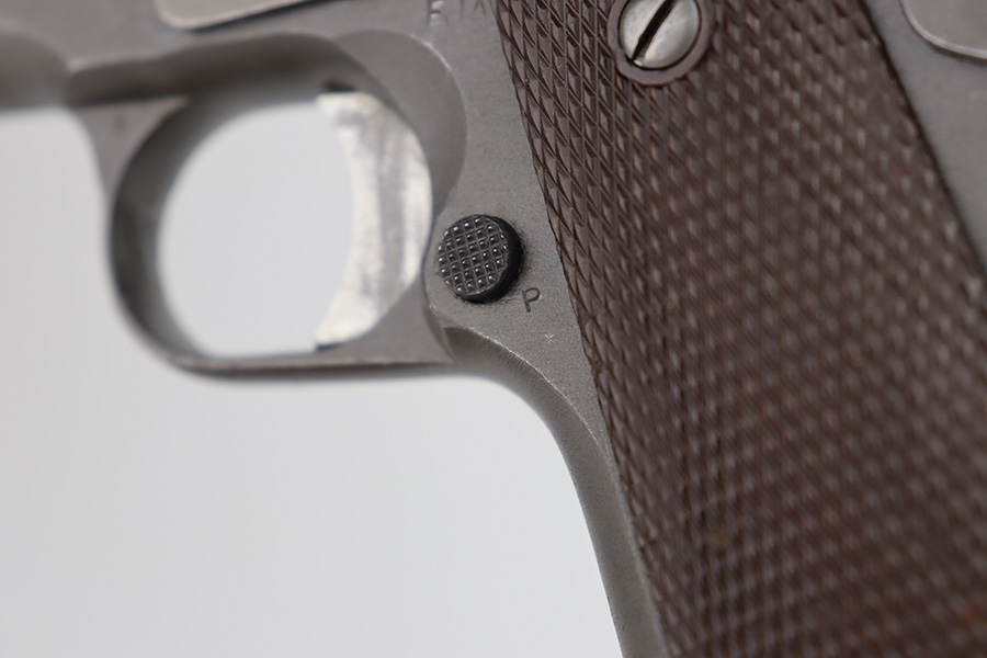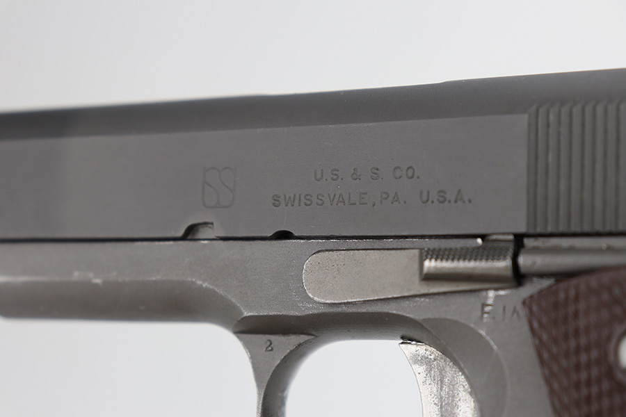 11/17/23 – This is a mixed-parts 1911A1 from WW2. It has a Remington frame from late 1943 with RIA and flaming bomb rework marks, while the slide is a scarce Union Switch & Signal example that has been parkerized. Postwar barrel with minty bore. Nice wartime grips with a minor chip on the top of the left panel. NM marked barrel bushing.