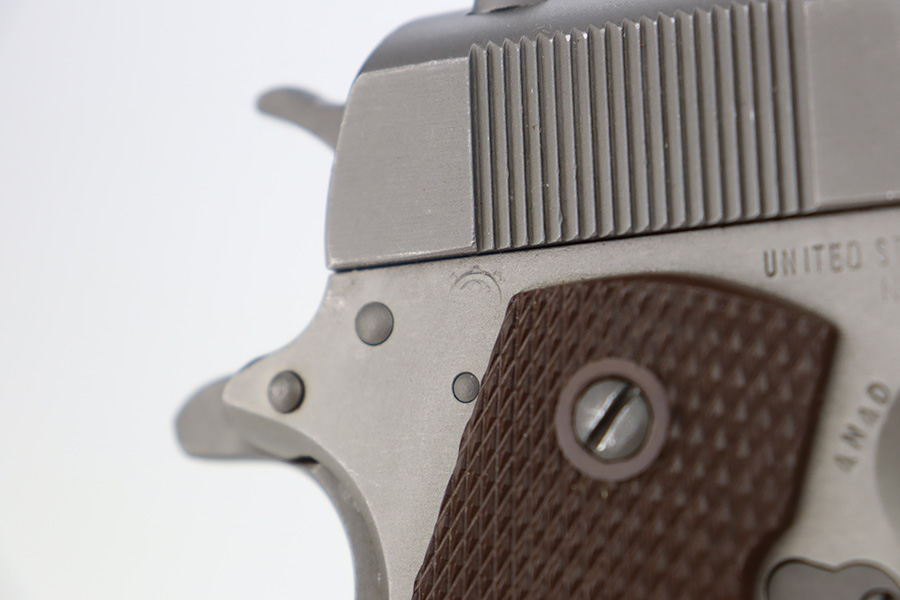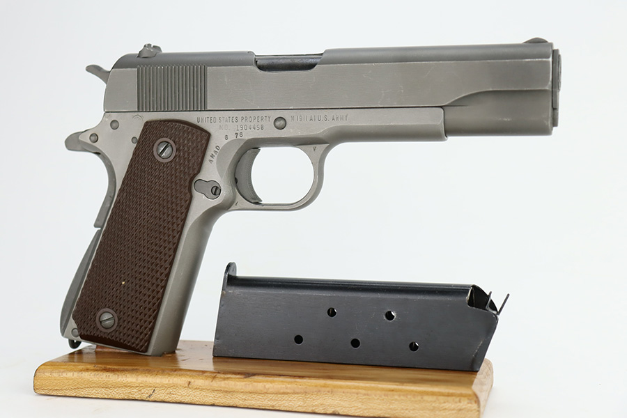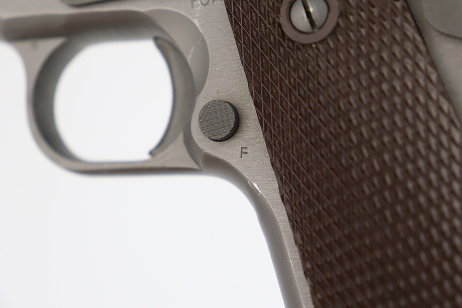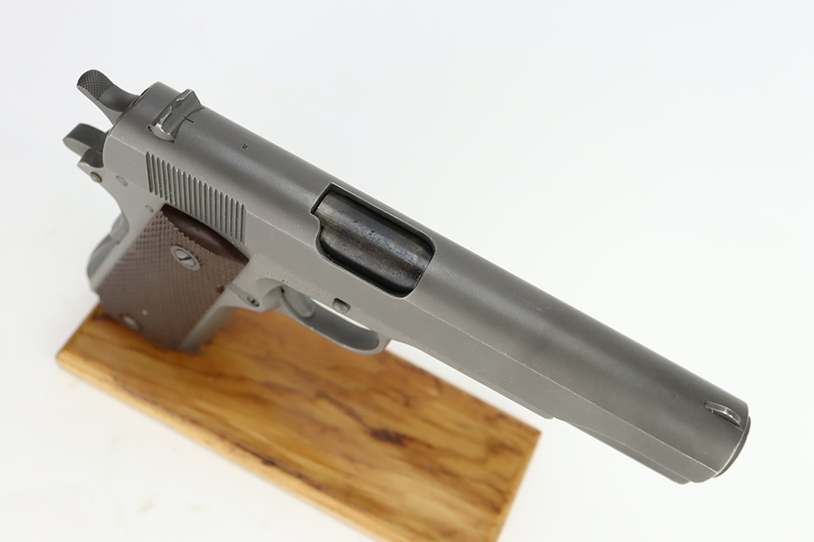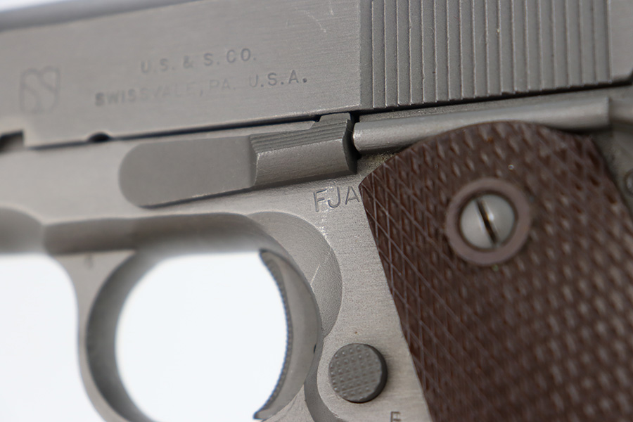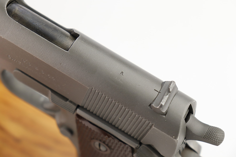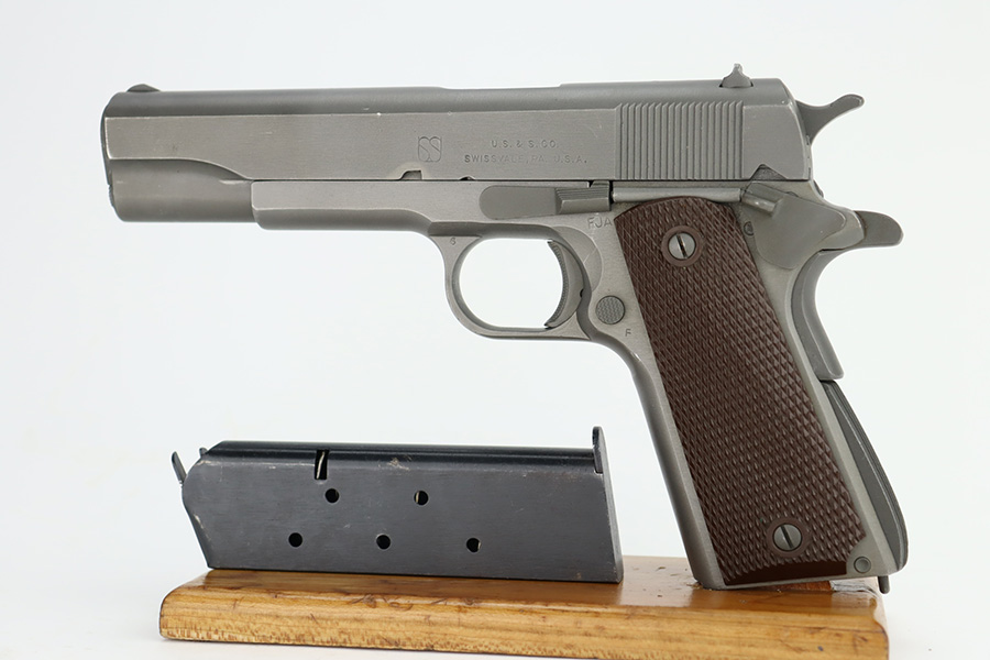 11/29/23 – This is an arsenal refurbished 1911A1 from WW2. It has a Remington frame from 1944 with ANAD (Anniston Army Depot) rework marks, while the slide is a scarce Union Switch & Signal example that has been parkerized. Wartime Colt barrel with small ‘F’ under lug. Unfortunately, this barrel is nearly shot out so the buyer would want to use an aftermarket replacement if they intend to fire this pistol. Excellent grips with sharp checkering. Risdon mag.