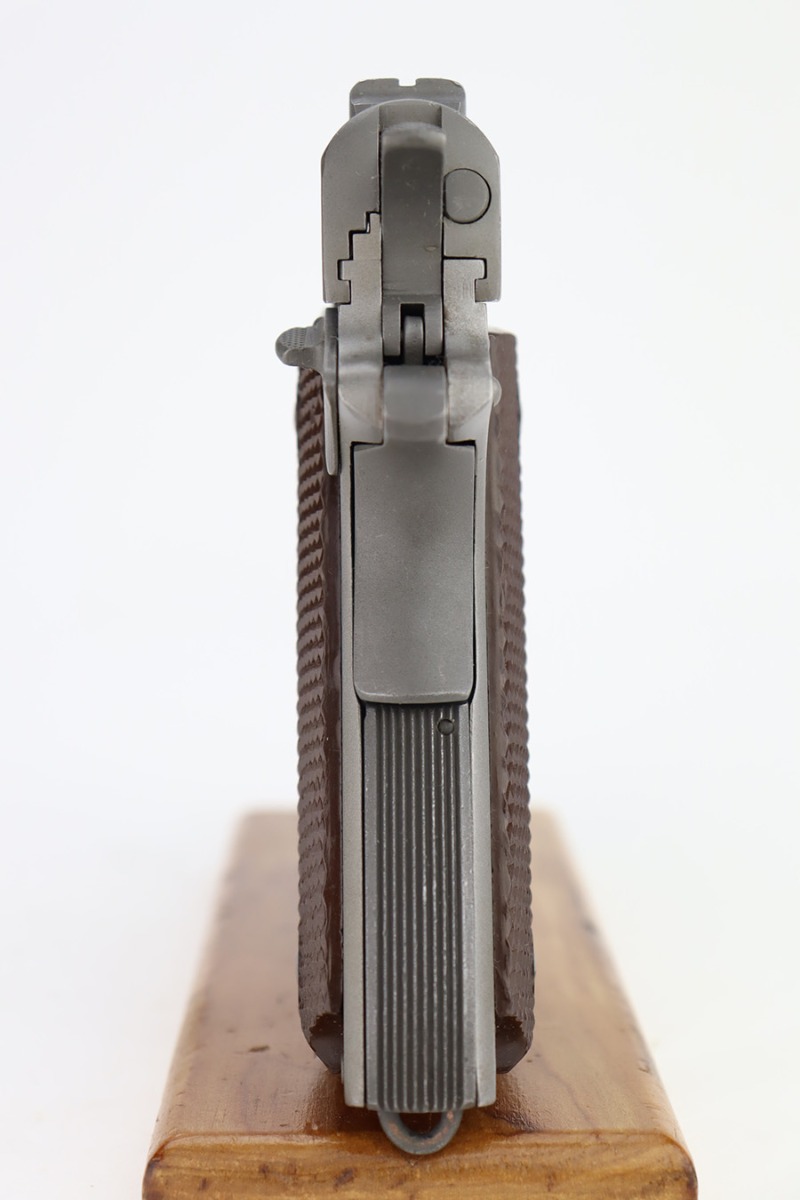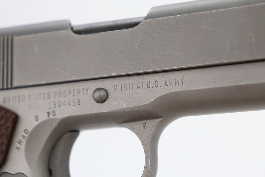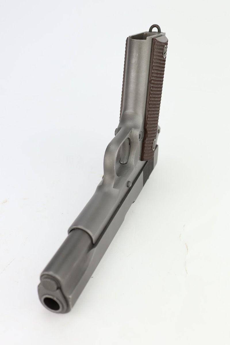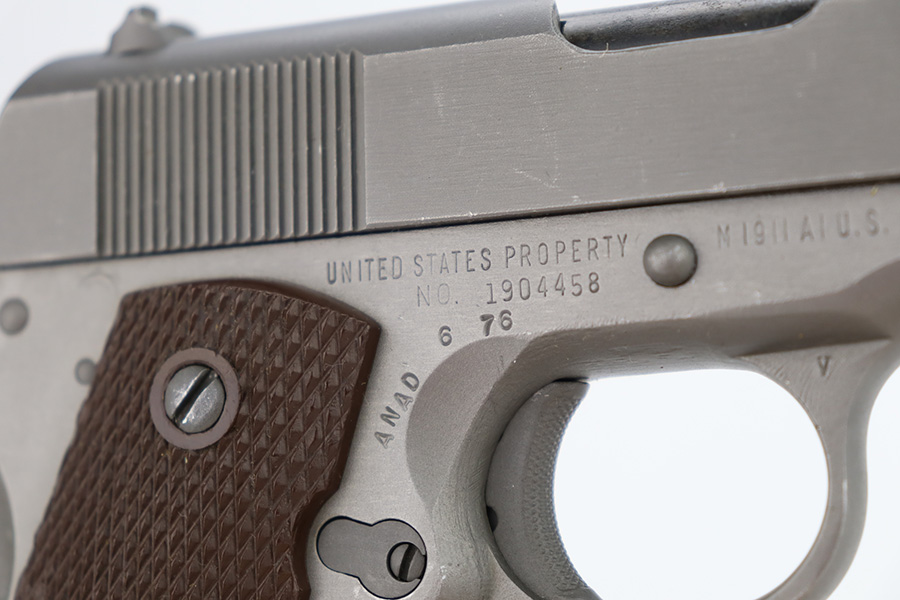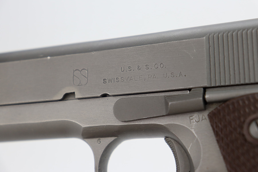 11/29/23 – This is an arsenal refurbished 1911A1 from WW2. It has a Remington frame from 1944 with ANAD (Anniston Army Depot) rework marks, while the slide is a scarce Union Switch & Signal example that has been parkerized. Wartime Colt barrel with small ‘F’ under lug. Unfortunately, this barrel is nearly shot out so the buyer would want to use an aftermarket replacement if they intend to fire this pistol. Excellent grips with sharp checkering. Risdon mag.