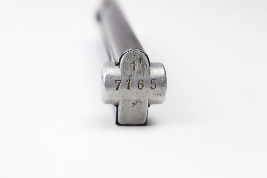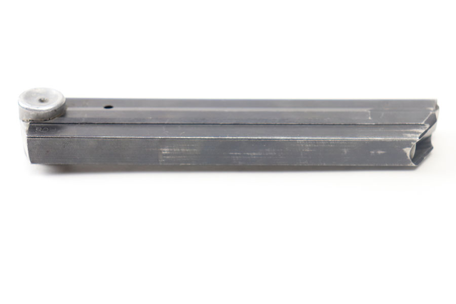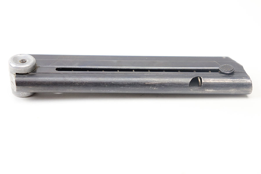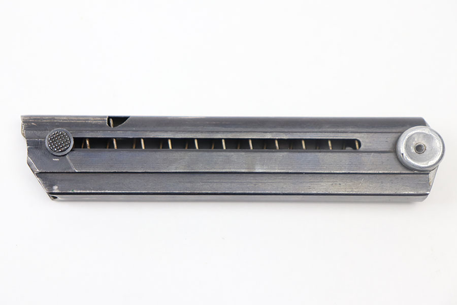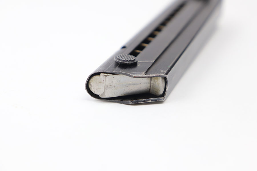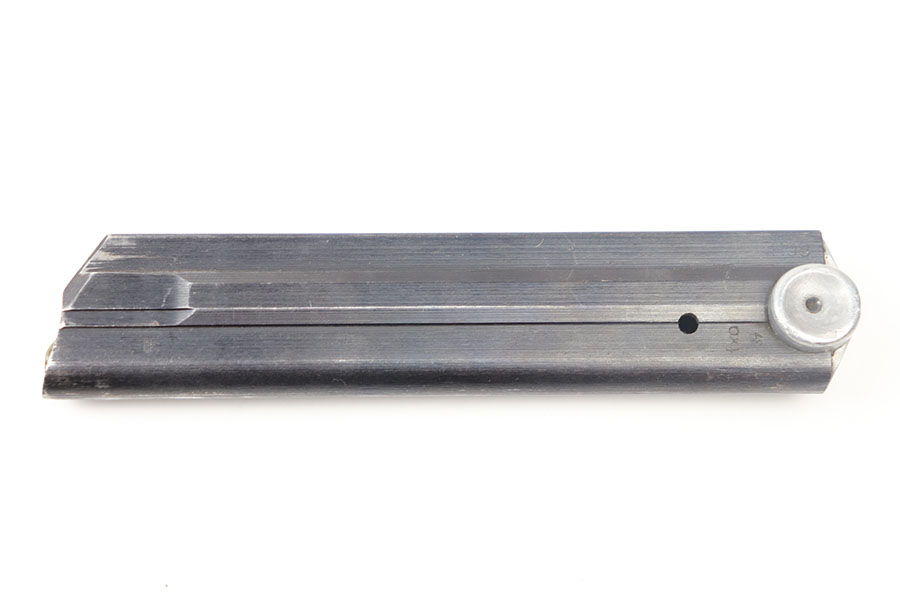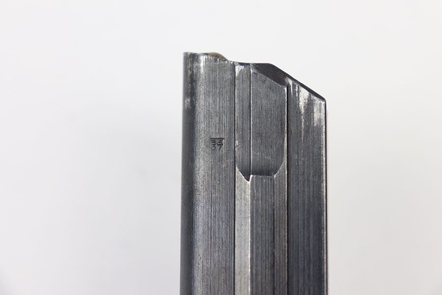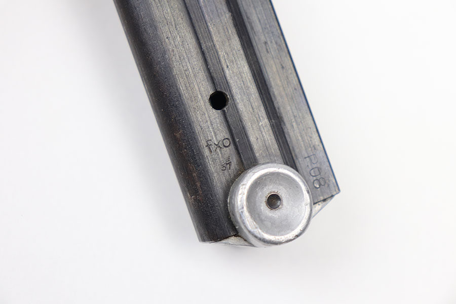 6/17/21 – This is an original WW2 era luger magazine that has had the base renumbered. The tube is blued and stamped “FXO” with two eagle 37 proof stamps from the Haenel factory. Excellent overall condition with a strong fully functional spring.
