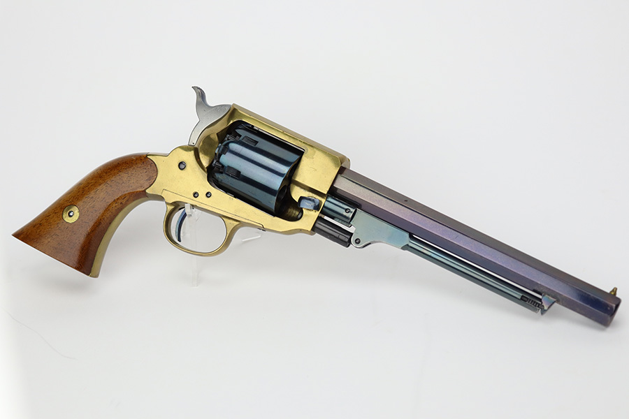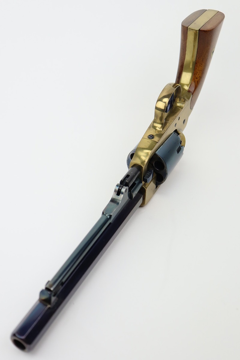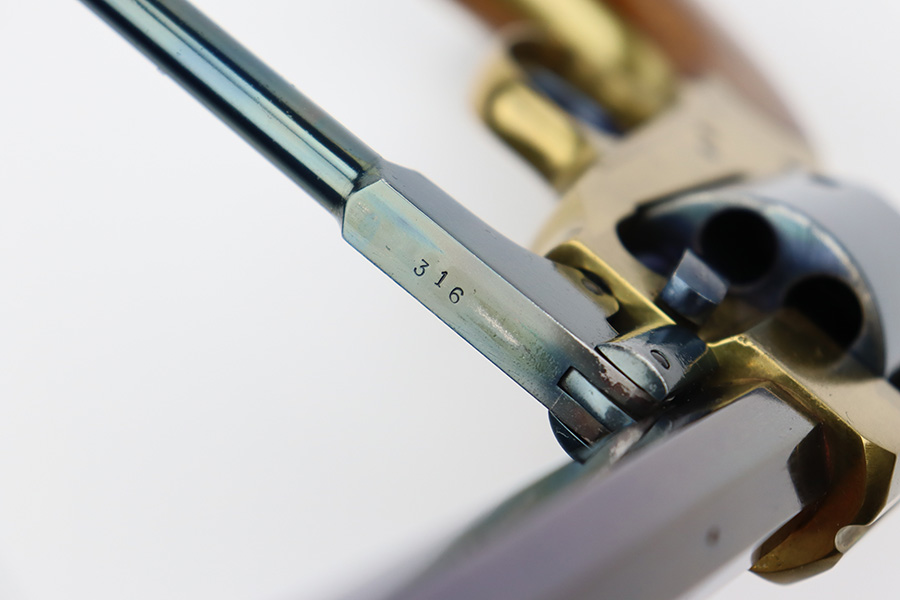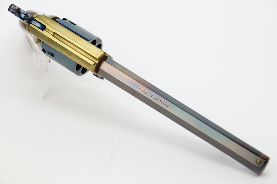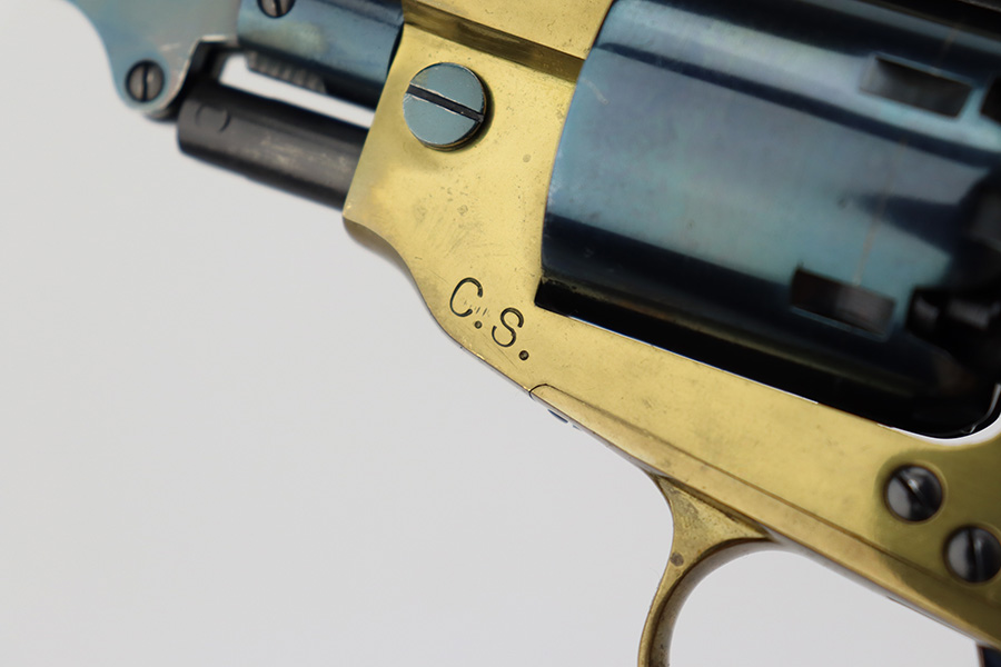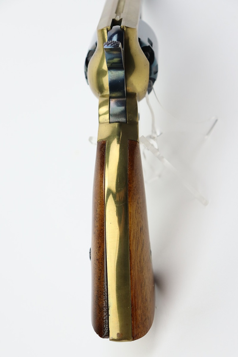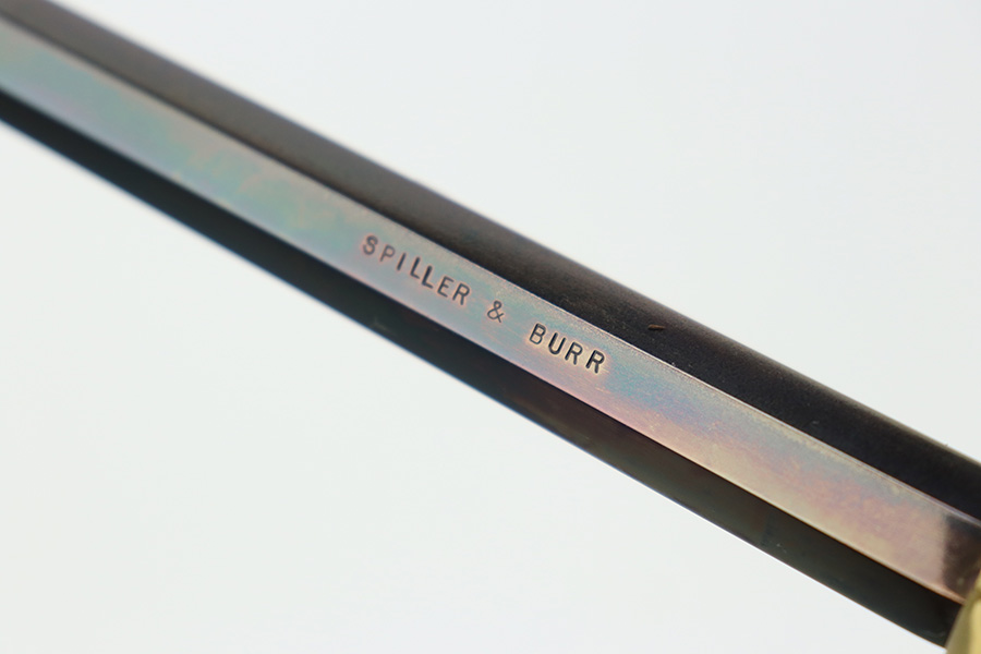 10/26/23 – This is a high quality Spiller & Burr replica single action army revolver from the civil war era. Excellent condition with some light handling wear and thinning to the finish on the cylinder and barrel, we rate around 95% overall. Smooth action, excellent timing and lockup. Brass frame and nice walnut wood grips. The frame is stamped “CS” to replicate the look of a Confederate States revolver. Maker stamped on the top of the cylinder. Matching numbered 316 on the plunger, wedge, and underside of the barrel. Very nice, shiny bore with strong rifling. .36 caliber cap & ball percussion. 6.5 inch barrel. No FFL required.