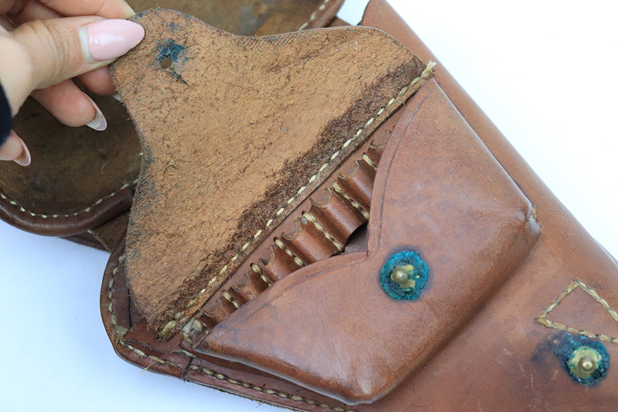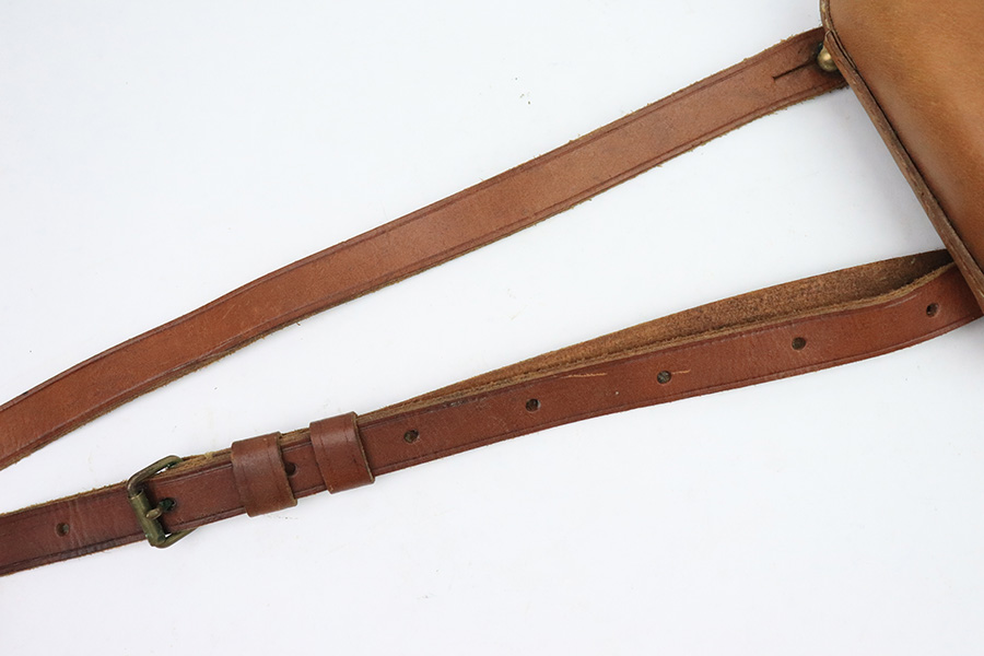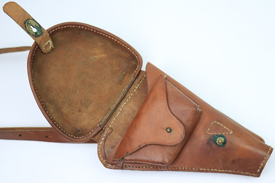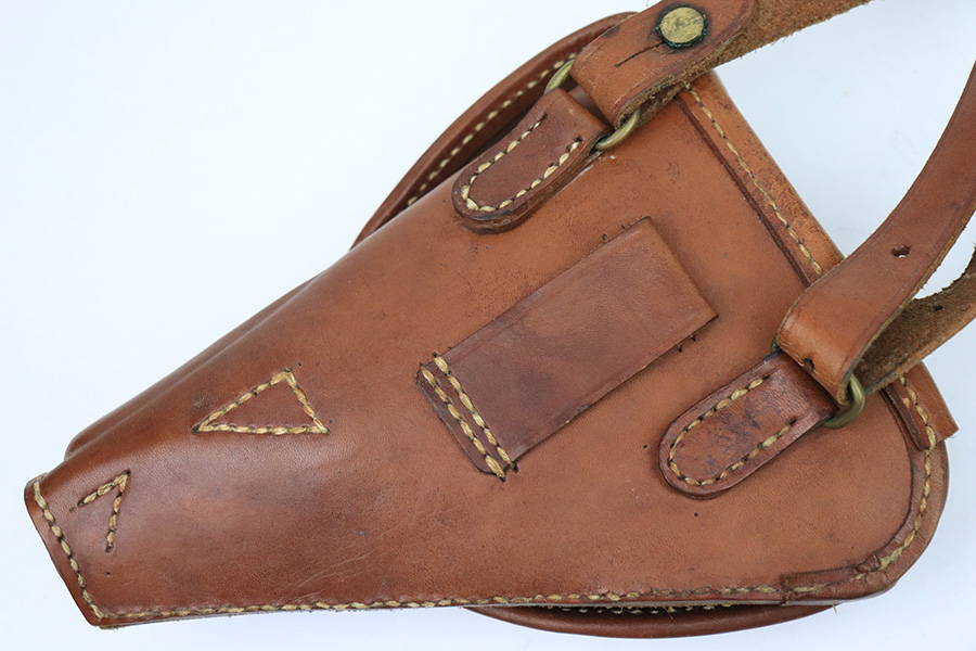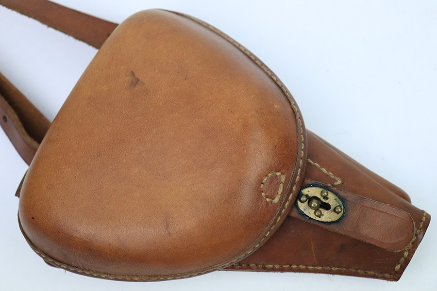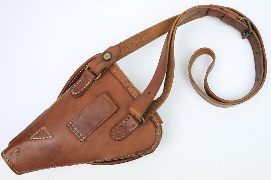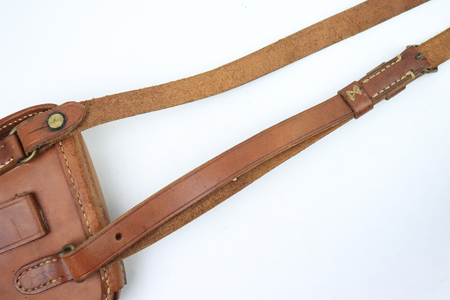 12/13/22 – This is an excellent condition, high quality reproduction leather baby Nambu holster. Makes a great place-holder as the originals are extremely scarce. This example features brass fittings and leather that has an aged look. Excellent condition with no leather issues throughout the holster and shoulder strap. No stitching issues either.