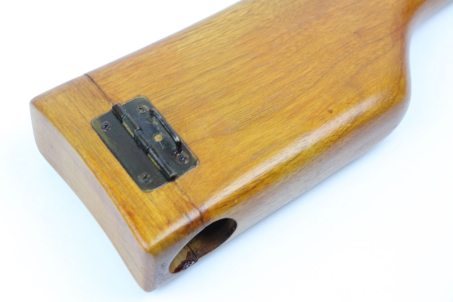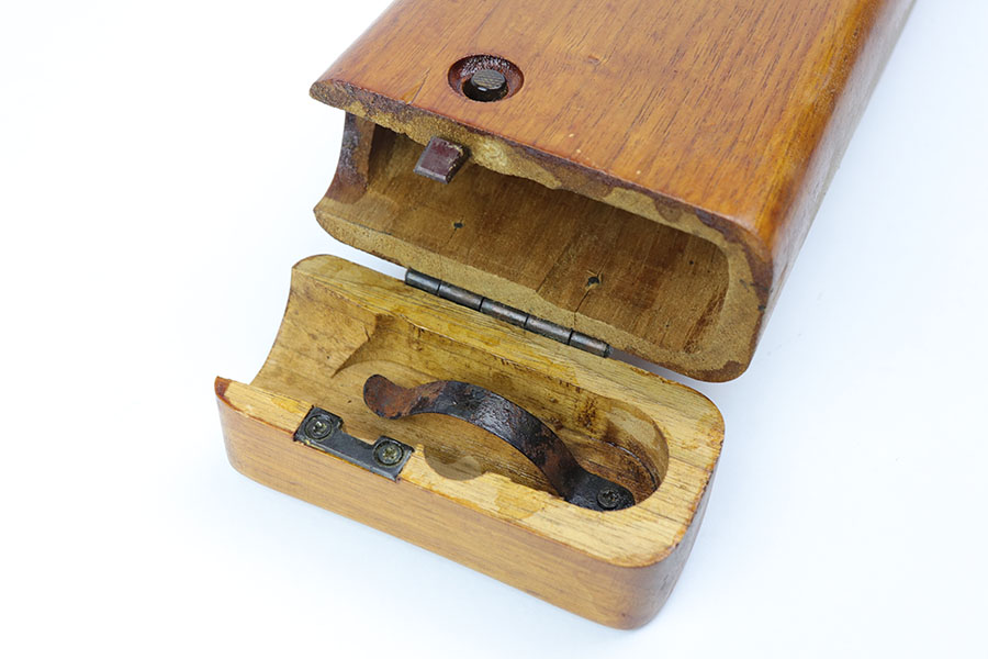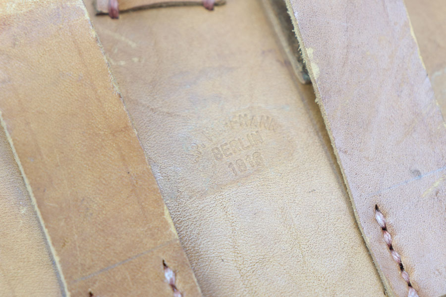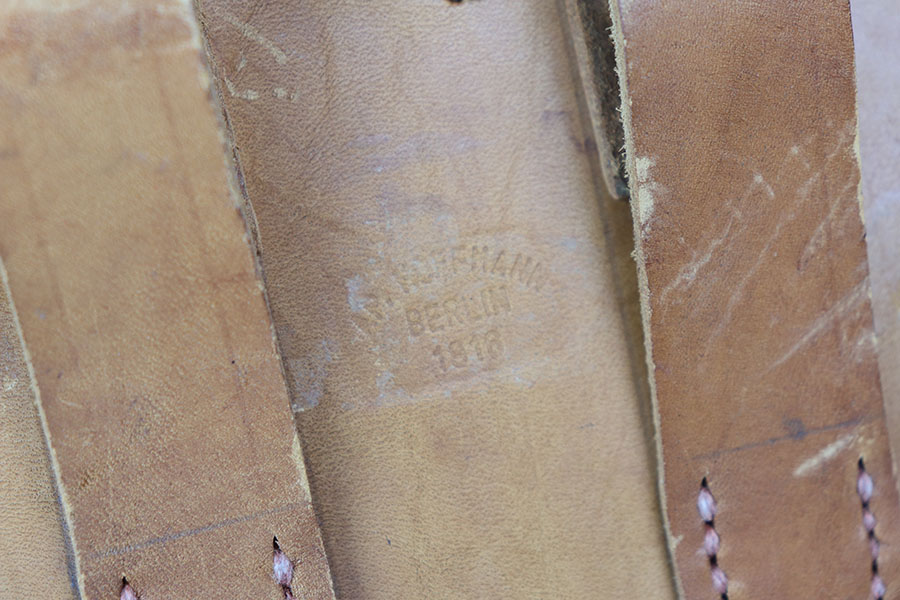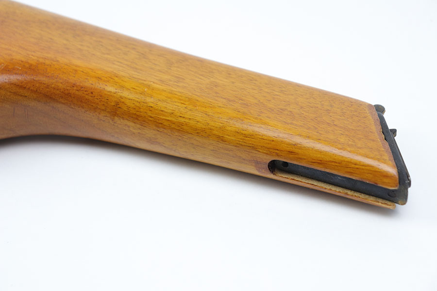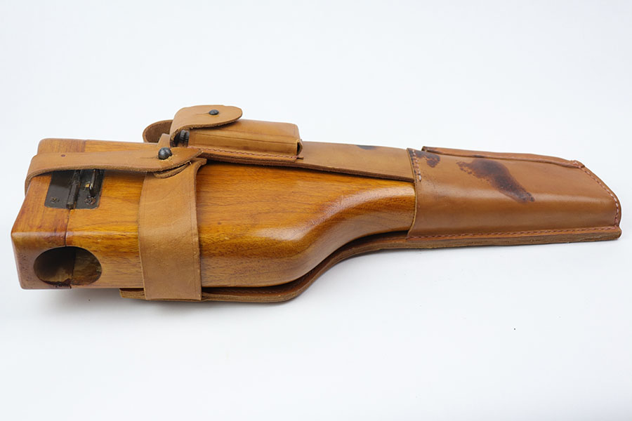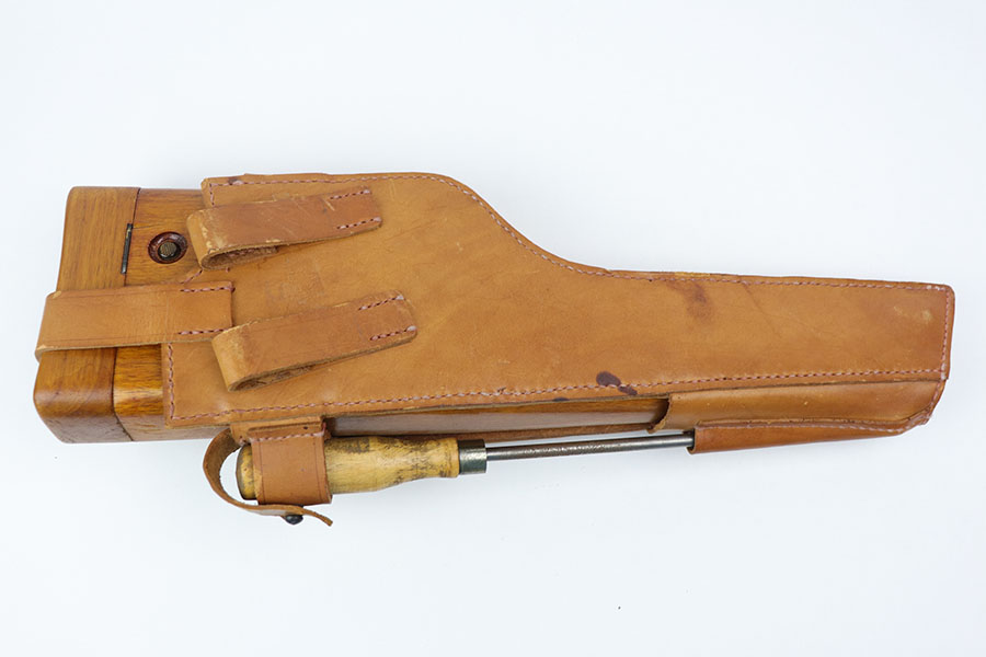 10/15/20 – This is an excellent reproduction C96 stock, leather harness, and cleaning rod. The stock is unmarked with clean, excellent wood. No cracks or chips. Strong leather is stamped with a fake maker and 1915 date stamp. Some surface cracking on the closure loop but no major damage. Cleaning rod is in good condition. Makes for an excellent placeholder or display with your C96.